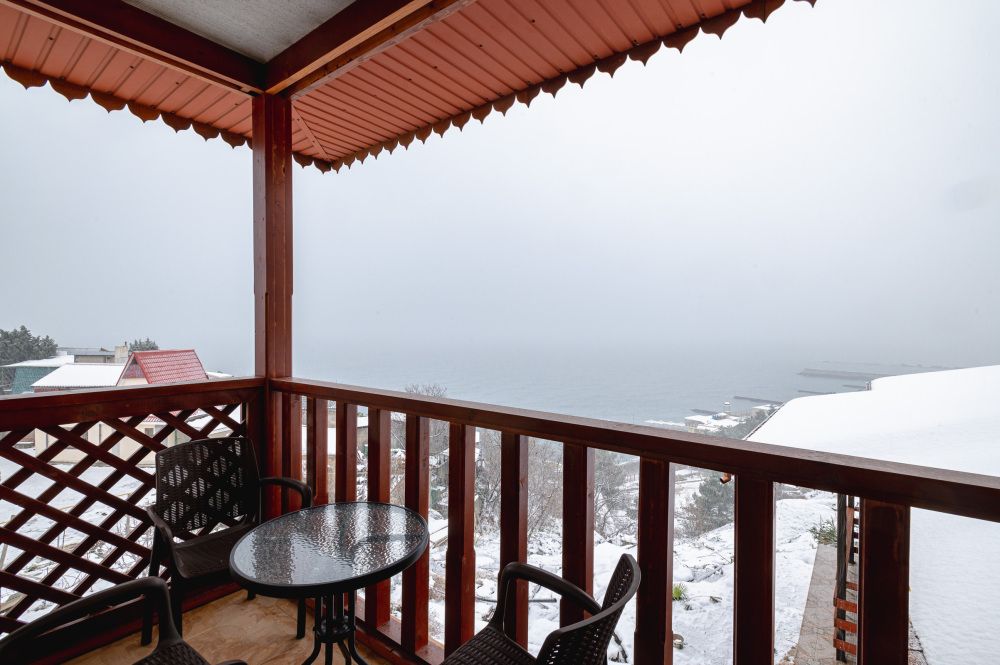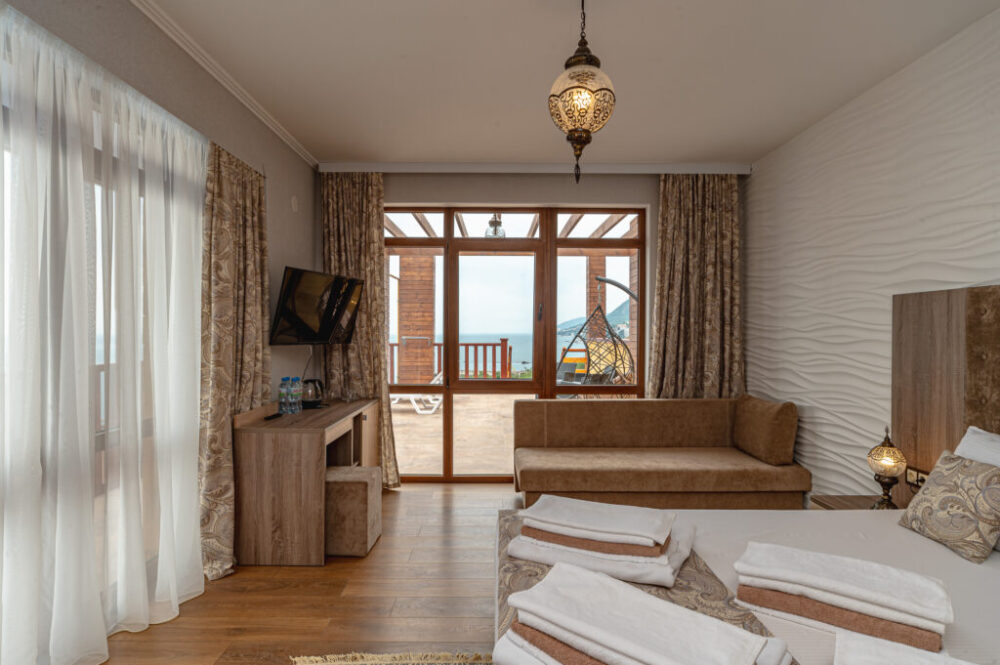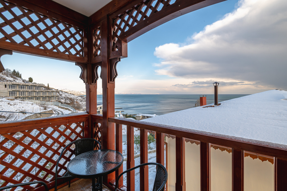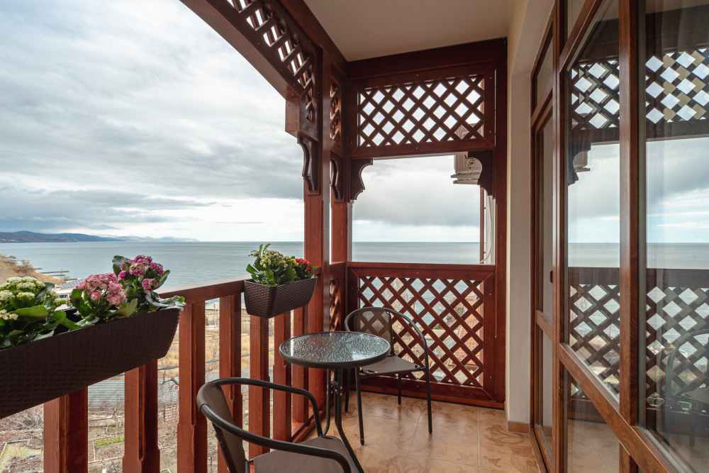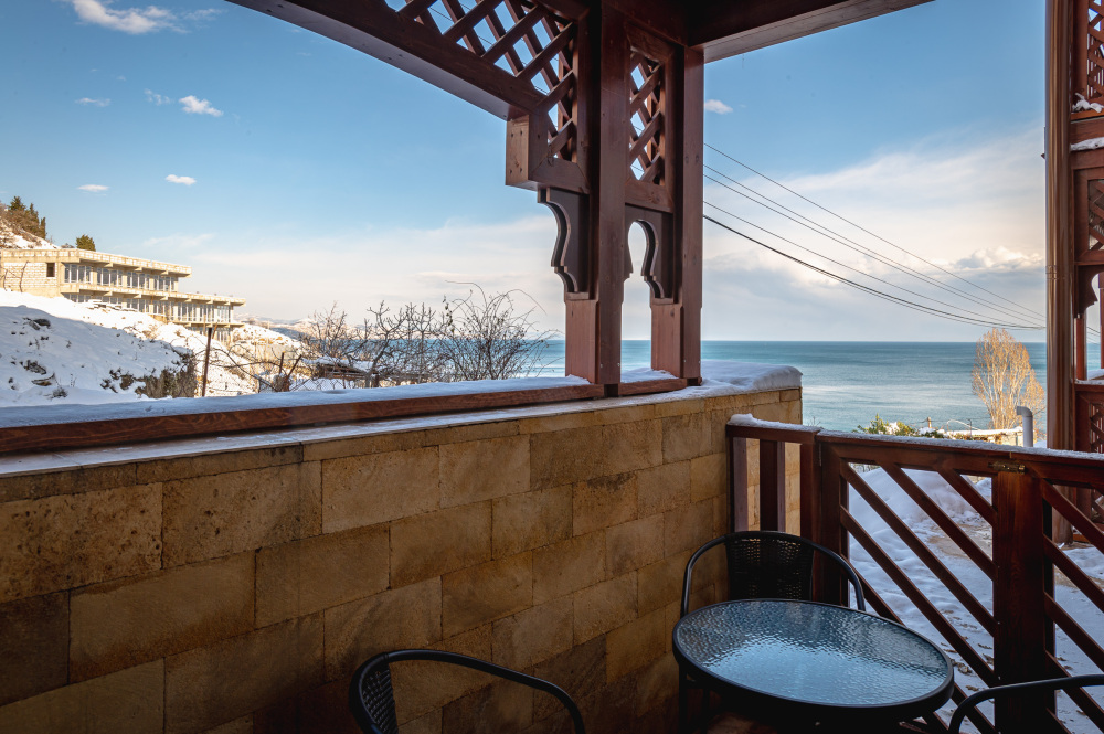 Наш отель расположился на склоне горы Къара Бурун, и это позволяет Вам наблюдать великолепный и незабываем вид из окон отеля на нетронутую Крымскую природу и чудесную набережную Черного моря (все окна отеля выходят на море).