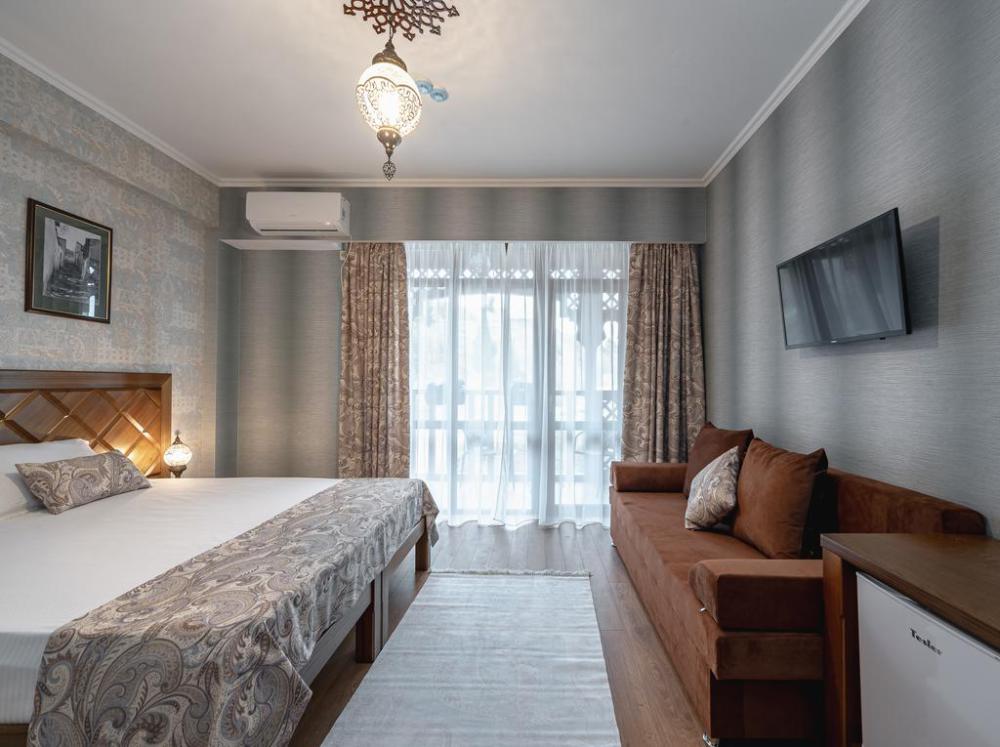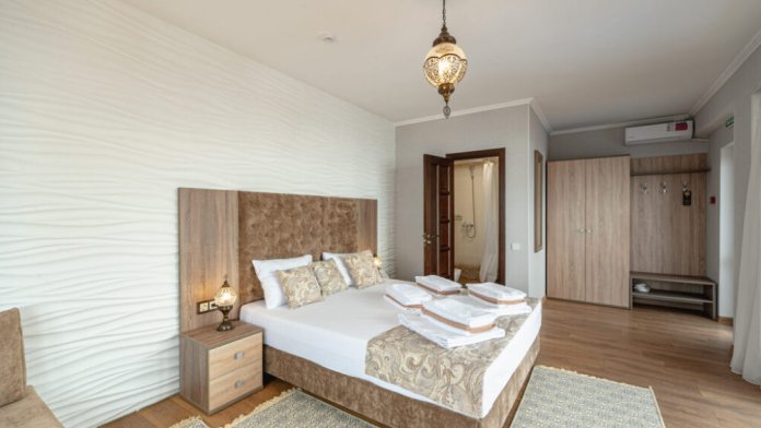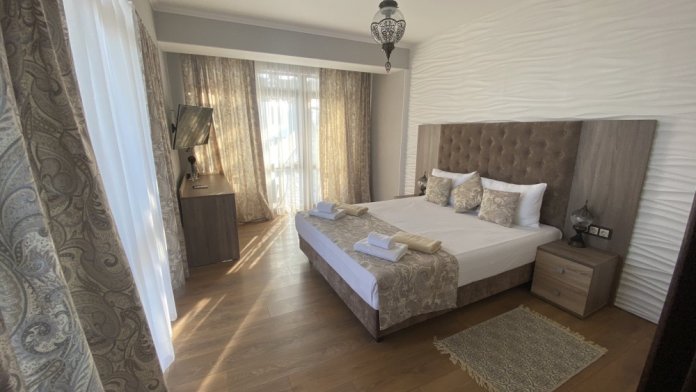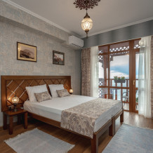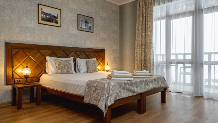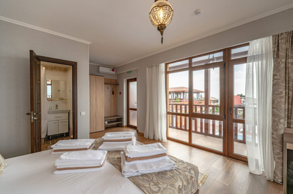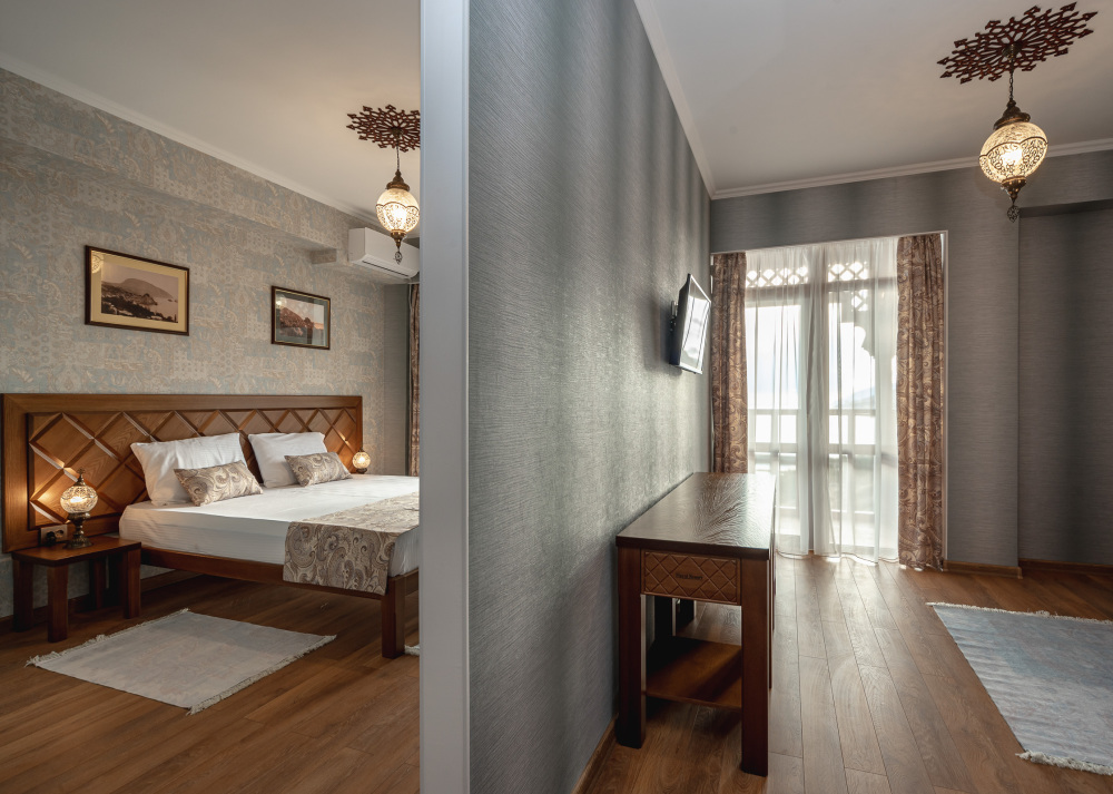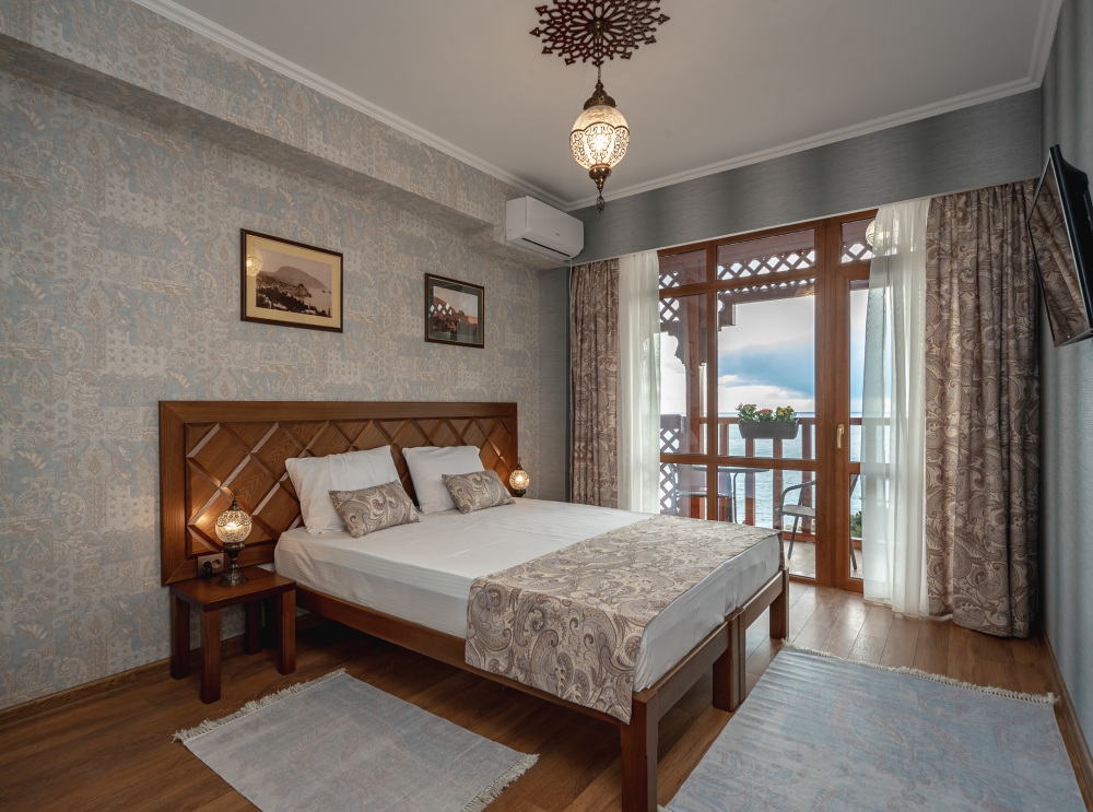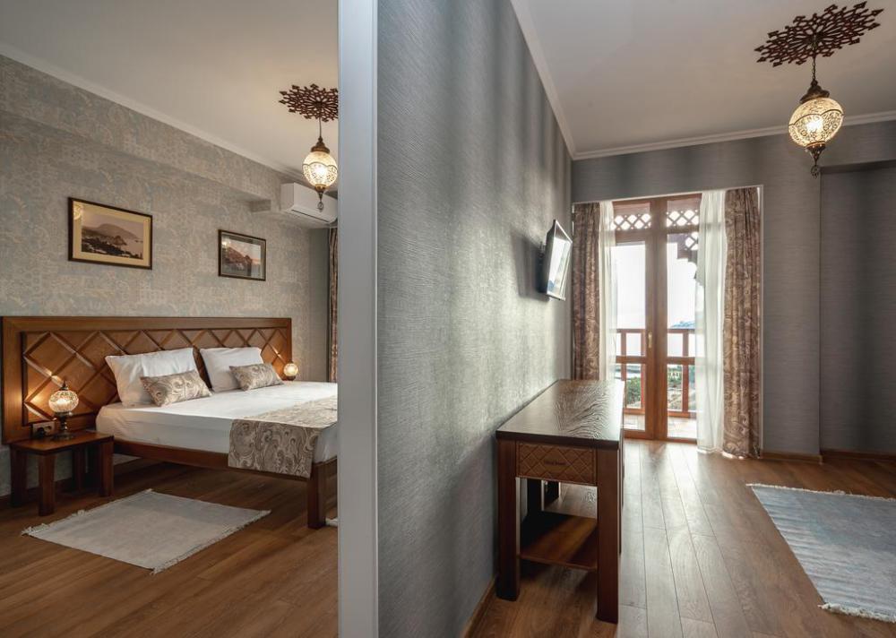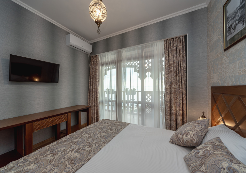 И дополняет мечту незабываемый интерьер и экстерьер нашего отеля. Отель выполнен в восточном стиле, напоминая собой великолепные восточные дворцы Крымского ханства. Весь интерьер и мебель выполнены из натурального резного дерева и экологичных материалов (деревянные фасады балконов, мебель из массива ясеня, отделка из натурального камня). Используются передовые экологические системы отопления и водоочистки.