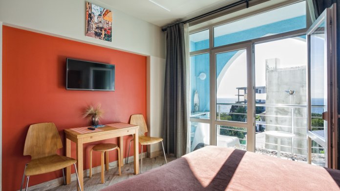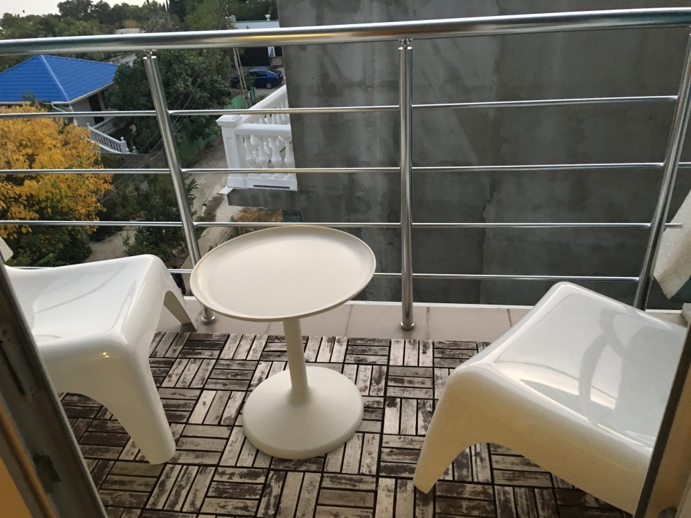 В остальном есть все необходимое для комфортного отдыха: постельные принадлежности, полотенца, фен, утюг, телевизор, Wi-Fi. На балконе уличная мебель: удобные кресла и стол.