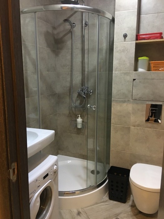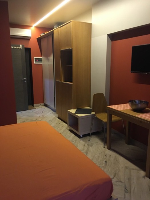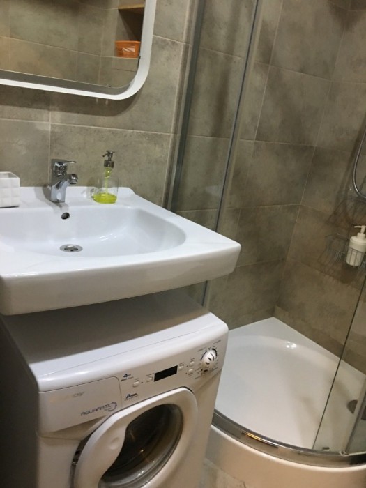 Большая двухспальная кровать, кресло-кровать, прикроватные тумбочки, шкаф для одежды, обеденный стол и табуреты. В этой студии нет кухни в полном понимании, а именно варочной поверхности, рабочей зоны и раковины для мытья посуды. Так как студия небольшая, помыть посуду можно в санузле. Там есть раковина. Если Вы приехали отдыхать, а не готовить, Вам прекрасно подойдет данный вариант. Есть микроволновая печь, электрический чайник, посуда для принятия пищи. Горячая, холодная вода круглосуточно. Автономное отопление (теплый пол) создаст нужную температуру в любое время года.