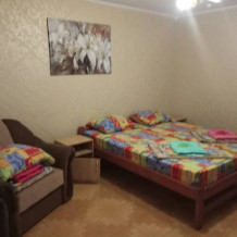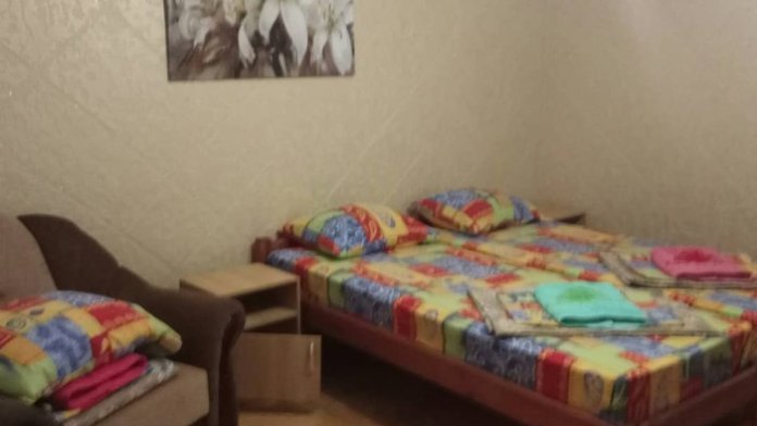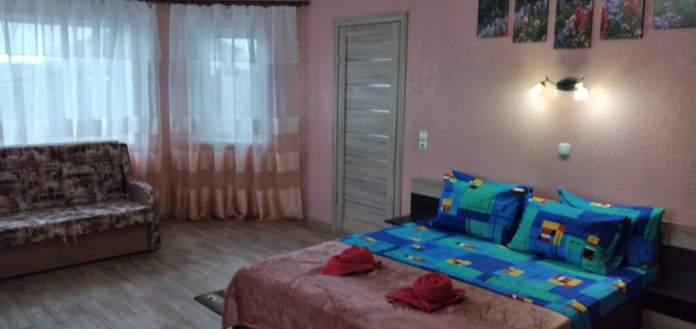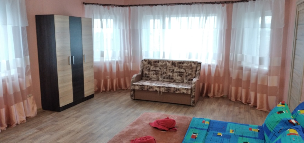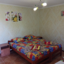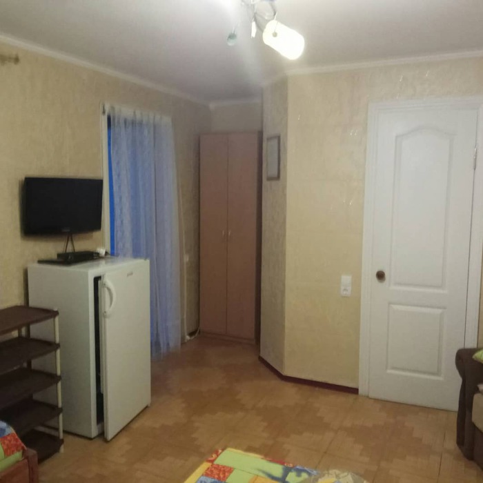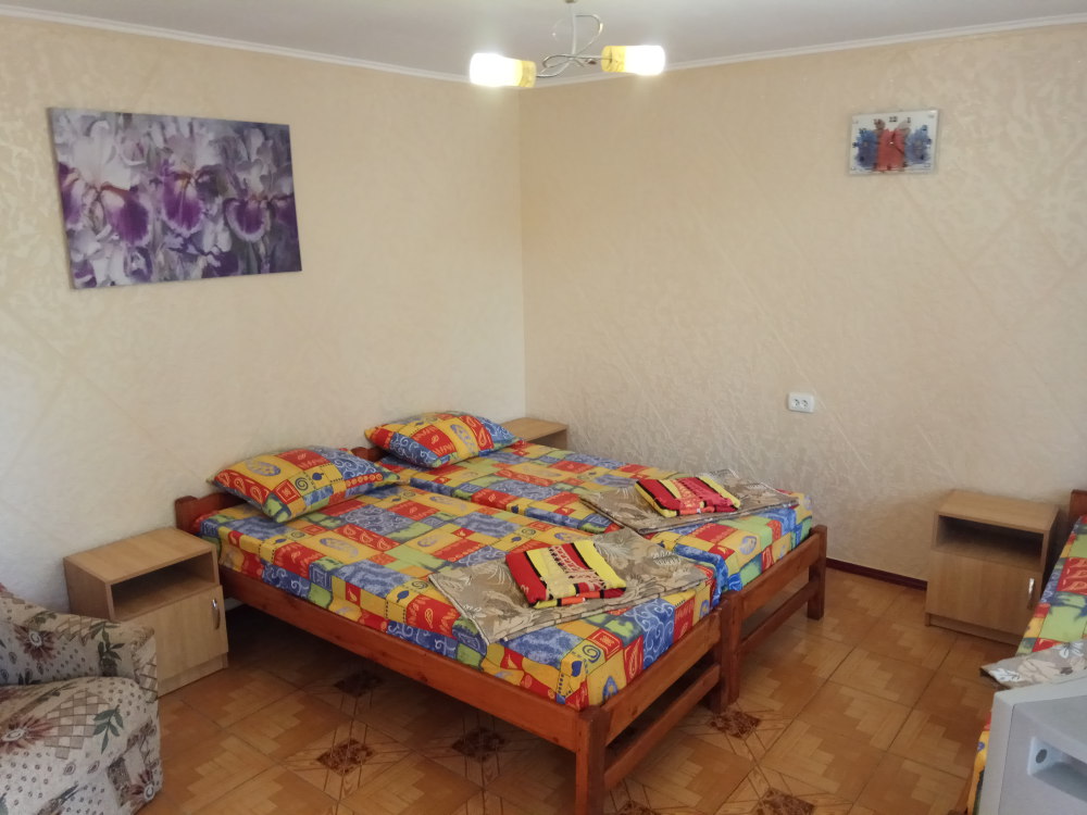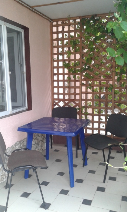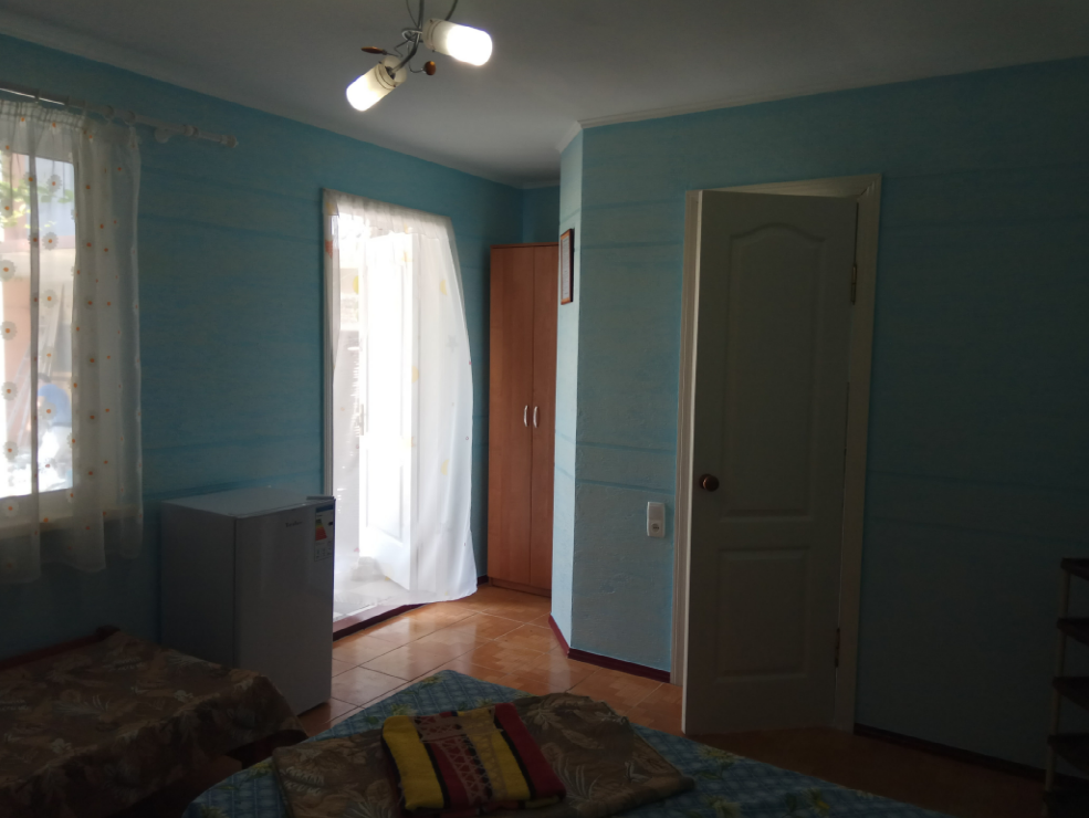 . Стоят 3 полуторные кровати, которые передвигаются и кресло-кровать. Возле кроватей стоят две тумбочки, шкаф для хранения вещей, холодильник, телевизор. Так же в номере есть санузел и душ (холодная и горячая вода круглосуточно). Вход в номер у всех отдельный. Возле каждого номера есть своя верандочка, где стоит стол и стулья. Здесь можно просто отдохнуть или покушать. Веранду украшает очень красивая озелененная жимолость, которая всегда создаст вам уют и теневую зону.