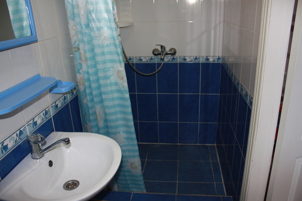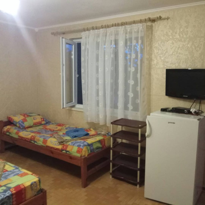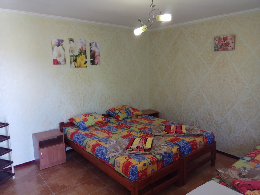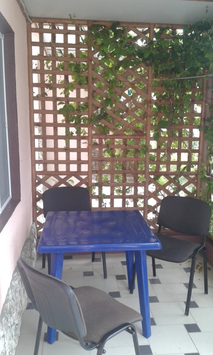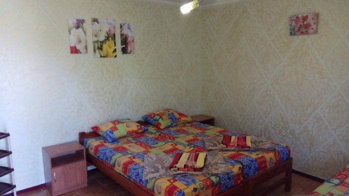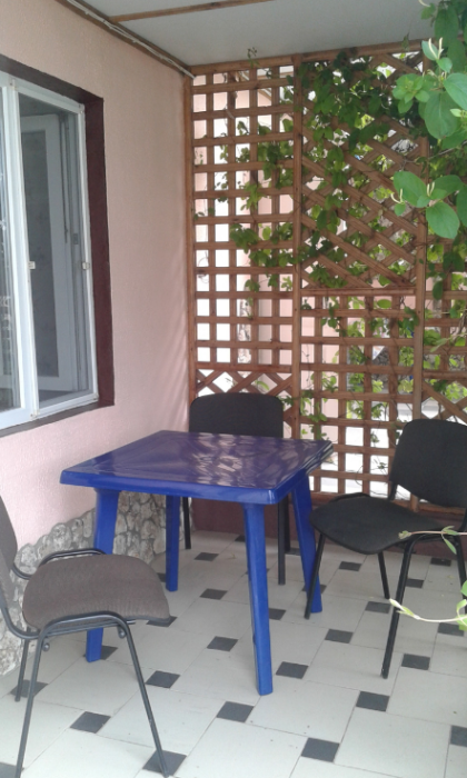 В номере есть вентилятор. Стоят 3 полуторные кровати, которые передвигаются, две тумбочки, шкаф для хранения вещей, холодильник. Так же в номере есть санузел и душ (холодная и горячая вода круглосуточно). Вход в номер у всех отдельный. Возле каждого номера есть своя верандочка, где стоит стол и стулья. Здесь можно просто отдохнуть или покушать. Веранду украшает очень красивая озелененная жимолость, которая всегда создаст вам уют и теневую зону.