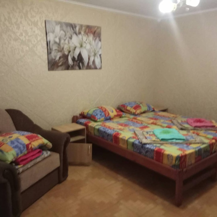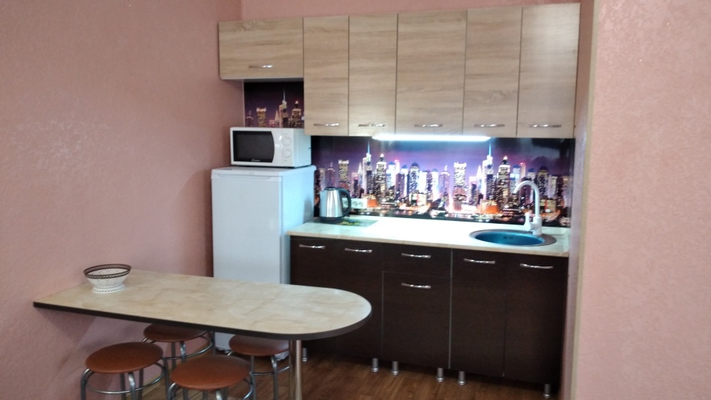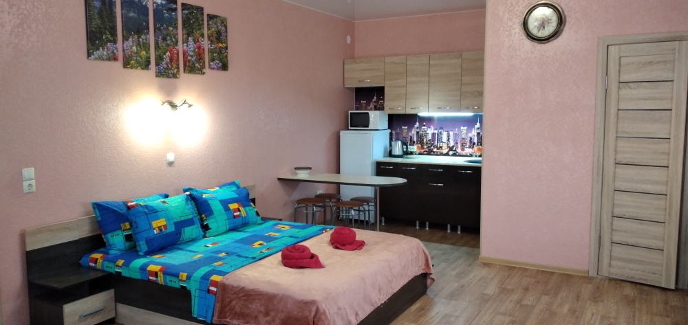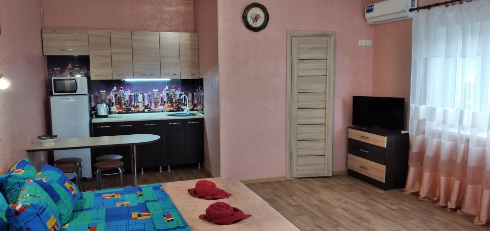 В апартаментах-студии на 2-5 человек: сейф, кухонный уголок с мойкой, микроволновая печь, посуда, шкаф, комод, диванчик, в санузле - бойлер. Мебель в номере: кровать двуспальная (два взрослых), диванчик (два ребенка) и возможно еще дополнительное место - раскладушка.
