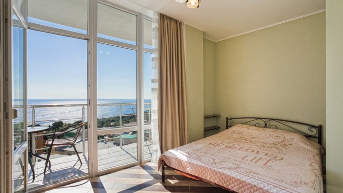 Уютная квартира на четвертом этаже шестиэтажного дома. С балкона открывается шикарный вид на море.