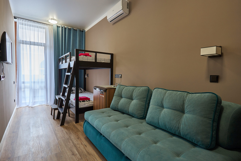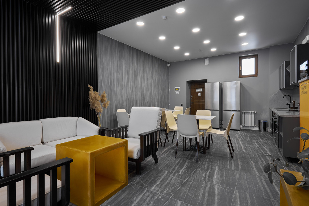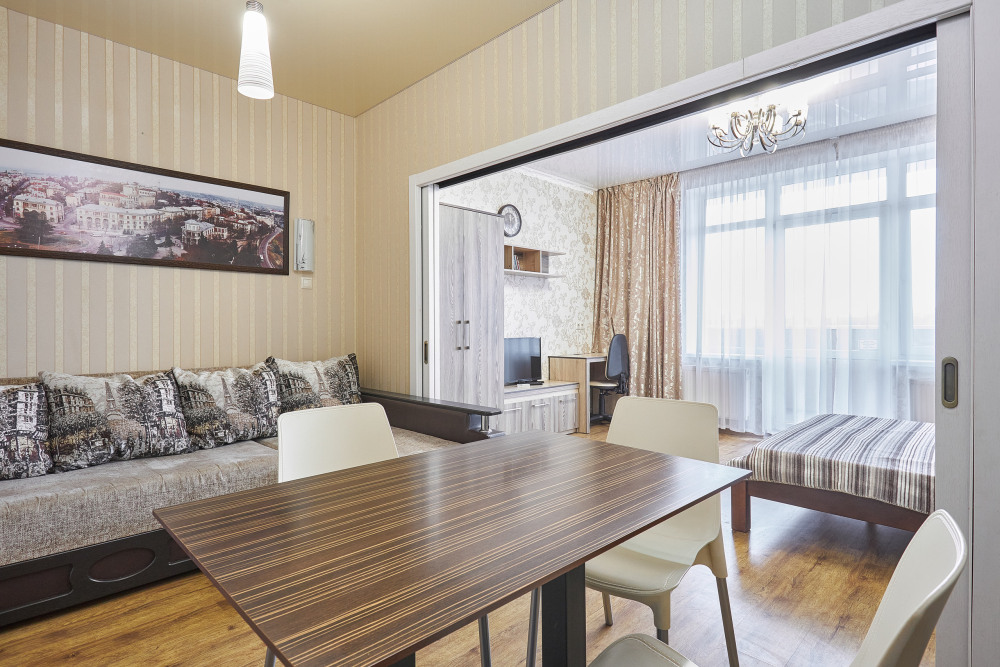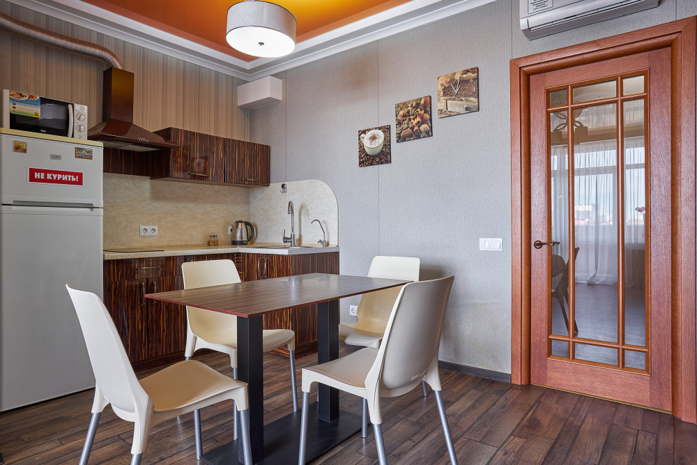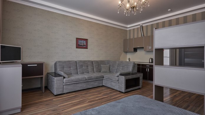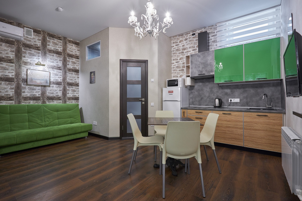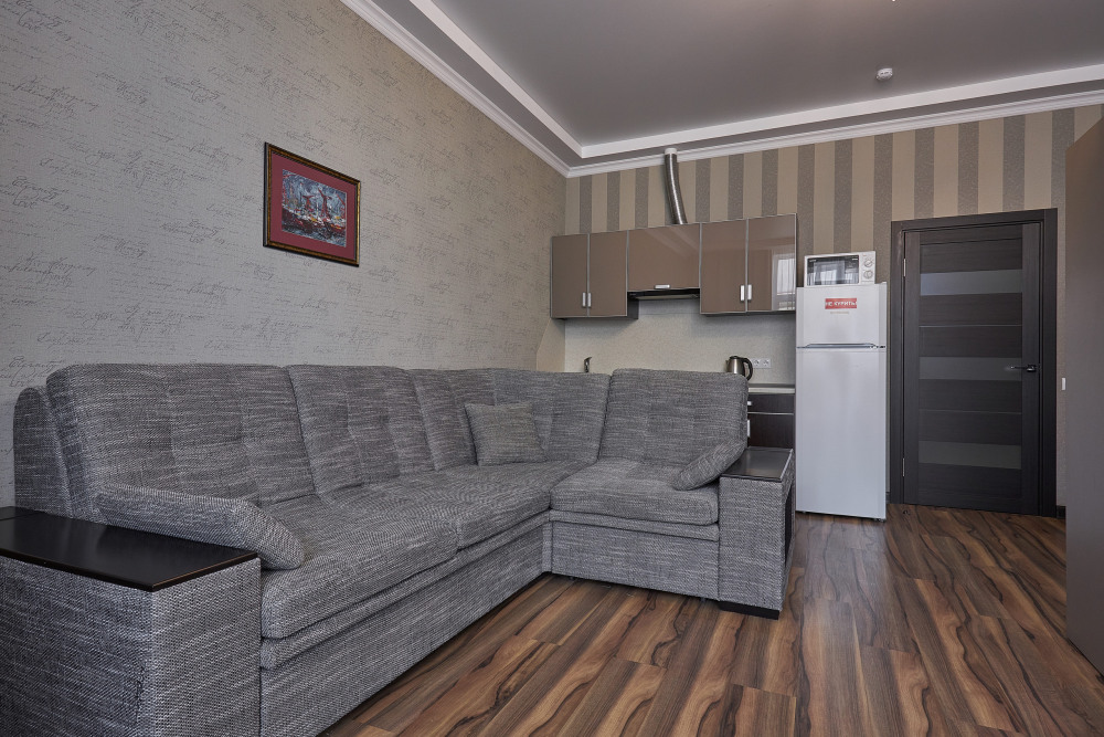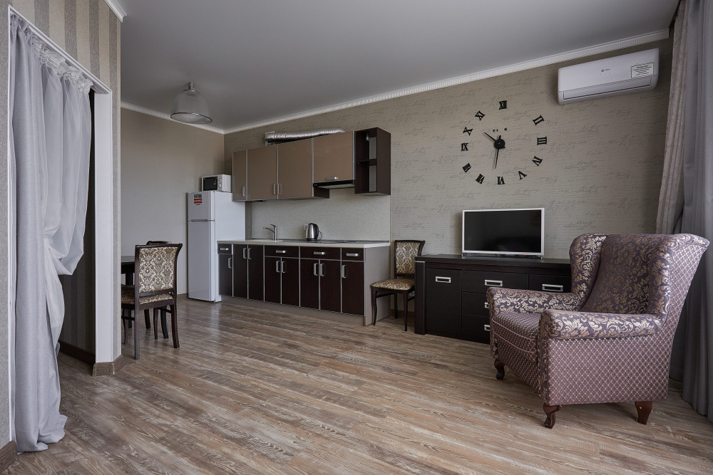 ждёт комфортабельная зона отдыха и полностью оборудованная кухня. Здесь вы найдете все необходимое для комфортного пребывания: зона для обеда, TV, холодильник, сплит-система, мини-парфюмерия.