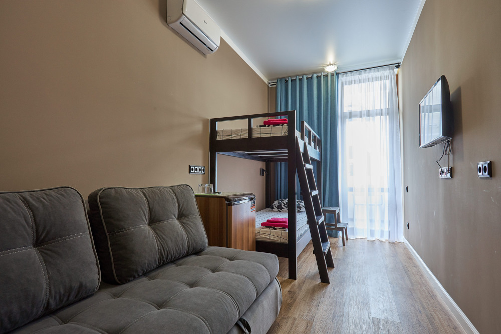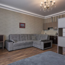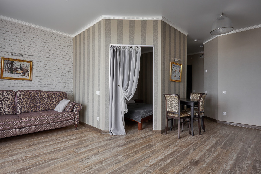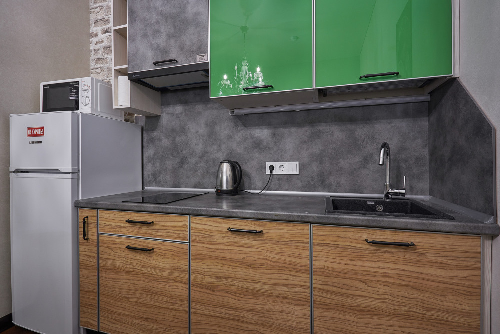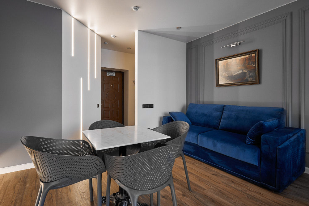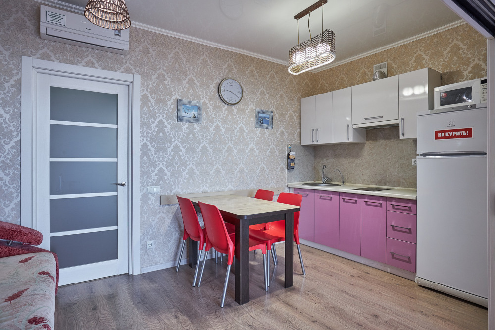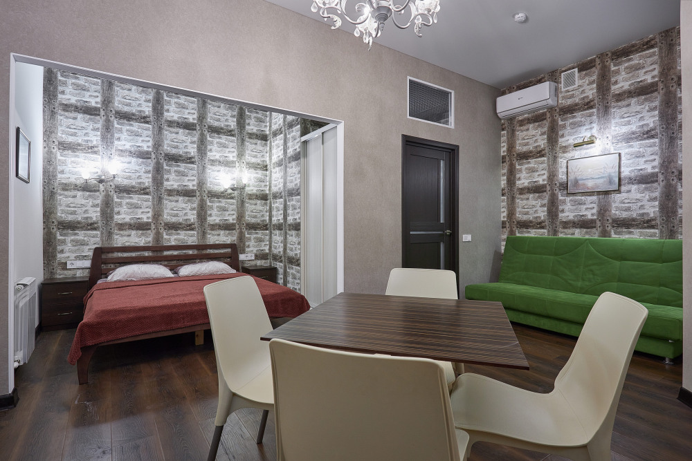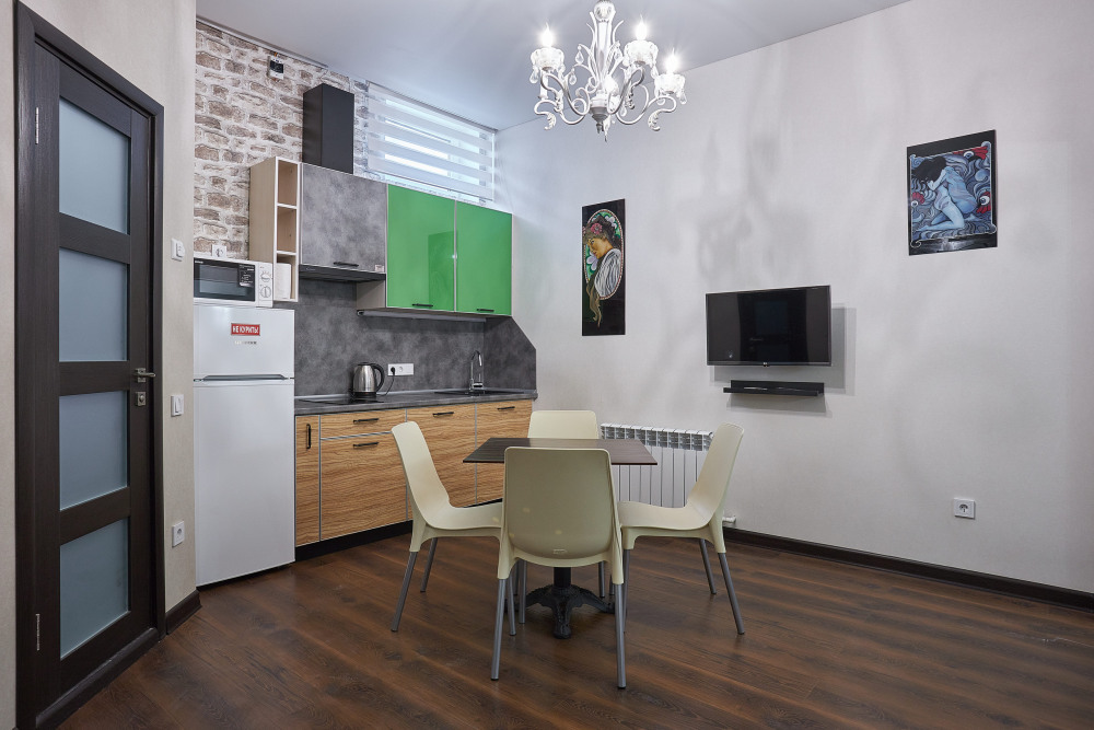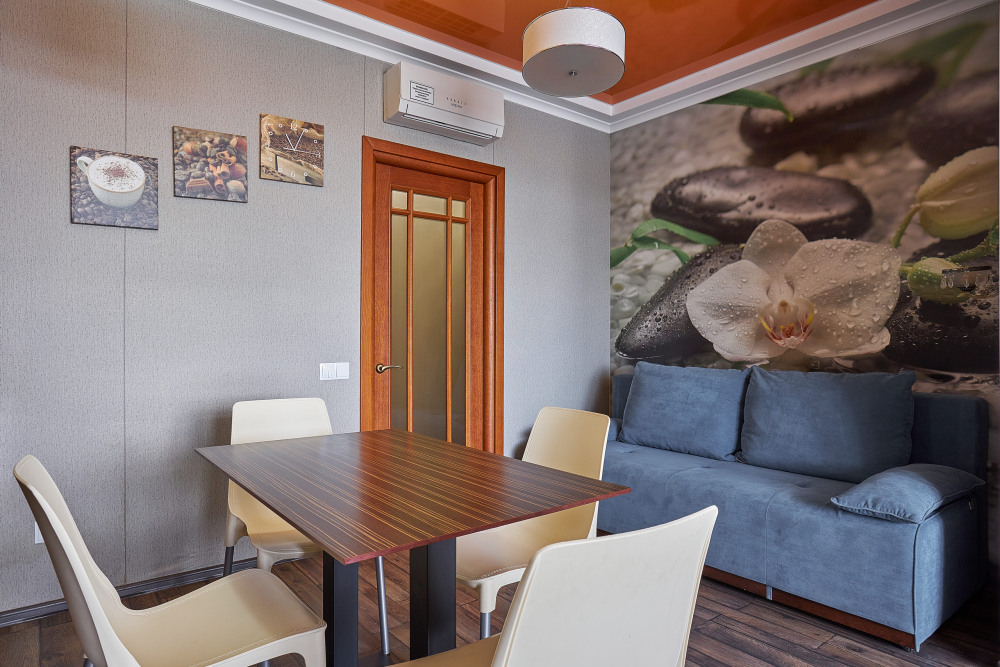 ждёт комфортабельная зона отдыха и полностью оборудованная кухня. Здесь вы найдете все необходимое для комфортного пребывания: зона для обеда, TV, холодильник, сплит-система, мини-парфюмерия.