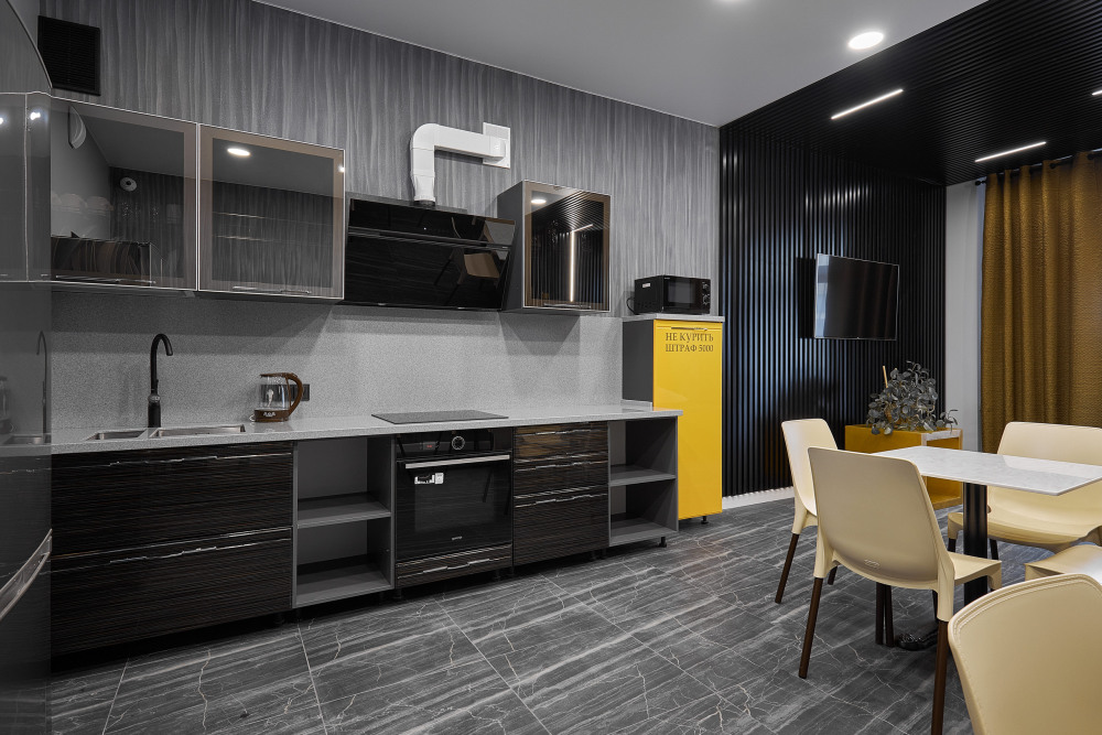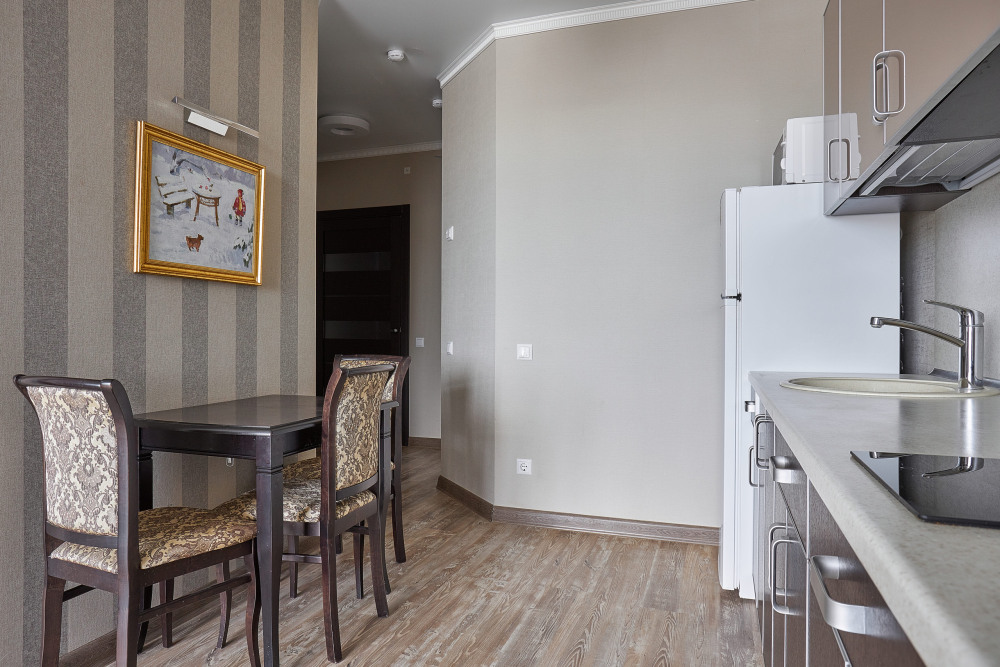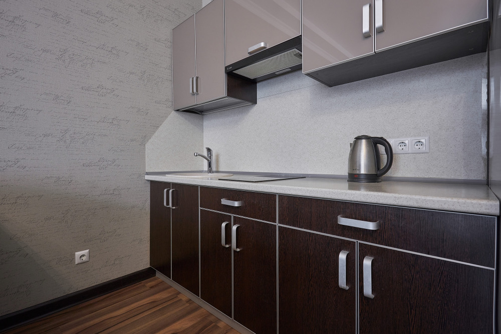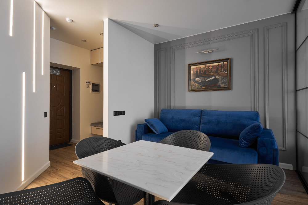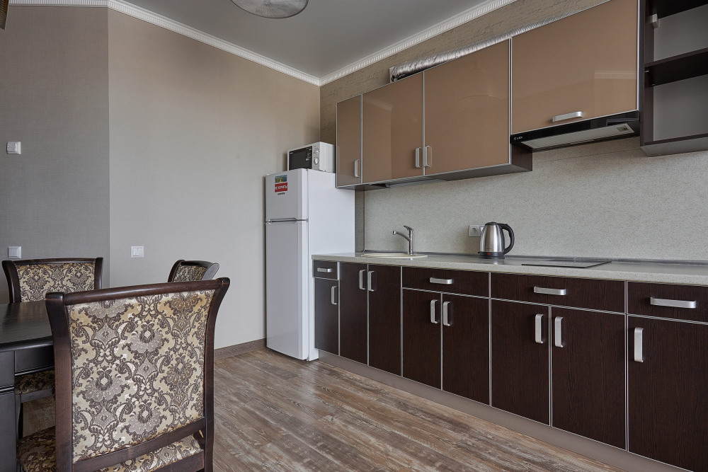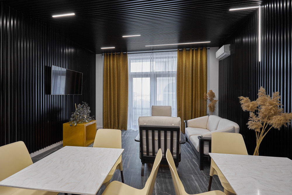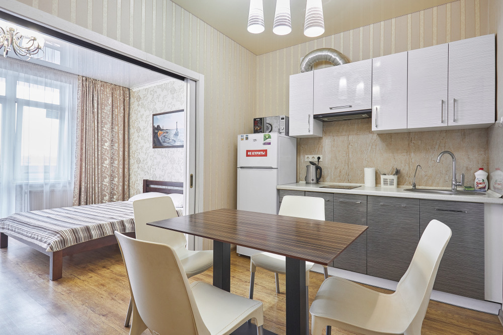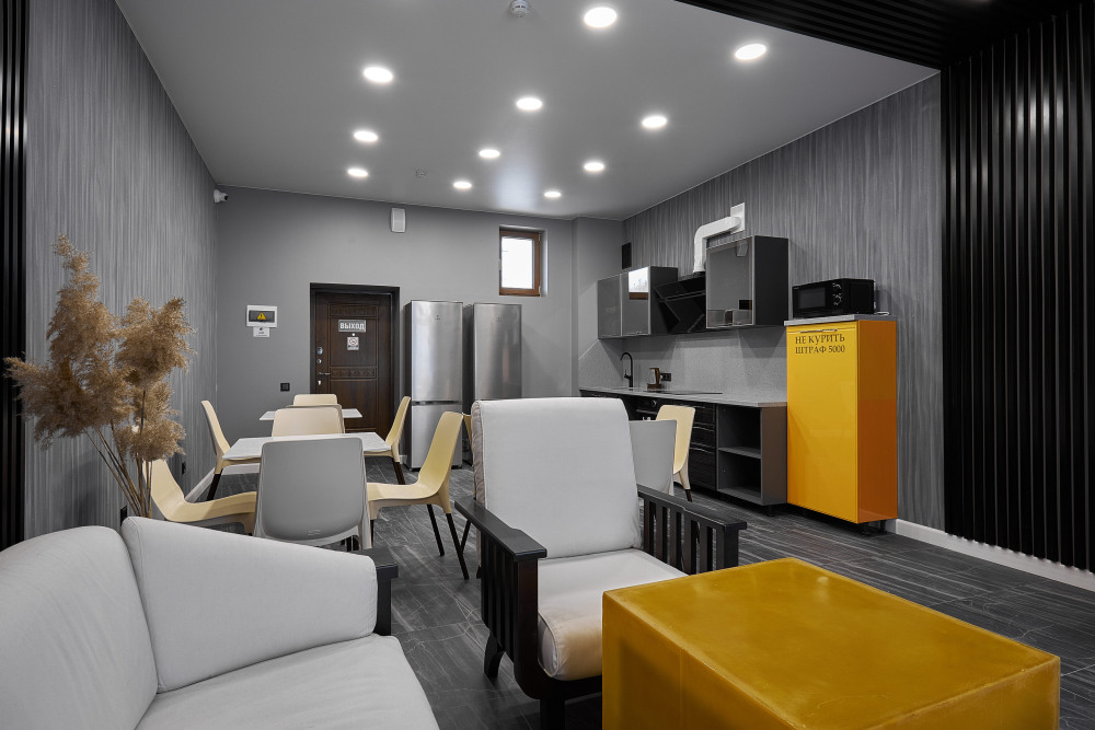 ждёт комфортабельная зона отдыха и полностью оборудованная кухня. Здесь вы найдете все необходимое для комфортного пребывания: зона для обеда, TV, холодильник, сплит-система, мини-парфюмерия.