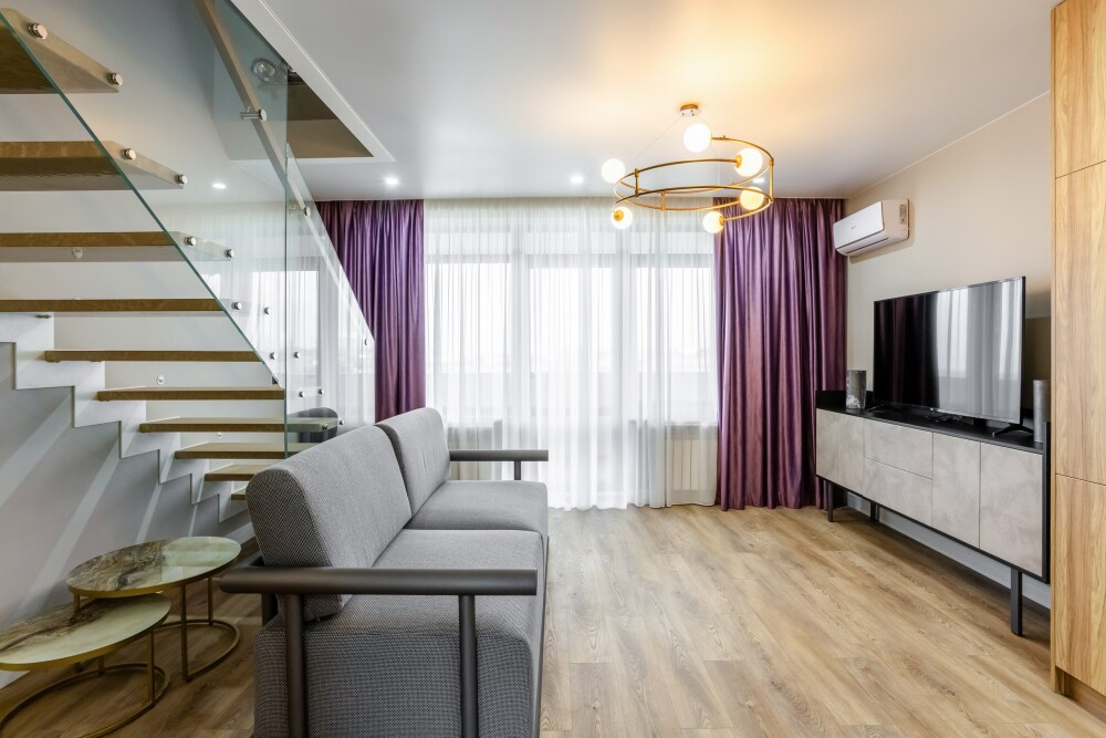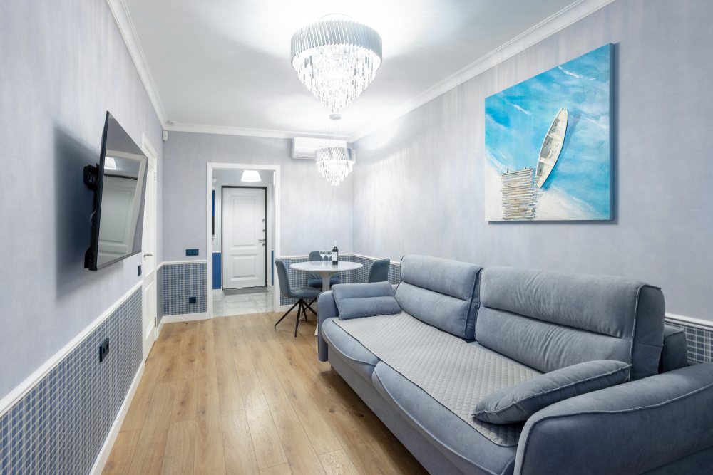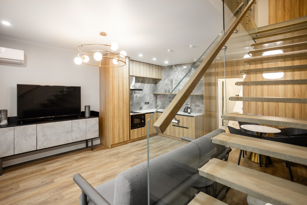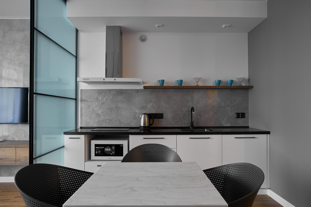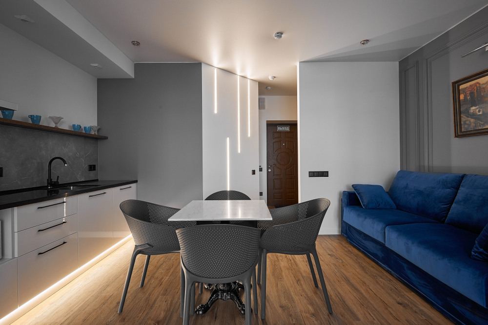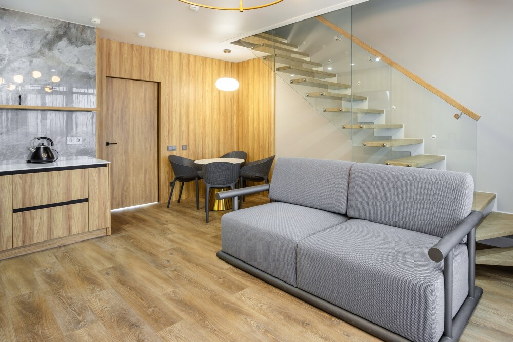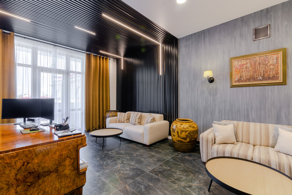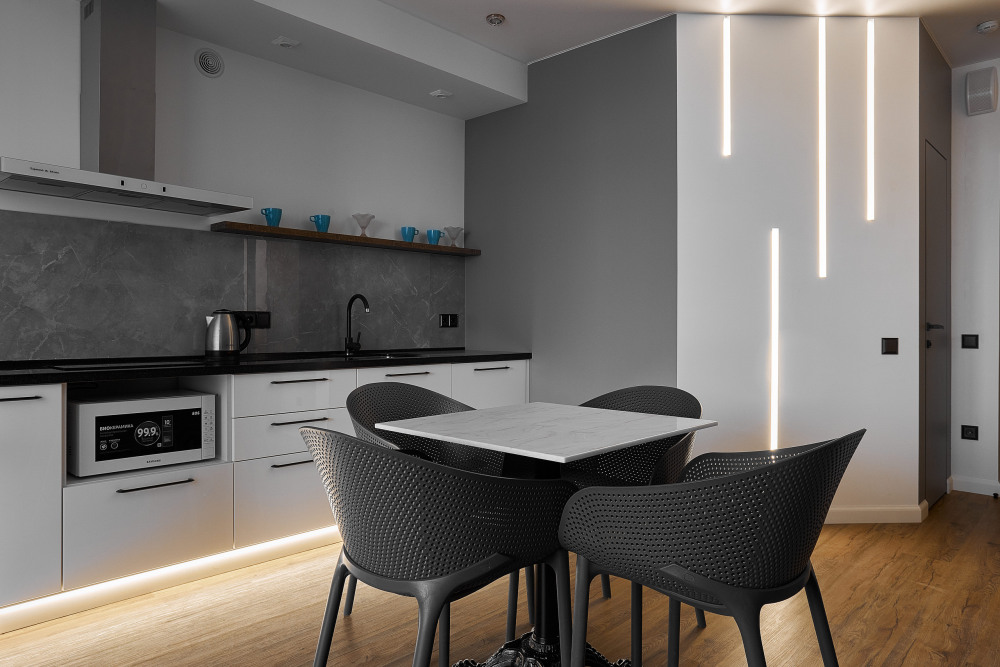 ждёт комфортабельная зона отдыха и полностью оборудованная кухня. Здесь вы найдете все необходимое для комфортного пребывания: зона для обеда, TV, холодильник, сплит-система, мини-парфюмерия.