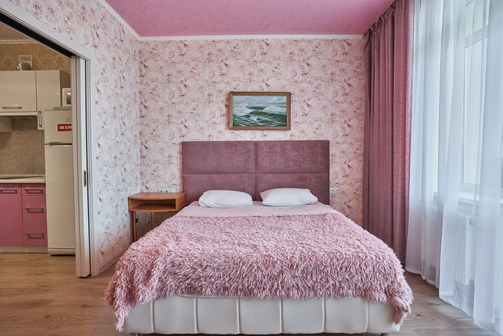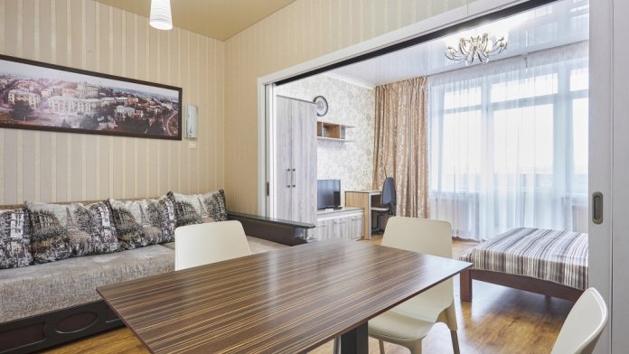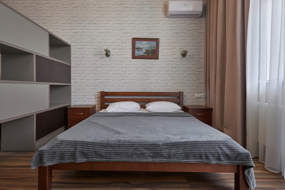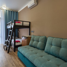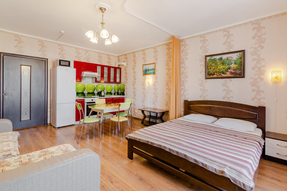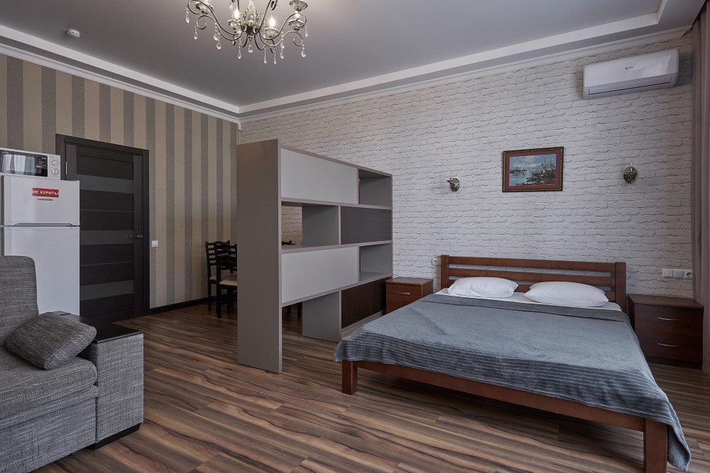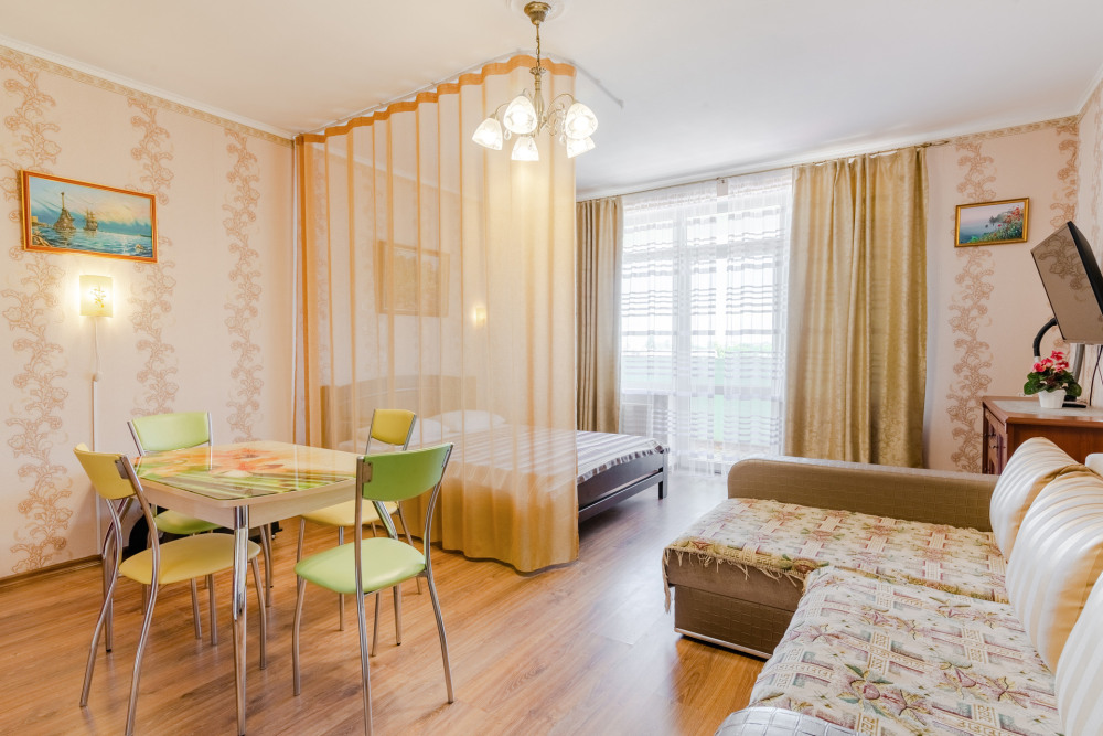 Апартамент станет оптимальным решением для размещения 2-х отдыхающих (просторная двуспальная кроват) и для 2-х гостей диван-кровать. Вас