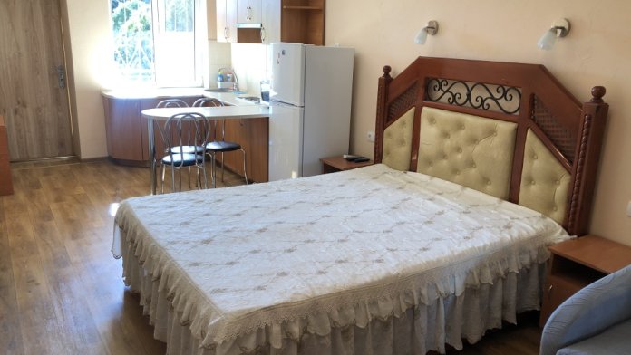 В номере есть: холодильник, кондиционер, спутниковое ТВ, Wi-Fi, вода постоянно холодная и горячая, стиральная машинка в общем пользовании. На первом этаже небольшой дворик со столом и стульями, на втором этаже балкончик со столом и стульями.
