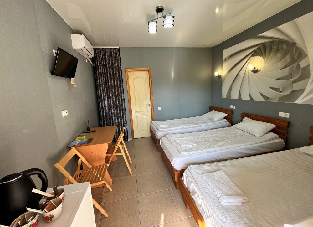 уютный трехместный номер со всеми удобствами. В номере находятся кровати с ортопедическим матрасами и качественным постельным бельем, телевизор, холодильник, кондиционер, чайник, фен. В душевой комнате находится новая сантехника и туалетные принадлежности. Бесплатный WI-Fi.