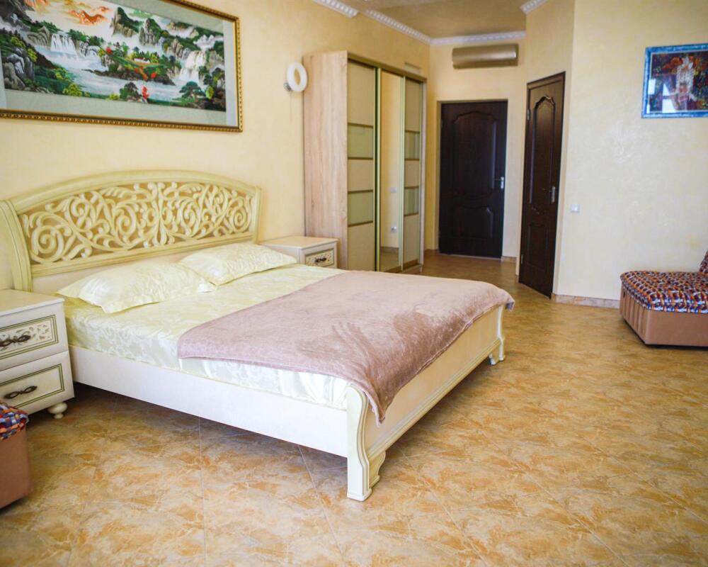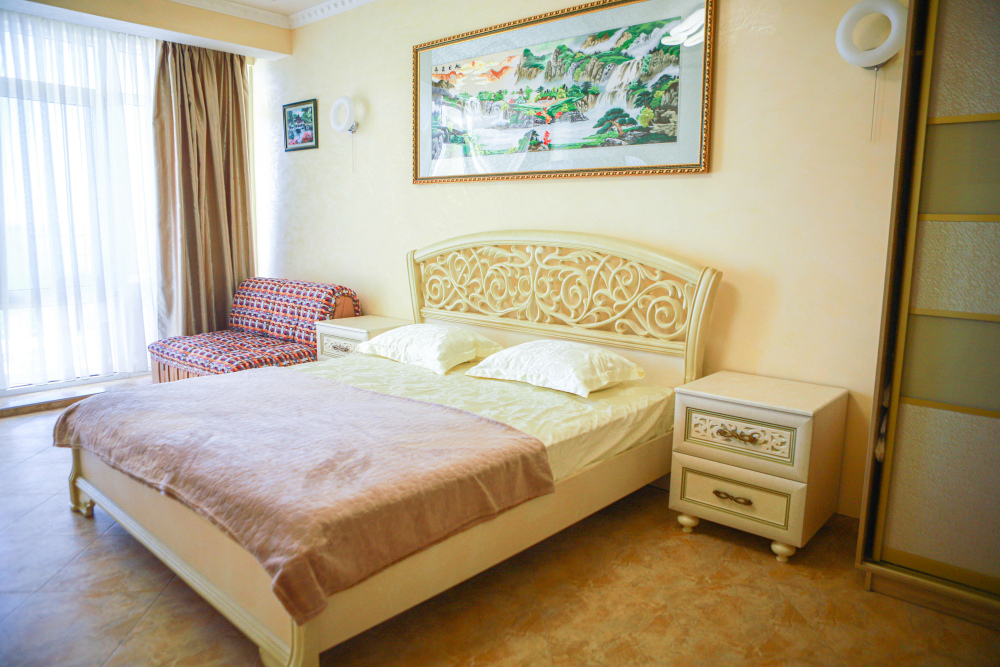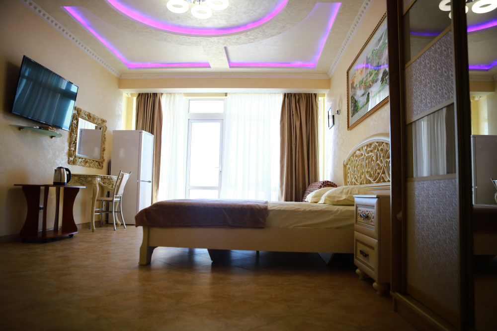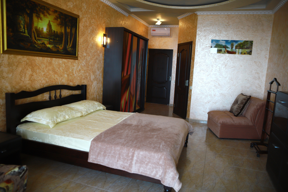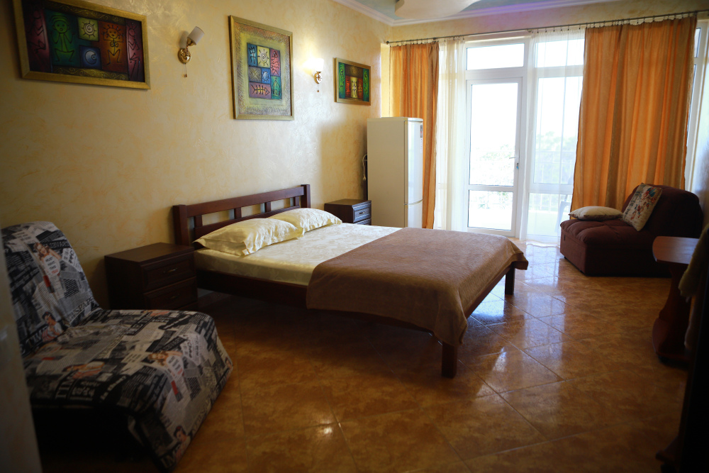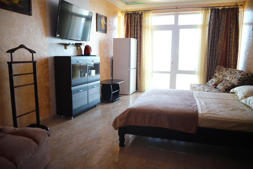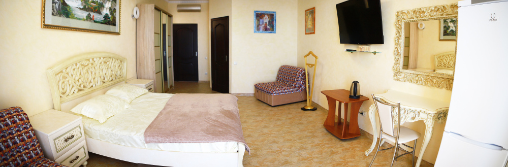 В номере кондиционер, большая двуспальная кровать, две раскладные кресло-кровати, большой холодильник, чайник, столовые приборы, шкаф для одежды, плазменный телевизор. Большой балкон со столом и стульями, а также шезлонгом с видом на море.