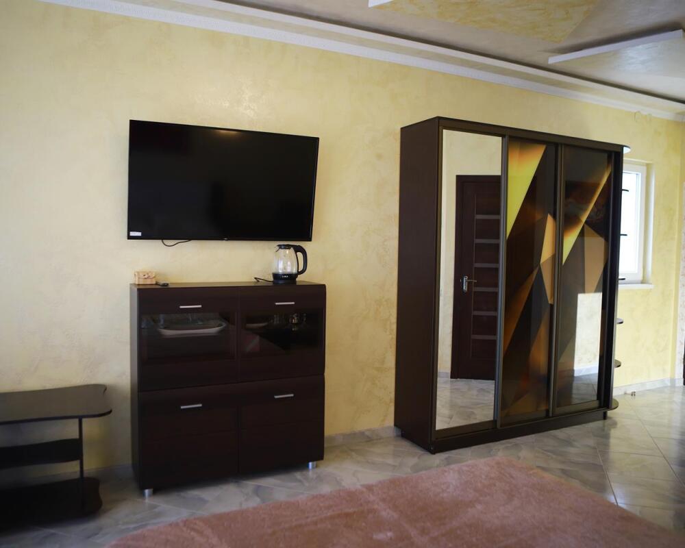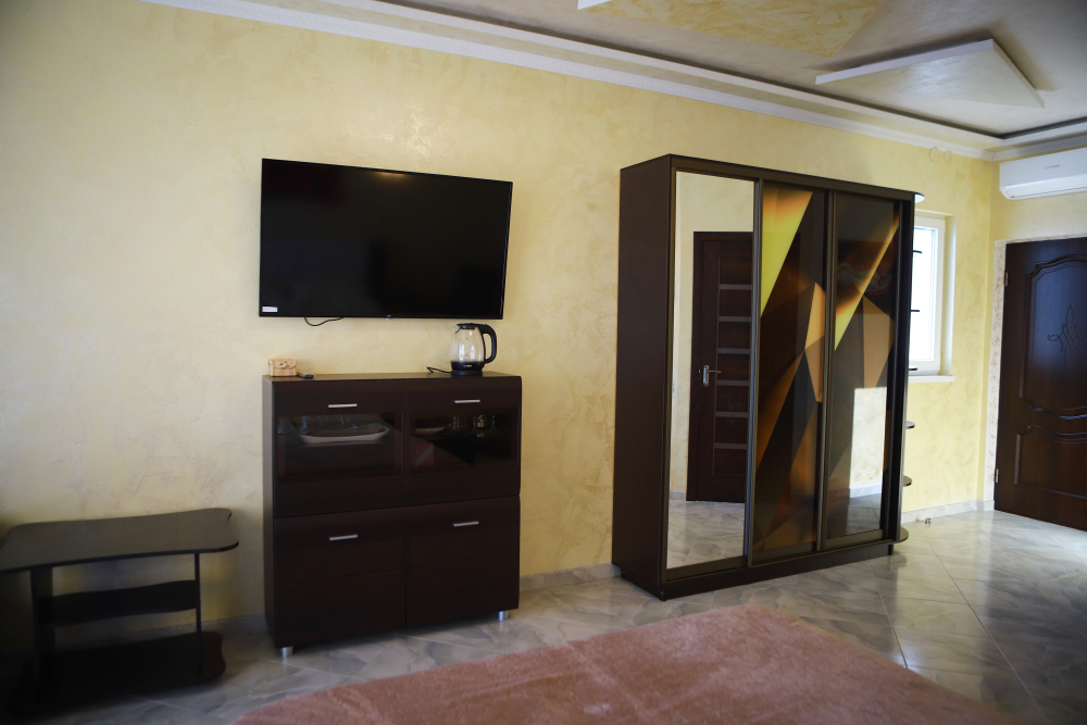 В номере кондиционер, большая двуспальная кровать, две раскладные кресло-кровати, большой холодильник, чайник, столовые приборы, шкаф для одежды, плазменный телевизор.