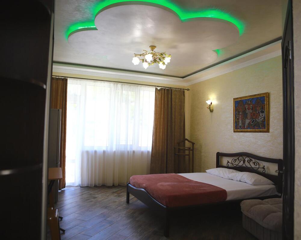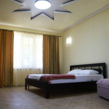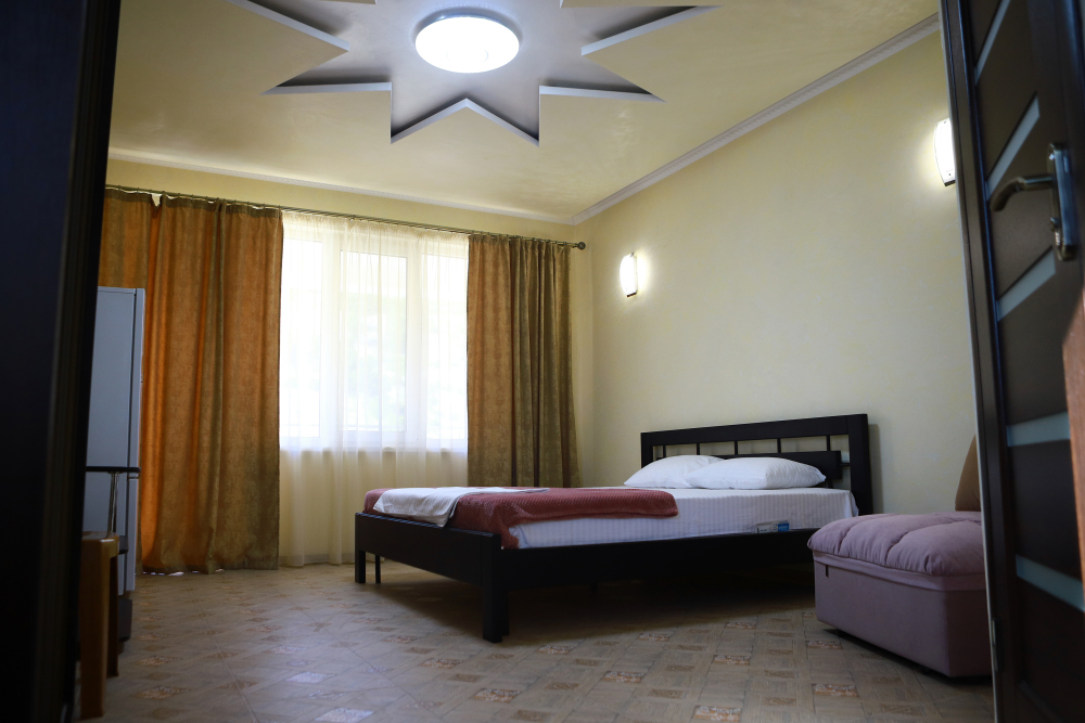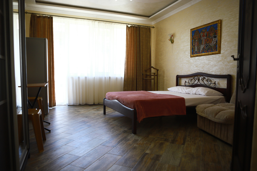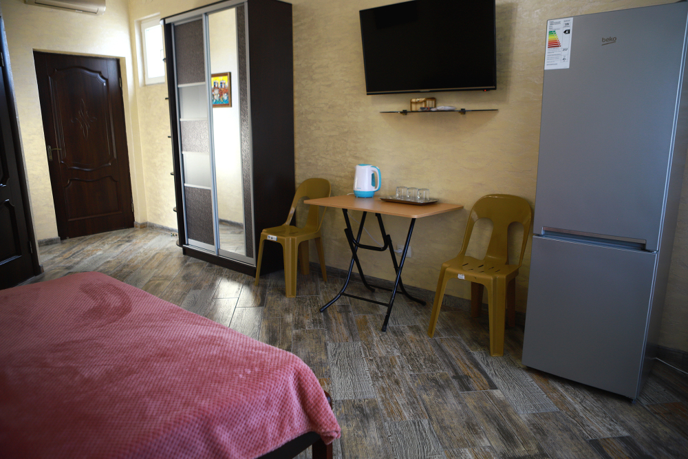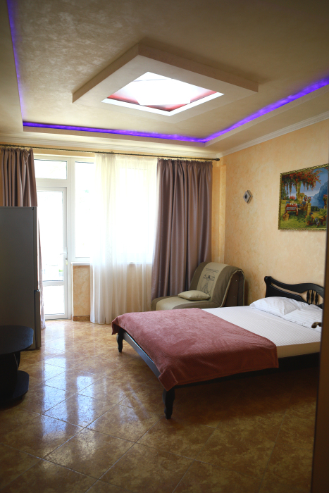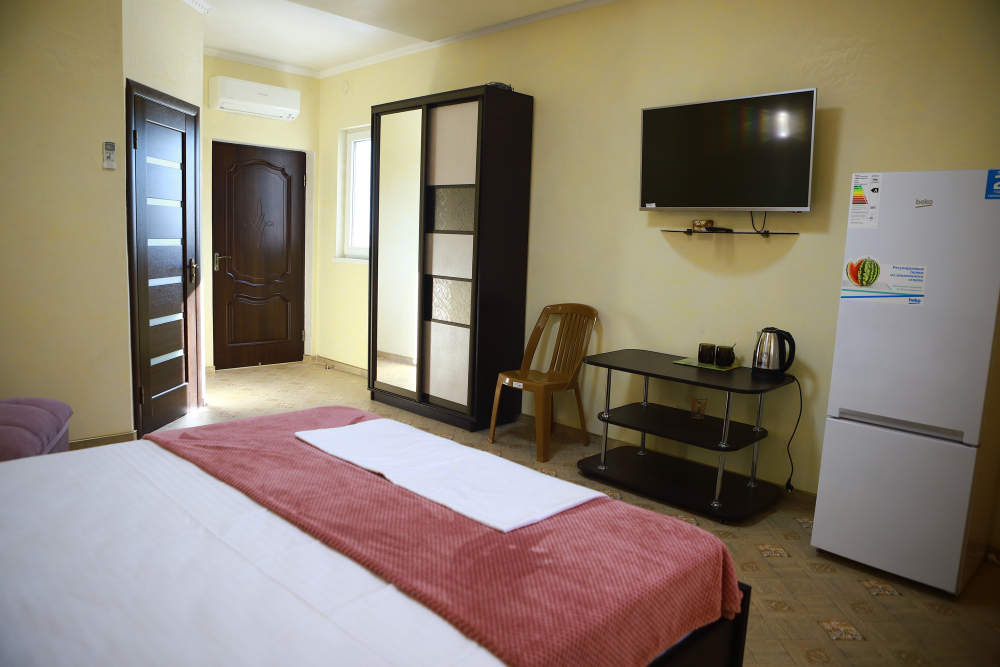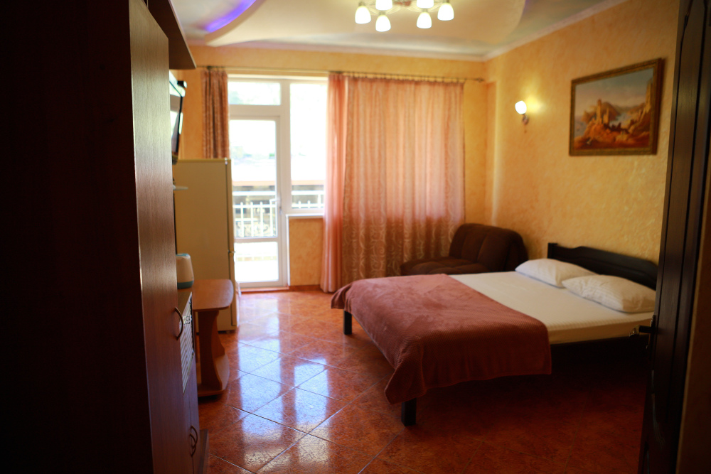 Номер с открытым балконом. В номере двуспальная кровать, раскладное-кресло кровать, телевизор, чайник, холодильник, кондиционер, столовые приборы, шкаф для одежды, Ванная комната с душем, горячая и холодная вода круглосуточно. Вид на горы.