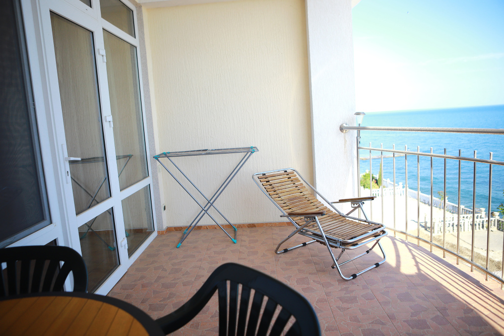 Большой балкон со столом и стульями, а также шезлонгом с видом на море. Ванная комната с душем, туалетные принадлежности горячая и холодная вода круглосуточно.