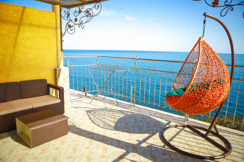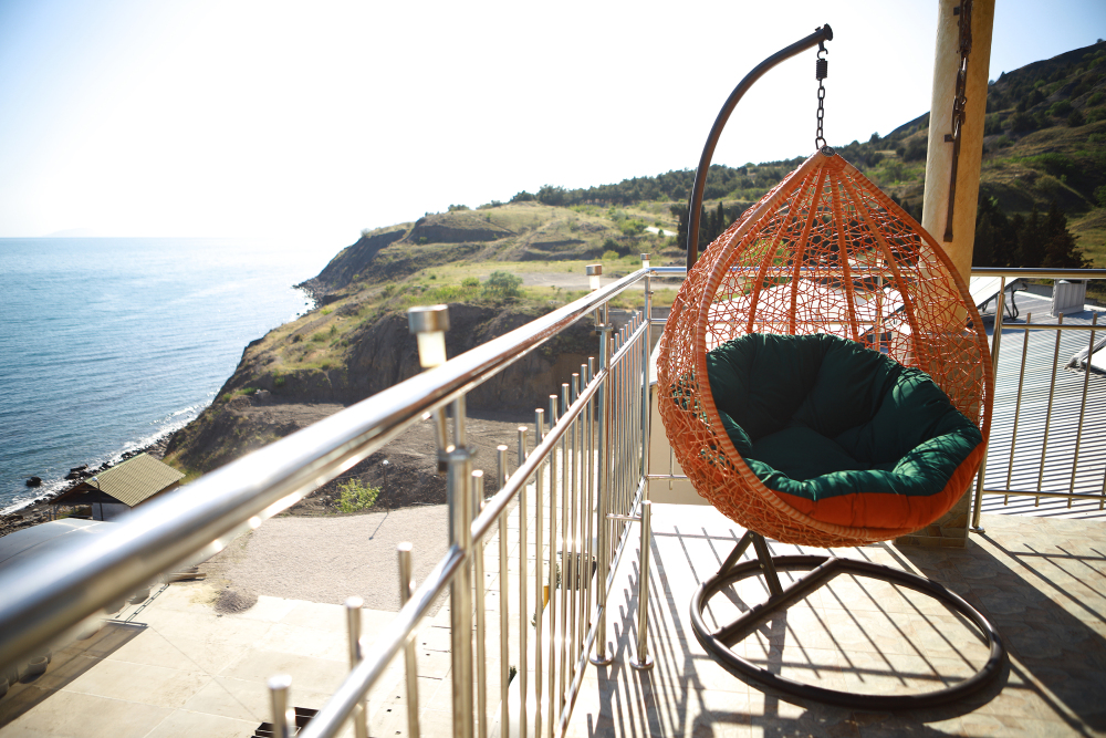 Великолепно оборудованные номер с большой террасой 10 кв.м. на 5 этаже с видом на море. В номере большая двуспальная кровать и одноместная кресло кровать, большой телевизор, чайник, шкаф для одежды, кондиционер, посуда, кресло качалка а также мебель из ротанга. Ванная комната с душем и круглосуточной горячей и холодной водой. Панорамный вид на море и местную природу.