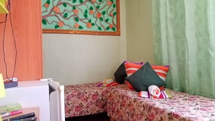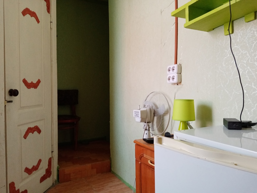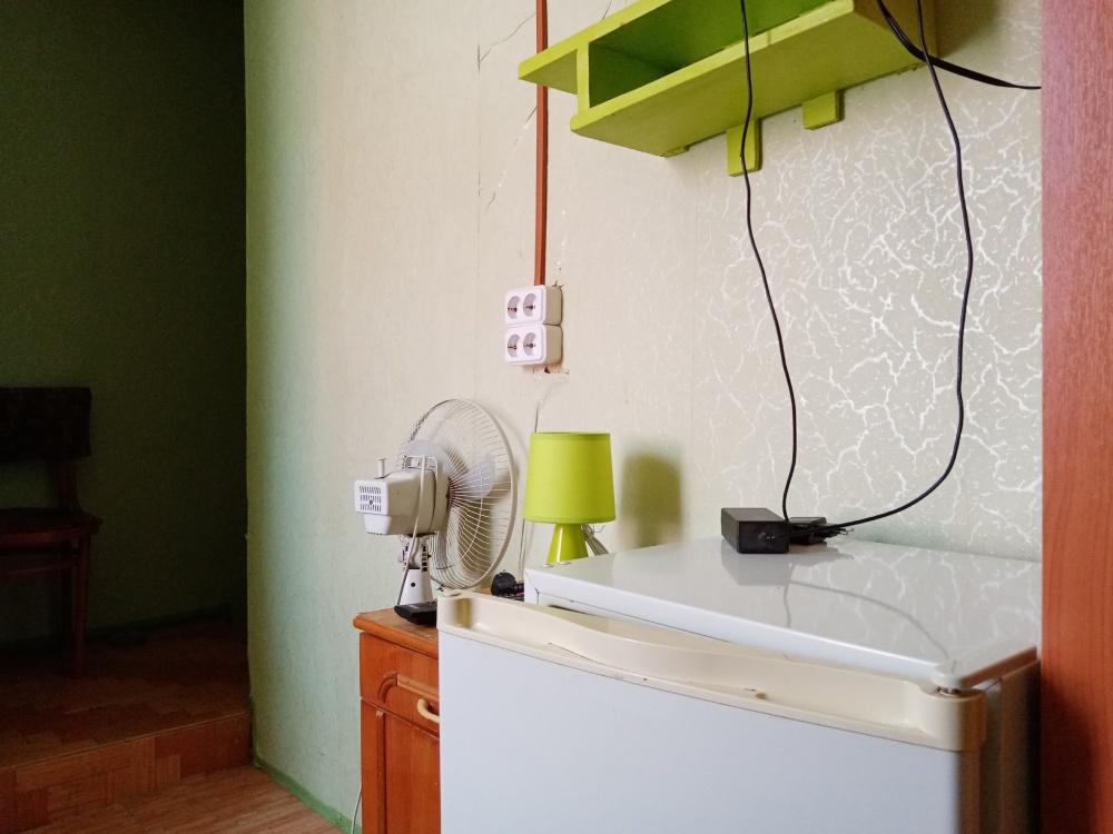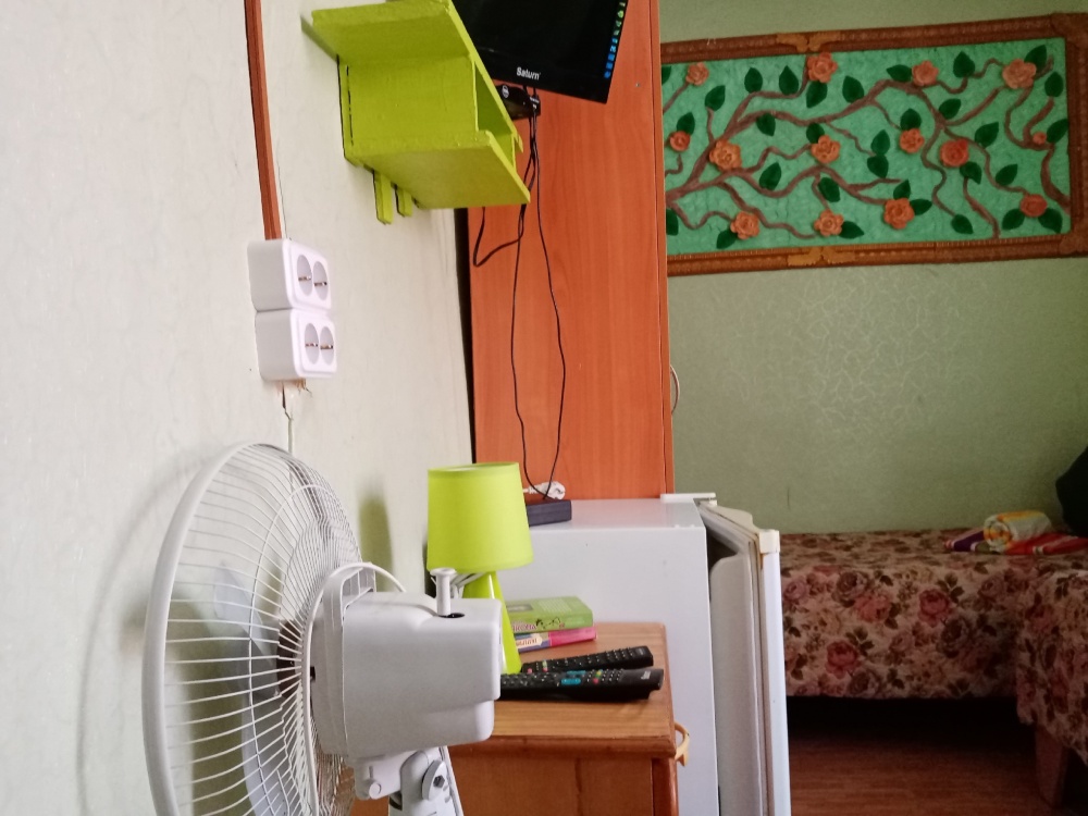 В комнате кровати, тумбочки,шкаф, холодильник, вентилятор, сейф, посуда, постельное бельё. В санузле: душ - горячая и холодная вода постоянно, умывальник, унитаз.