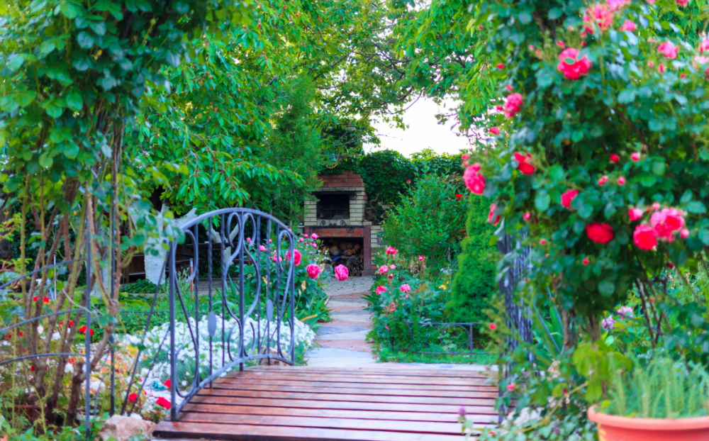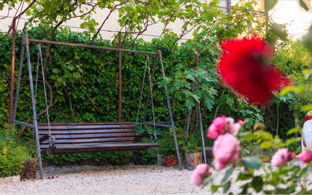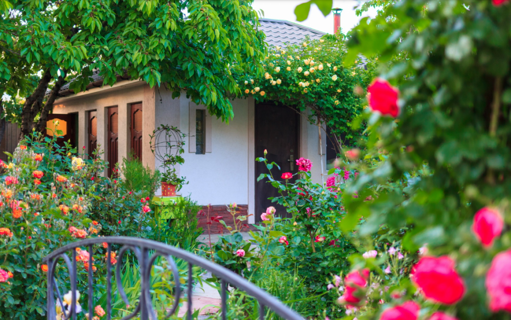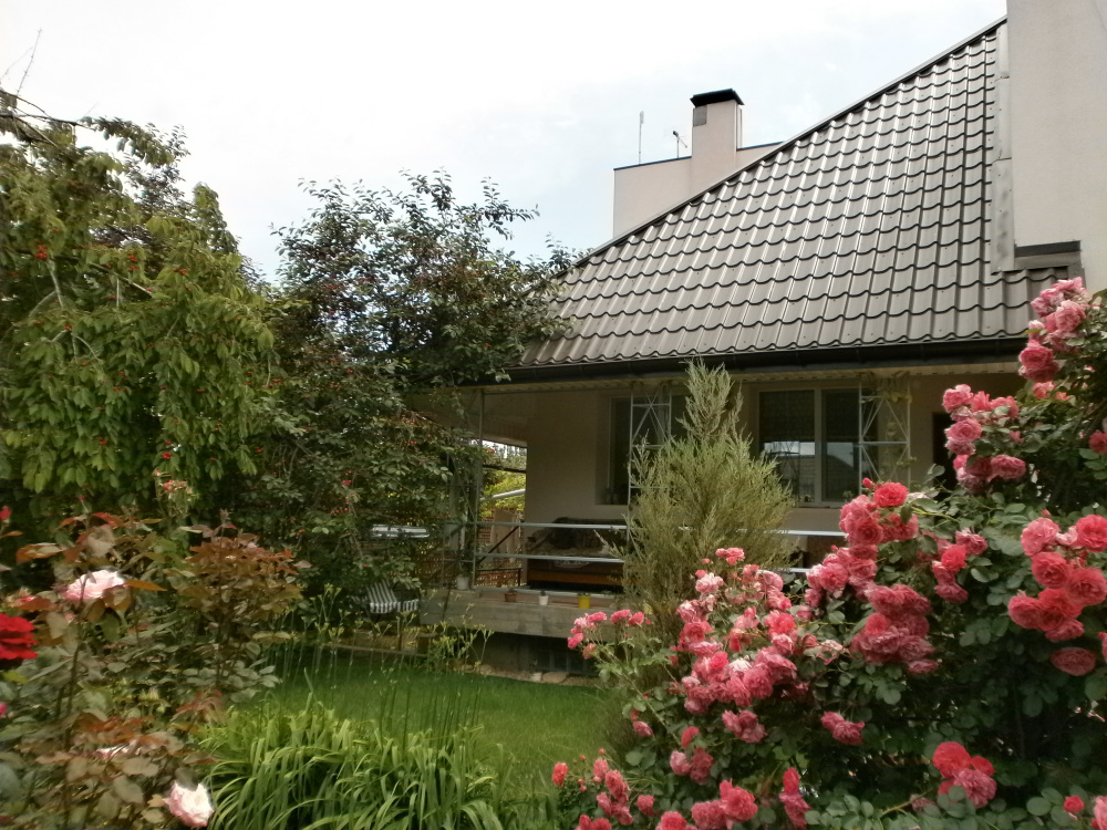 Территория благоустроена. Фруктовый сад, газоны, розарии, хвойные насаждения, цветы, скамейки, качели, печь-мангал, барбекю, беседка-будуар, гамак, круглый стол в тенистом саду, с возможностью посадить до 20 человек одновременно, летняя кухня, умывальник, два отдельных благоустроенных санузла и две душевые с горячей водой (с выходом в сад для удобства отдыха). Детская площадка в виде 2-этажной стилизованной палубы корабля.