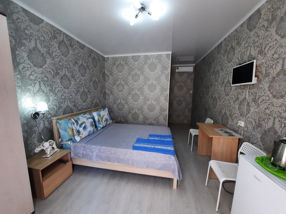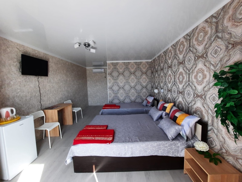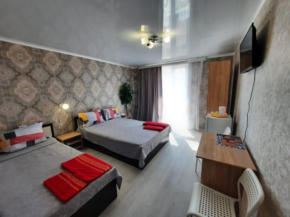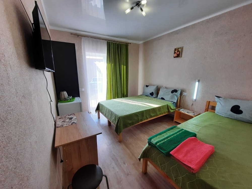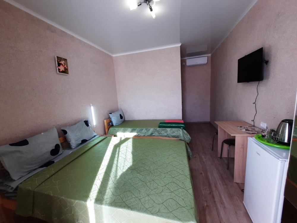 В номере: 2-местная кровать, одноместная кровать, шкаф, стол, стулья, 2 тумбы, зеркало, кондиционер, телевизор, холодильник, чайник, посуда, сушилка для белья, интернет Wi-fi.