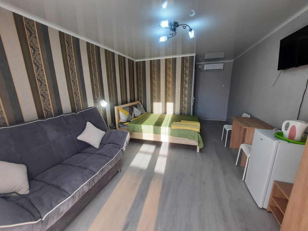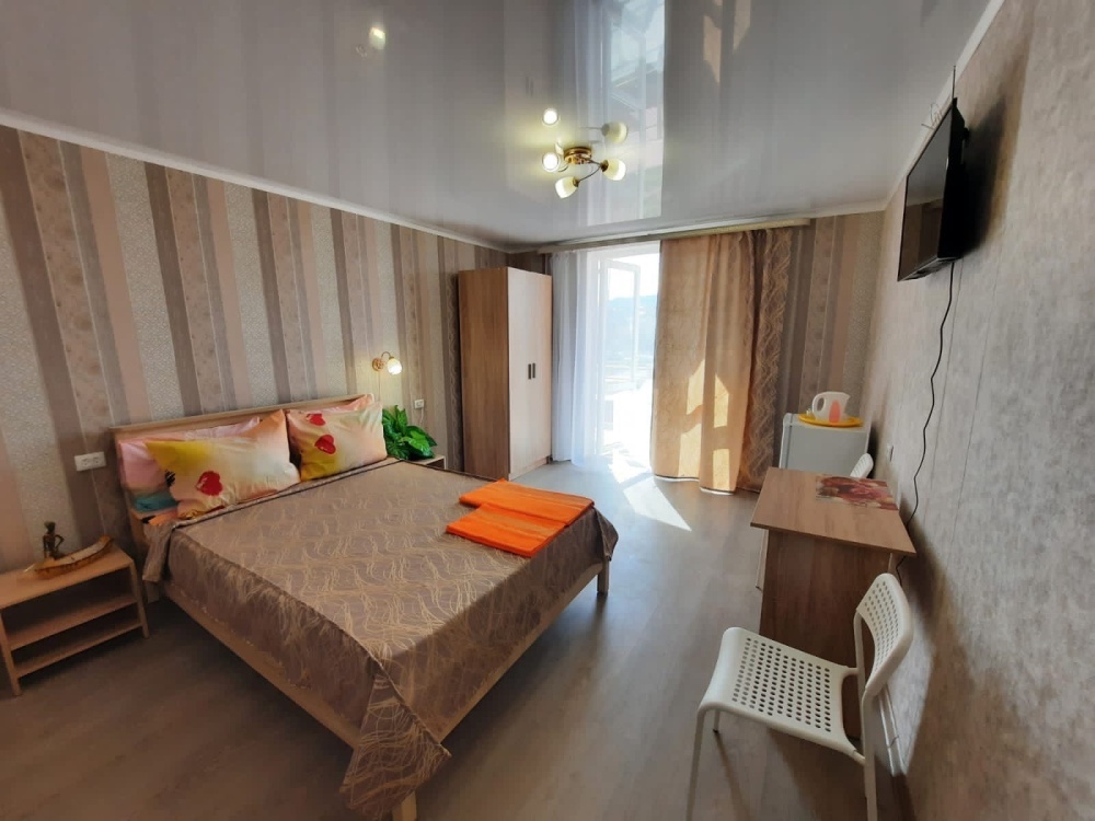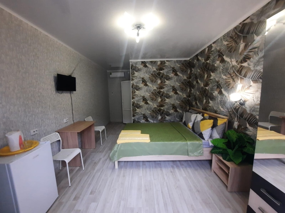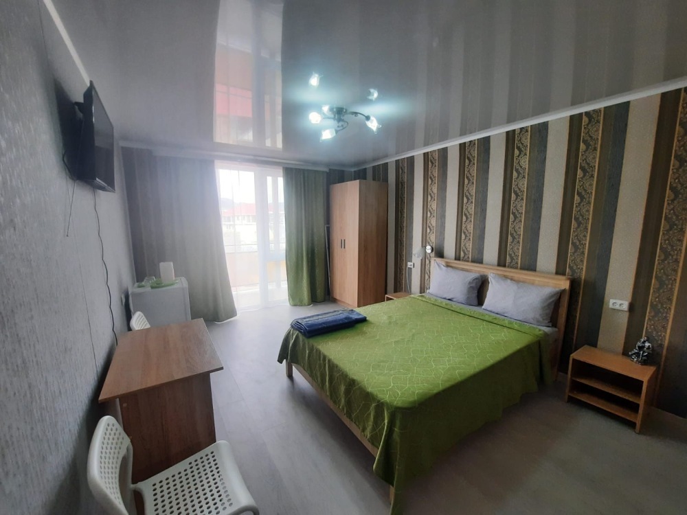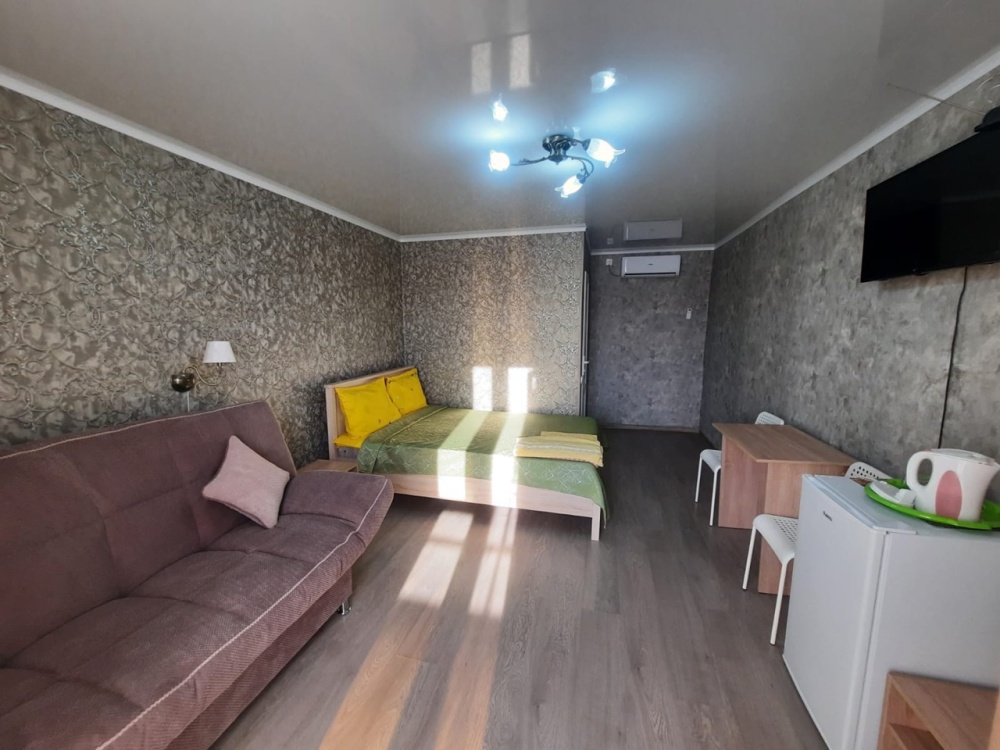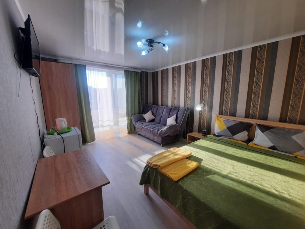 В номере: 2-местная кровать, раскладной диван на 2 человека, шкаф, стол, стулья, зеркало, кондиционер, телевизор, холодильник, чайник, посуда, сушилка для белья, интернет Wi-fi.