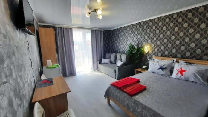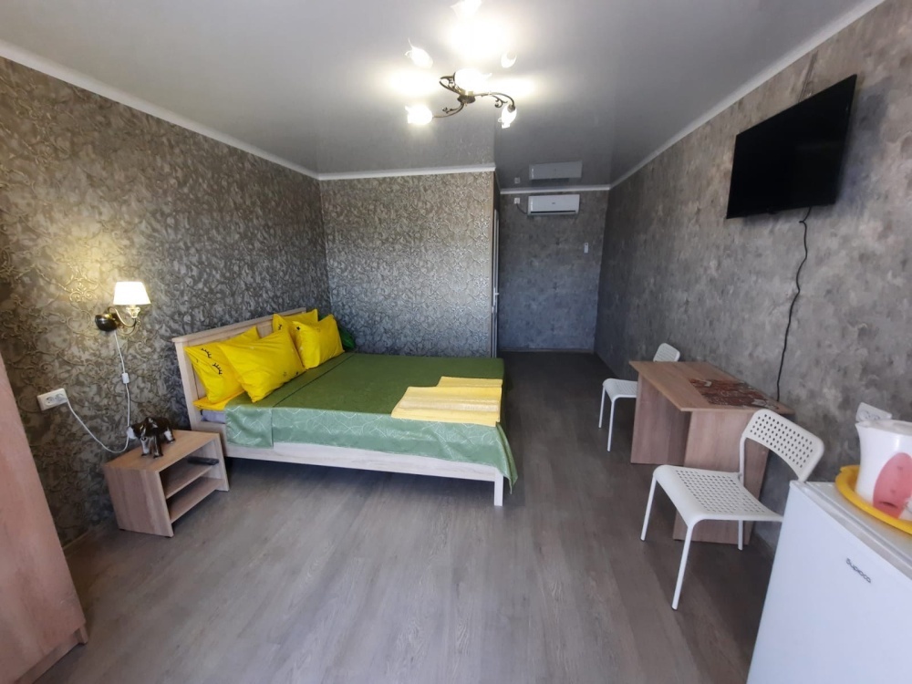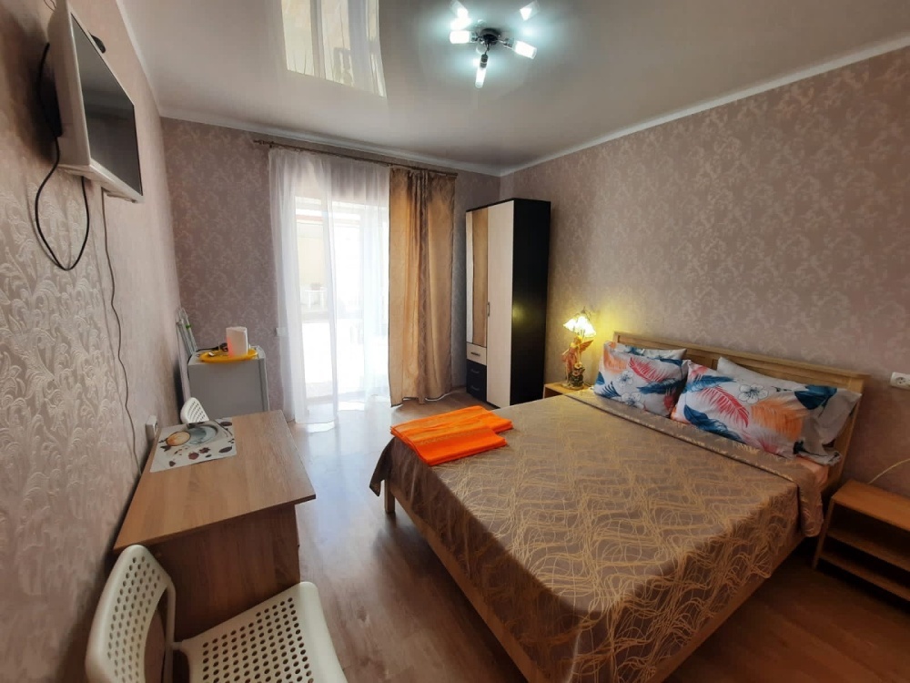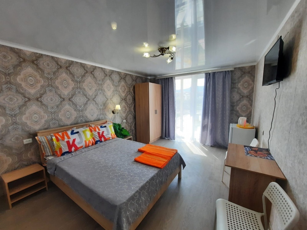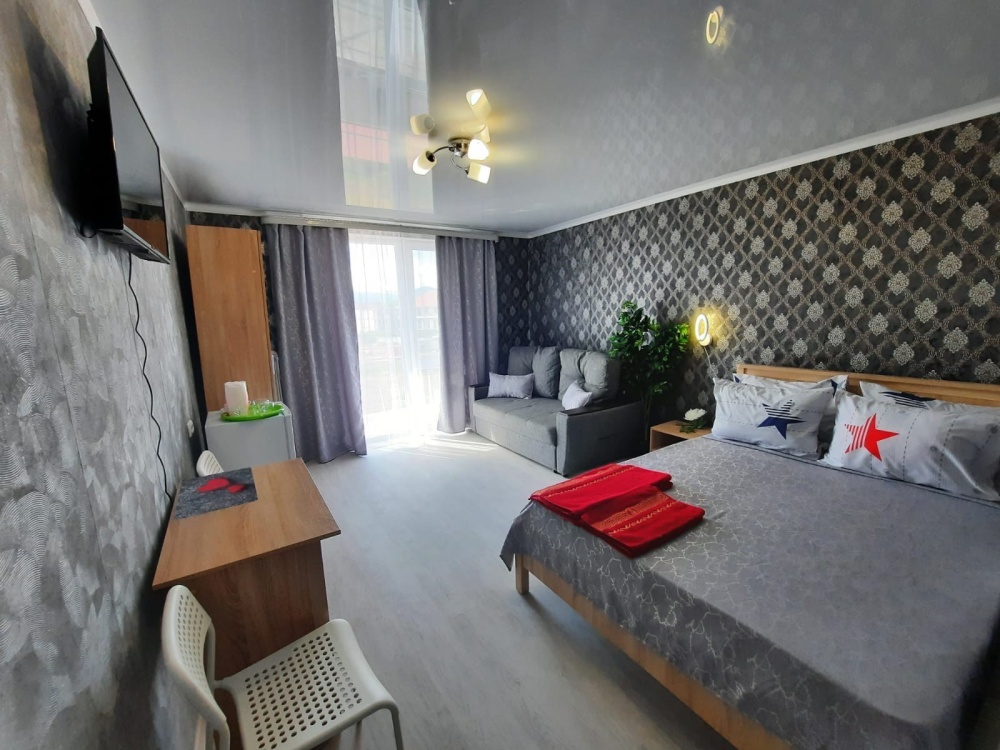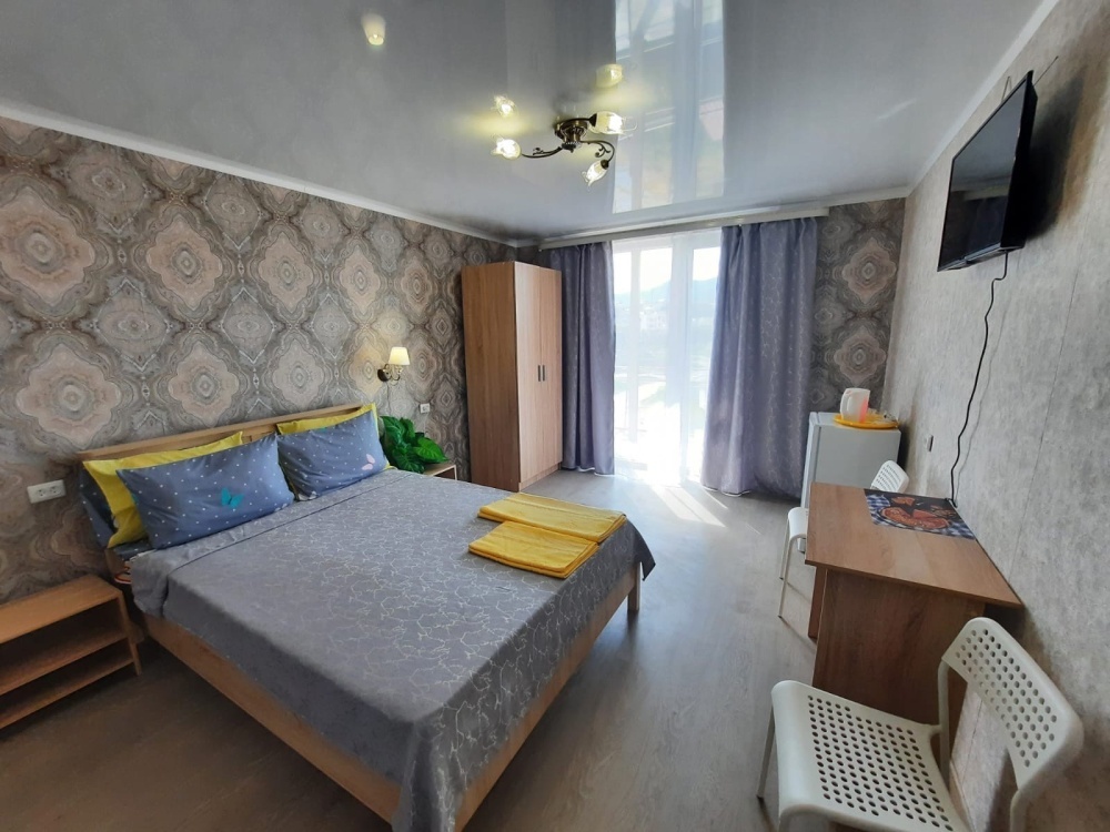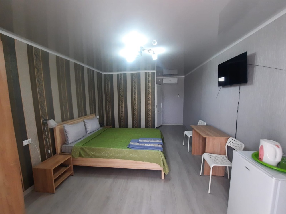 В номере: 2-местная кровать, раскладной диван на 2 человека, шкаф, стол, стулья, зеркало, кондиционер, телевизор, холодильник, чайник, посуда, сушилка для белья, интернет Wi-fi.
