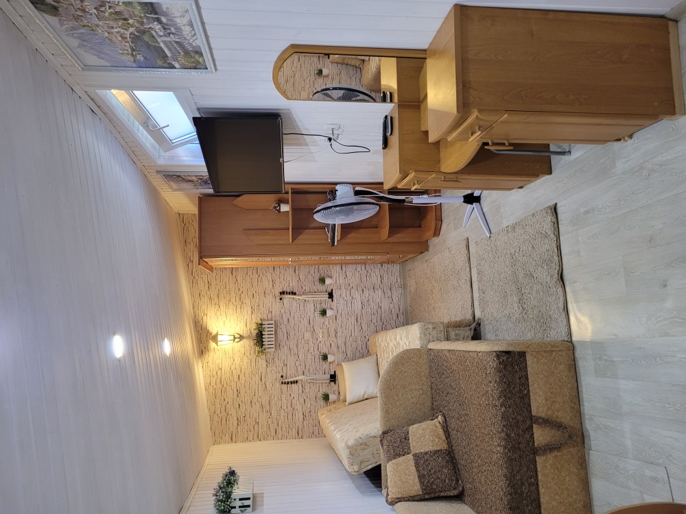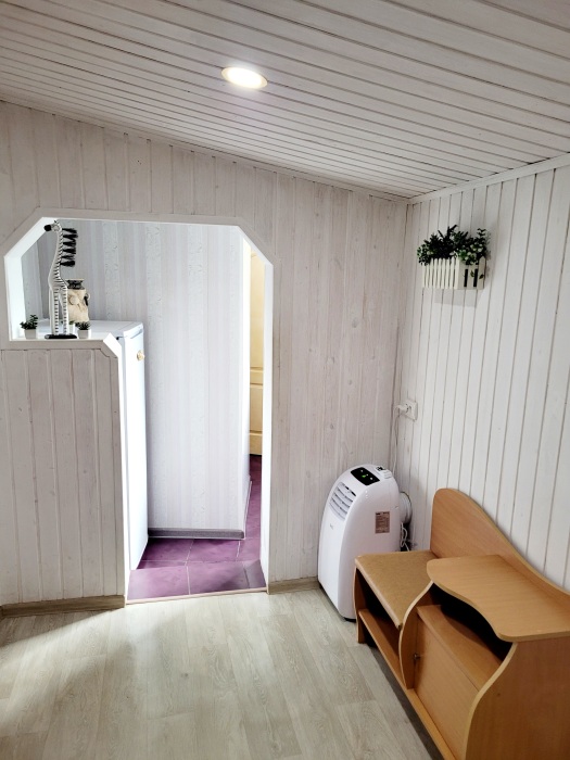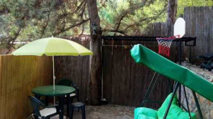 В домике: раскладной,односпальный диван шириной 0.90см,диван-книжка 2х спальный шириной 1м20,шкаф,трюмо,тумбочка,вентилятор на пульте,кондиционер,тв,вайфай.Санузел личный в домике.Кухня личная внутри домика,полностью укомплектована: газовая плита,холодильник,необходимая посуда,кухонная мебель.Рядом с домиком,в тени можжевеловых деревьев,стоит личный стол под зонтиком,кресла,качели,где можно кушать и отдыхать на свежем воздухе.