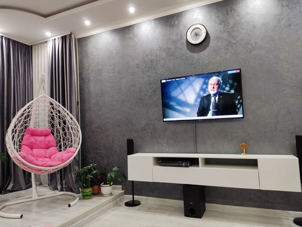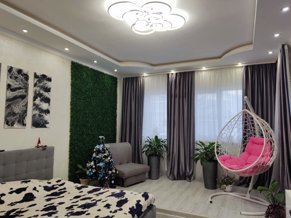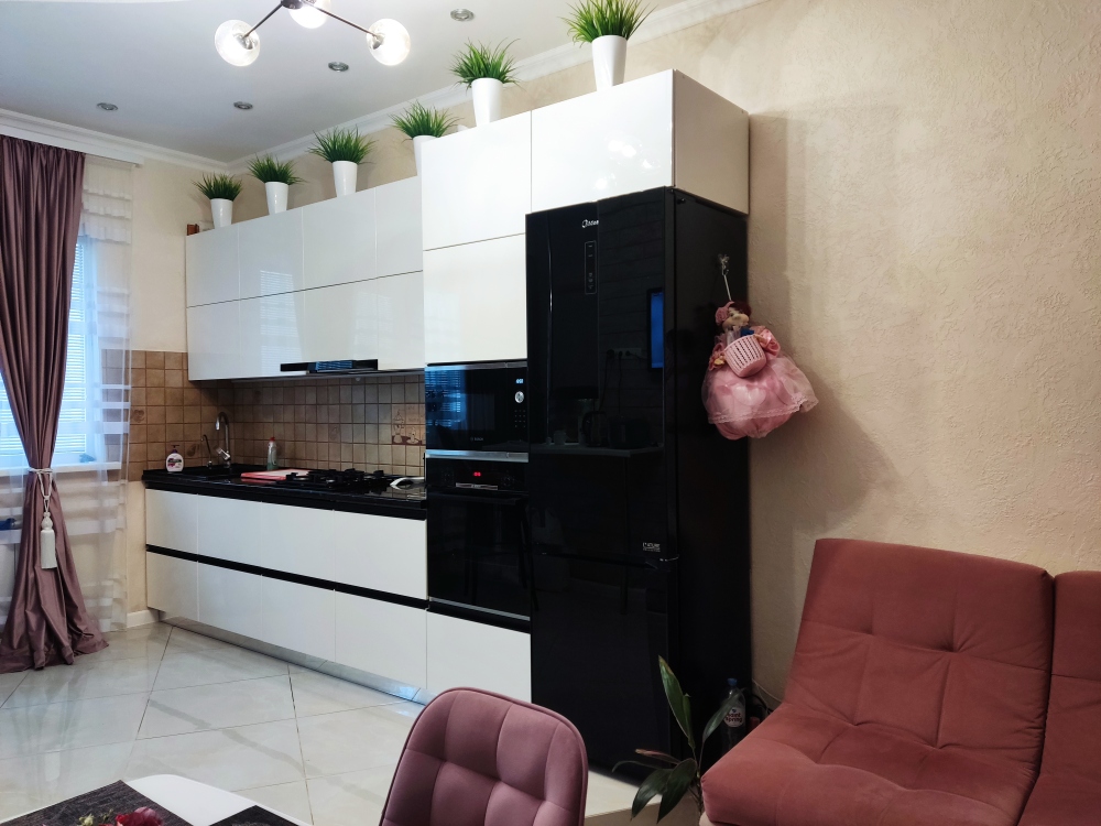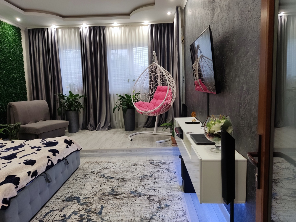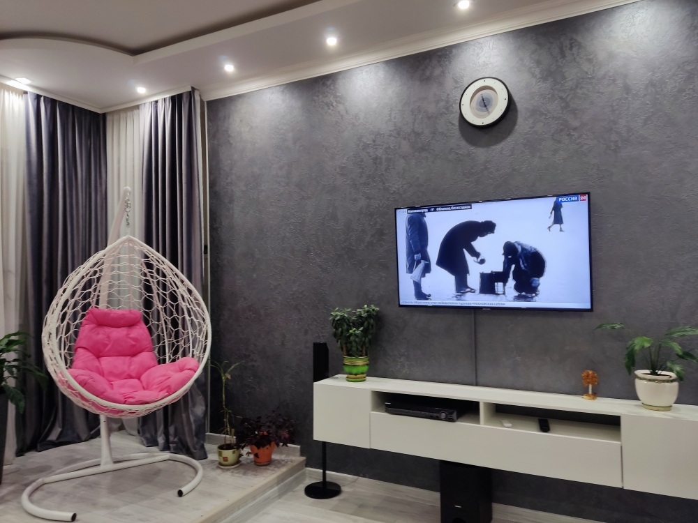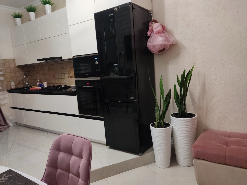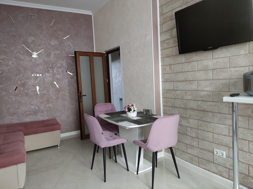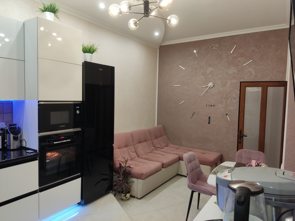 В каждой комнате имеются японские кондиционеры, большие плазменные телевизоры Самсунг нового поколения 4к 65 диагональ со СМАРТ ТВ, вай-фай. Имеется домашний кинотеатр Sony с акустической системой, стиральная машина 3д Lg с встроенной сушкой. Варочная поверхность, духовой шкаф, холодильник, пароутюг сокодавка, и другая техника фирмы БОШ, вся техника из чёрного стекла, контрастно сочетающаяся с белой глянцевой кухонной мебелью. Имеется система очищения воды Osmos. Мягкие пудровые велюровые кресла и шторы на кухне также сочетаются с декоративным камнем и декоративной штукатуркой, на которой пикантно смотряться большие настенные часы. В каждой комнате(на полу, потолке, кухне, тумбах и даже в санузле) имеются ледовские подсветки, всё очень красиво светиться в вечернее время, придавая романтическую обстановку. Гламурность помещению придаёт искусственная и натуральная зелень, представленная большим настенным панно, отдельными экибано и красивыми напольными кашпо. Так же в помещении для релаксации есть аквариум с декоративными рыбками. На окнах везде москитные сетки и жалюзи. Санузел совмещённый, выложен плиткой 120 на 90 мрамор, чёрная сантехника подчёркивает элегантность помещения, имеется тропический и гигиенический душ. Придомовая очень зеленая территория у подножия Медведь-горы с видом на крымские горы, утопающая в зелени кипарисов и олеандров, эстетически оформлена, имеется беседка с мангальной зонрй, где можно насладиться пением птиц вдали от городской суеты, имеется также бесплатная парковка. Наши гости иногда называют её сказочной, так как там присутствуют элементы сказочных персонажей (аисты, совы, олени, мышата, крот, дятел, избушка на курьих ножках бабы Яги). Также имеется просторный балкон с плетёной мебелью, где можно посидеть с чашечкой кофе. В коттедже идеальная чистота, поэтому хотим тоже видеть у себя гостей, любящих и поддерживающих чистоту и порядок