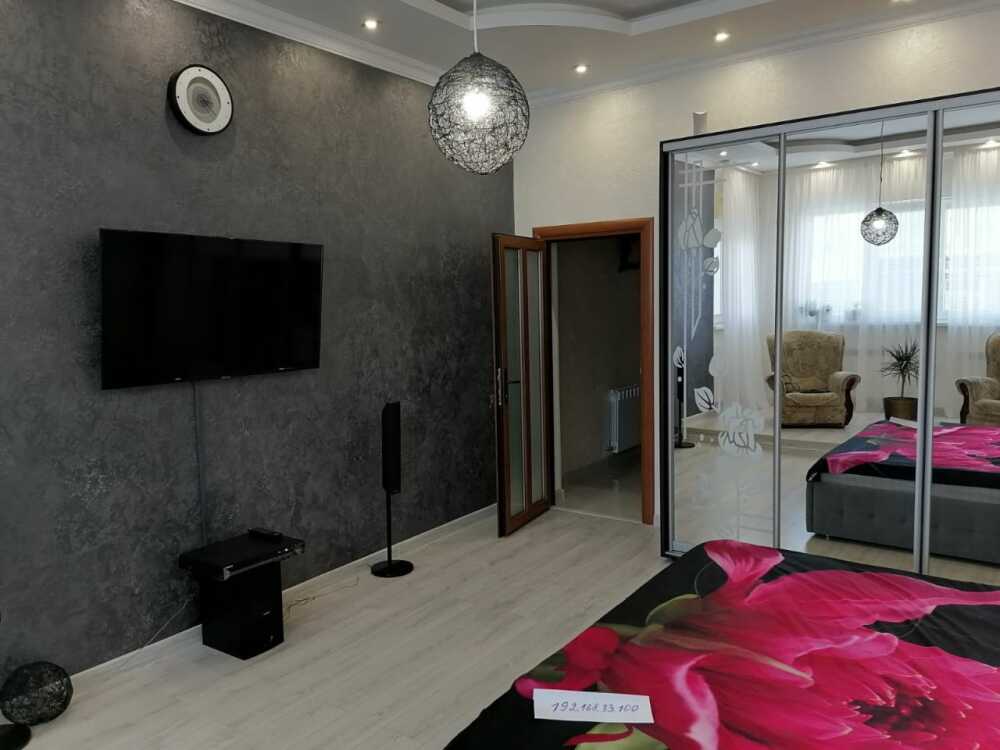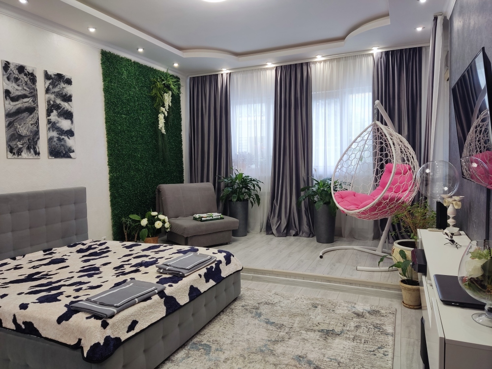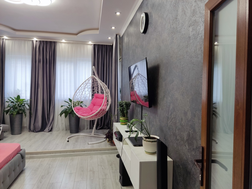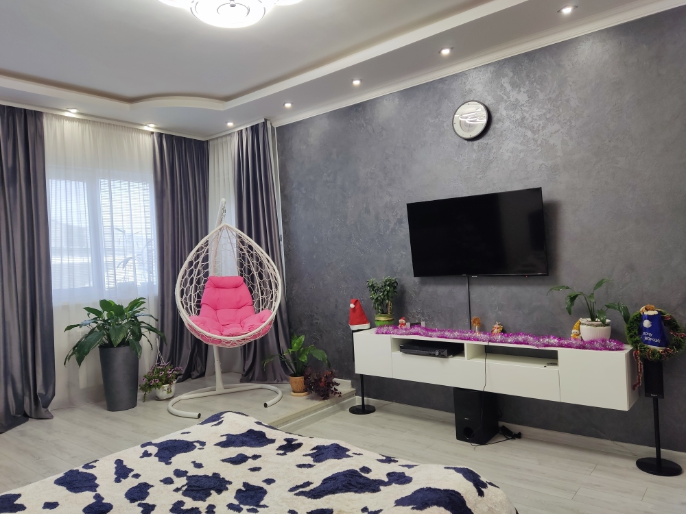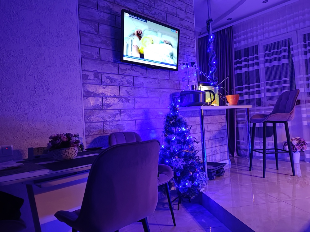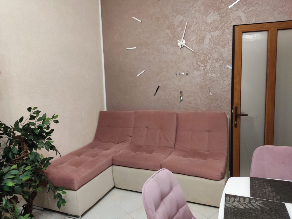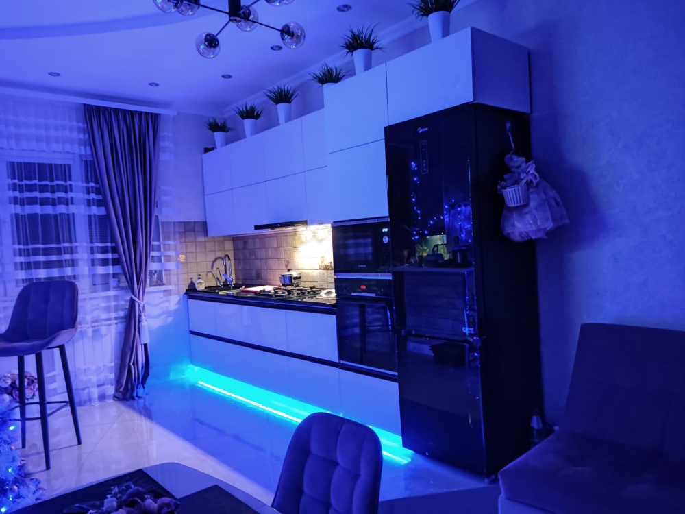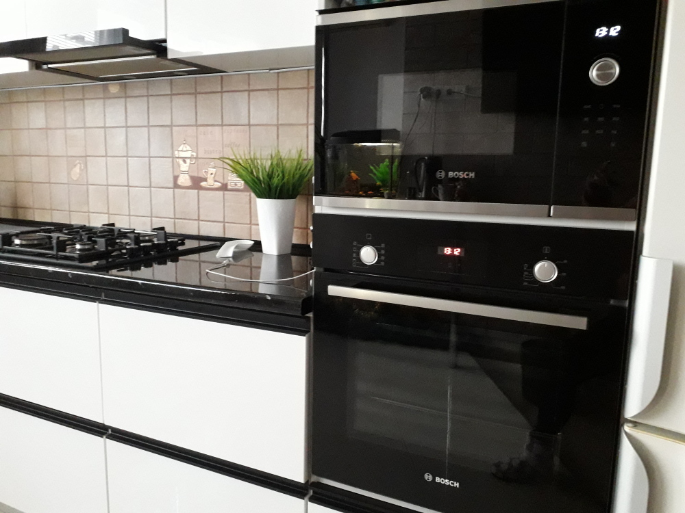 В каждой комнате имеются японские кондиционеры, большие плазменные телевизоры Самсунг нового поколения 4к 65 диагональ со СМАРТ ТВ, вай-фай. Имеется домашний кинотеатр Sony с акустической системой, стиральная машина 3д Lg с встроенной сушкой. Варочная поверхность, духовой шкаф, холодильник, пароутюг сокодавка, и другая техника фирмы БОШ, вся техника из чёрного стекла, контрастно сочетающаяся с белой глянцевой кухонной мебелью. Имеется система очищения воды Osmos. Мягкие пудровые велюровые кресла и шторы на кухне также сочетаются с декоративным камнем и декоративной штукатуркой, на которой пикантно смотряться большие настенные часы. В каждой комнате(на полу, потолке, кухне, тумбах и даже в санузле) имеются ледовские подсветки, всё очень красиво светиться в вечернее время, придавая романтическую обстановку. Гламурность помещению придаёт искусственная и натуральная зелень, представленная большим настенным панно, отдельными экибано и красивыми напольными кашпо. Так же в помещении для релаксации есть аквариум с декоративными рыбками. На окнах везде москитные сетки и жалюзи. Санузел совмещённый, выложен плиткой 120 на 90 мрамор, чёрная сантехника подчёркивает элегантность помещения, имеется тропический и гигиенический душ. Придомовая очень зеленая территория у подножия Медведь-горы с видом на крымские горы, утопающая в зелени кипарисов и олеандров, эстетически оформлена, имеется беседка с мангальной зонрй, где можно насладиться пением птиц вдали от городской суеты, имеется также бесплатная парковка. Наши гости иногда называют её сказочной, так как там присутствуют элементы сказочных персонажей (аисты, совы, олени, мышата, крот, дятел, избушка на курьих ножках бабы Яги). Также имеется просторный балкон с плетёной мебелью, где можно посидеть с чашечкой кофе. В коттедже идеальная чистота, поэтому хотим тоже видеть у себя гостей, любящих и поддерживающих чистоту и порядок