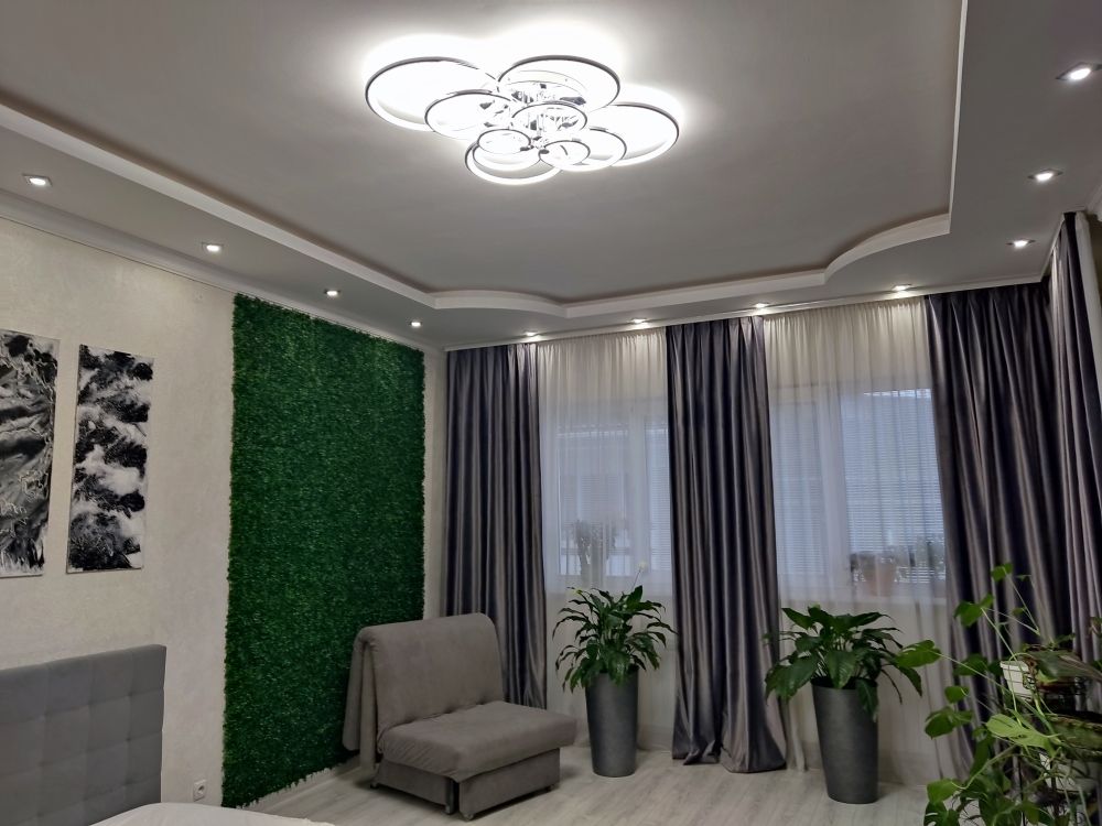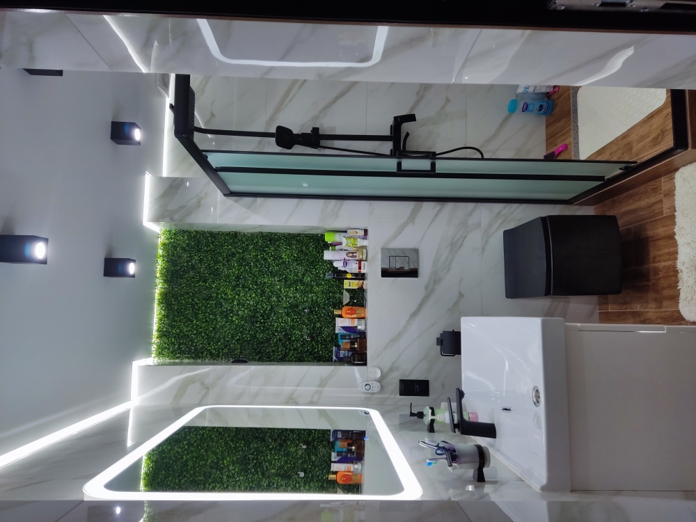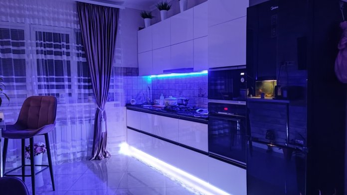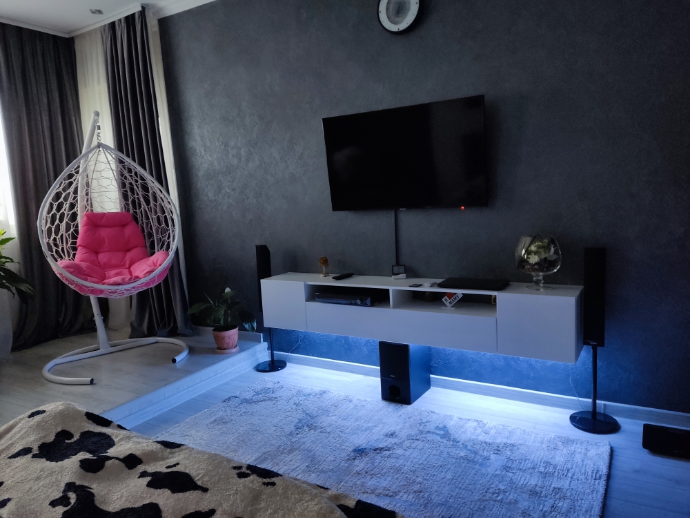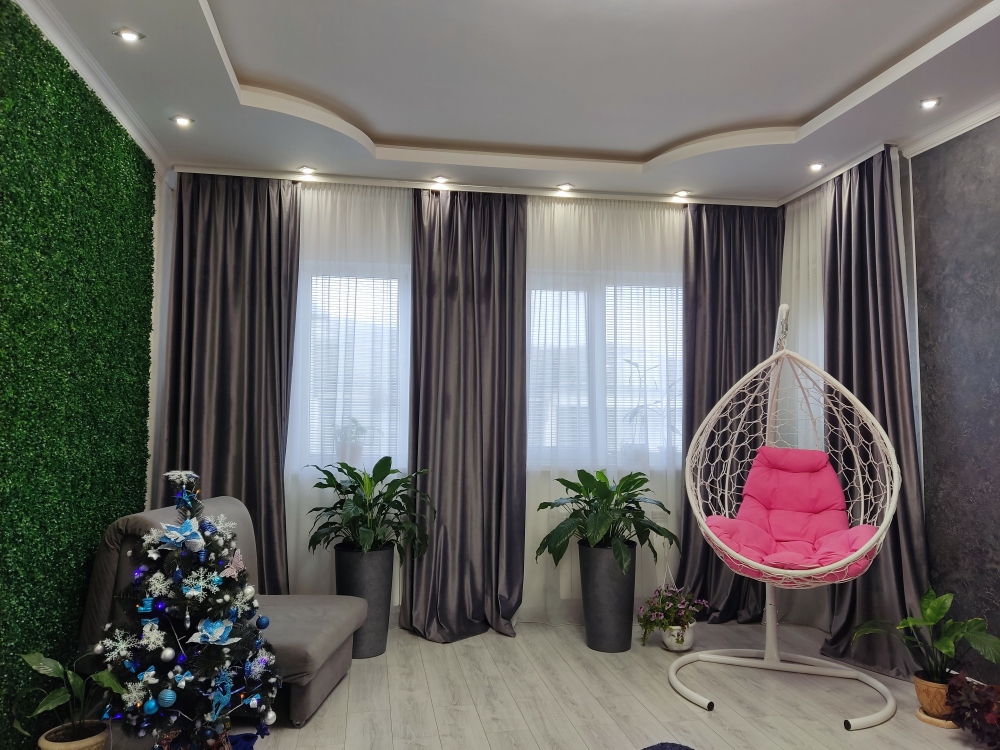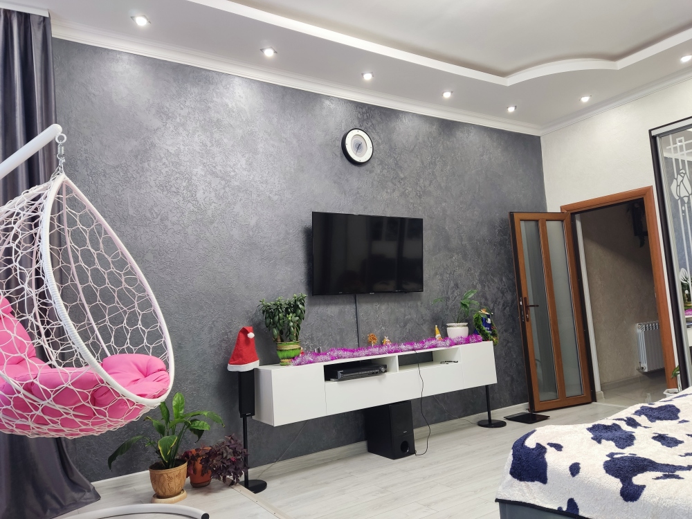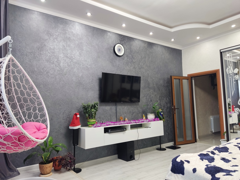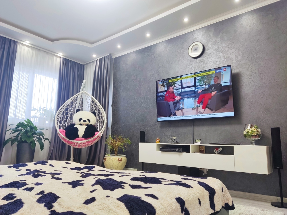 В каждой комнате имеются японские кондиционеры, большие плазменные телевизоры Самсунг нового поколения 4к 65 диагональ со СМАРТ ТВ, вай-фай. Имеется домашний кинотеатр Sony с акустической системой, стиральная машина 3д Lg с встроенной сушкой. Варочная поверхность, духовой шкаф, холодильник, пароутюг сокодавка, и другая техника фирмы БОШ, вся техника из чёрного стекла, контрастно сочетающаяся с белой глянцевой кухонной мебелью. Имеется система очищения воды Osmos. Мягкие пудровые велюровые кресла и шторы на кухне также сочетаются с декоративным камнем и декоративной штукатуркой, на которой пикантно смотряться большие настенные часы. В каждой комнате(на полу, потолке, кухне, тумбах и даже в санузле) имеются ледовские подсветки, всё очень красиво светиться в вечернее время, придавая романтическую обстановку. Гламурность помещению придаёт искусственная и натуральная зелень, представленная большим настенным панно, отдельными экибано и красивыми напольными кашпо. Так же в помещении для релаксации есть аквариум с декоративными рыбками. На окнах везде москитные сетки и жалюзи. Санузел совмещённый, выложен плиткой 120 на 90 мрамор, чёрная сантехника подчёркивает элегантность помещения, имеется тропический и гигиенический душ. Придомовая очень зеленая территория у подножия Медведь-горы с видом на крымские горы, утопающая в зелени кипарисов и олеандров, эстетически оформлена, имеется беседка с мангальной зонрй, где можно насладиться пением птиц вдали от городской суеты, имеется также бесплатная парковка. Наши гости иногда называют её сказочной, так как там присутствуют элементы сказочных персонажей (аисты, совы, олени, мышата, крот, дятел, избушка на курьих ножках бабы Яги). Также имеется просторный балкон с плетёной мебелью, где можно посидеть с чашечкой кофе. В коттедже идеальная чистота, поэтому хотим тоже видеть у себя гостей, любящих и поддерживающих чистоту и порядок