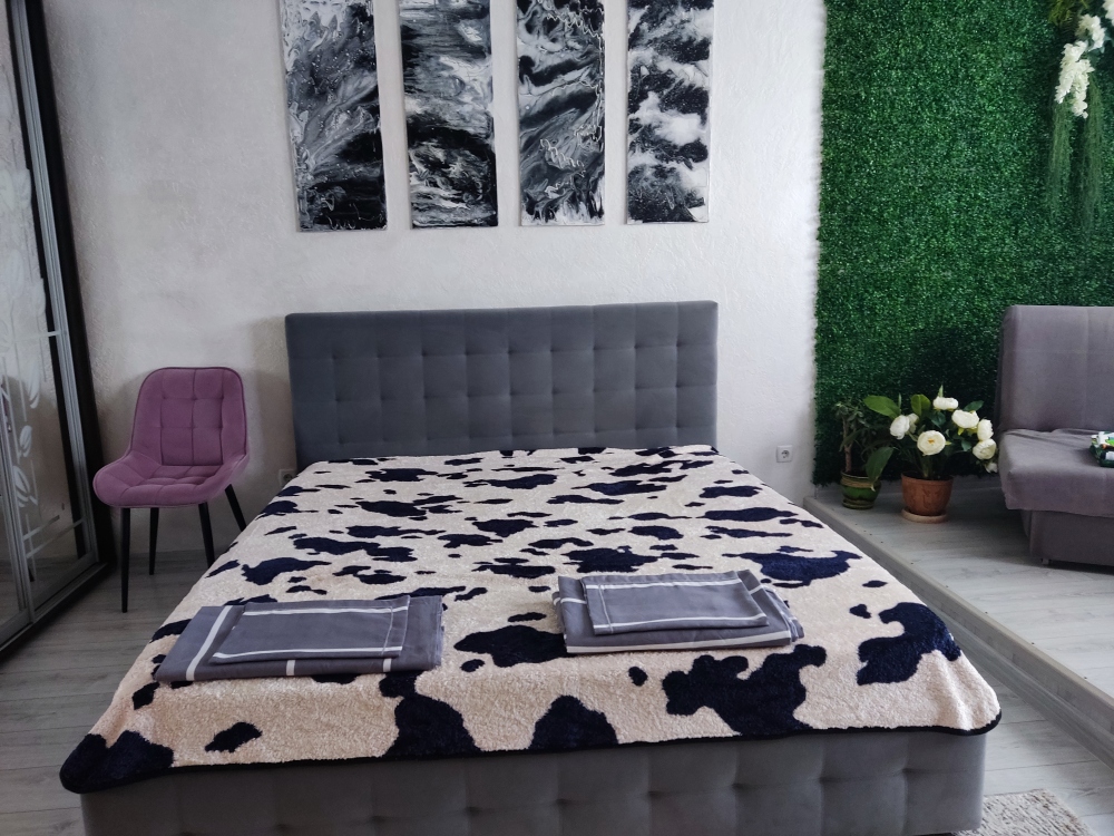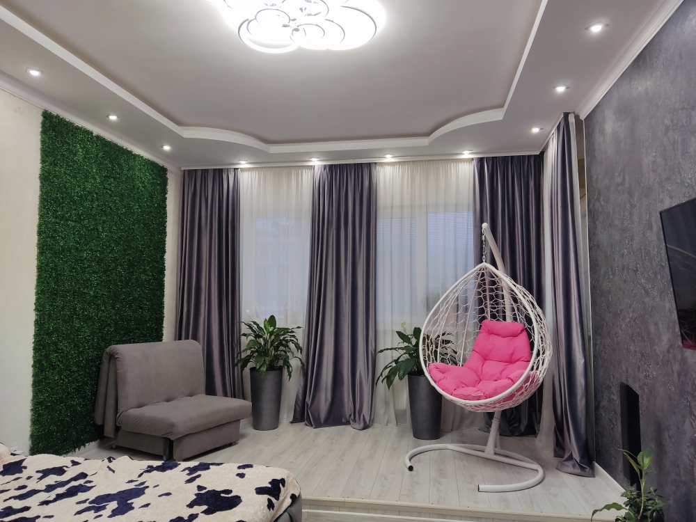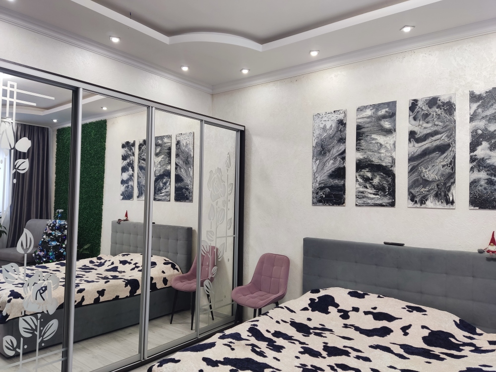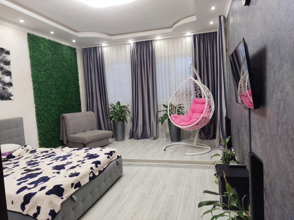 Этаж из 2 комнат, из них одна спальня с большой кроватью 180 на 200 с новым ортопедическим матрасом на кокосовой койре и вторая гостинная-студия тоже с большим двуспальным ортопедическим диваном. Комнаты большие по площади по 27 квадратных метров и с высокими потолками по 3 метра.