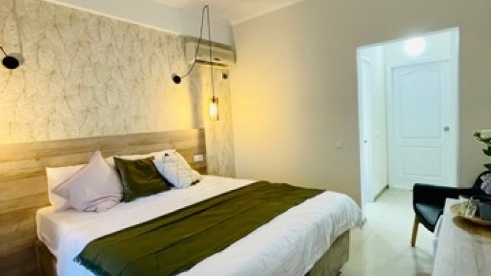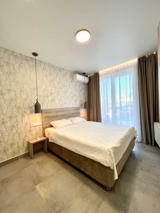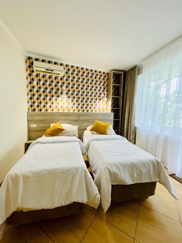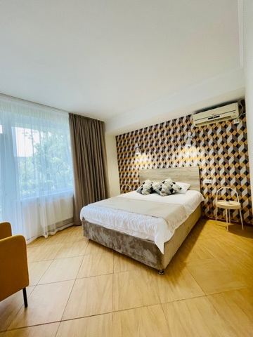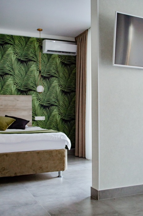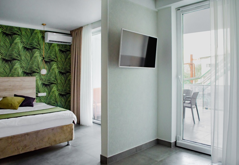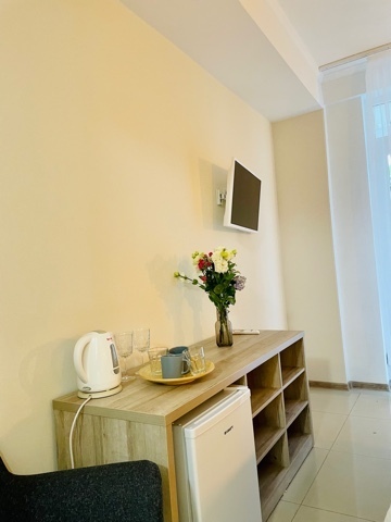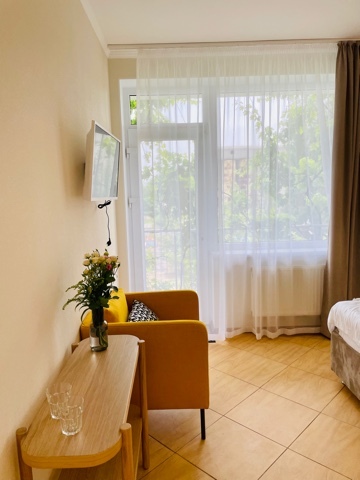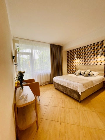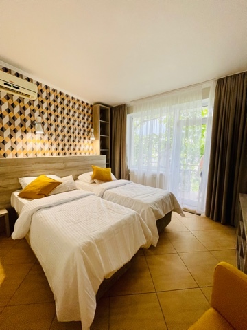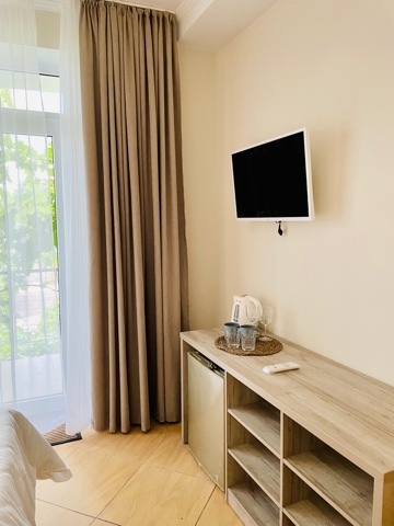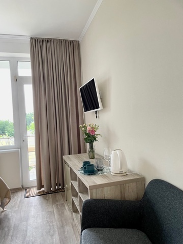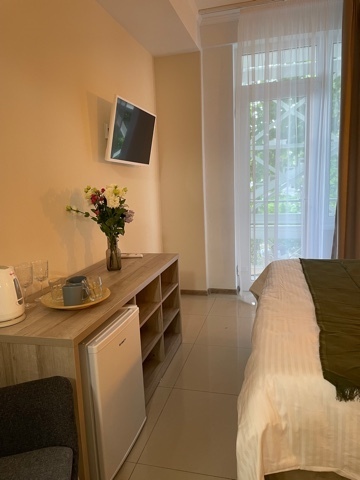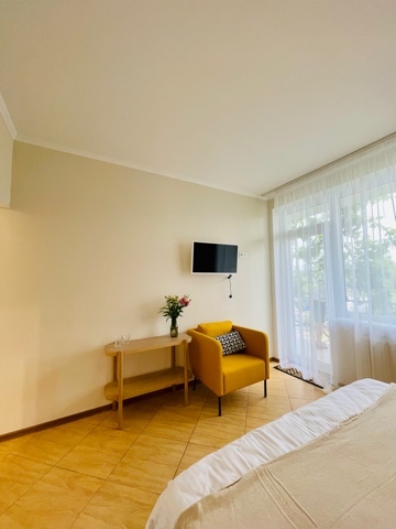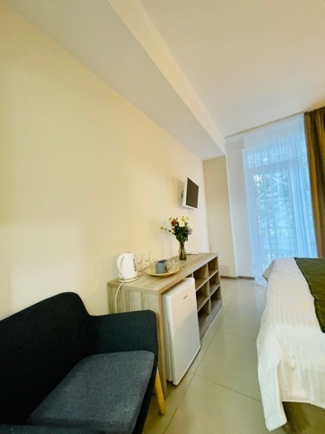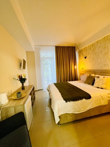 Элегантные номера оснащены кондиционером, телевизором с плоским экраном и спутниковыми каналами, холодильником, электрочайник, посудой (тарелки, ложки, вилки, стаканы, чашки). В каждом номере есть балкон. На балконе стол и стулья для отдыха. В номерах удобная современная мебель, ортопедические матрасы. Предоставляются постельные принадлежности, комплект полотенец.