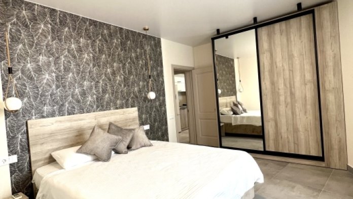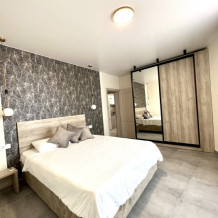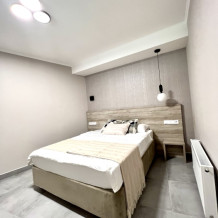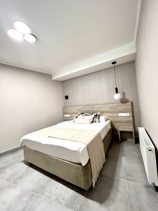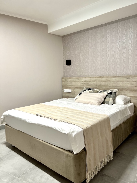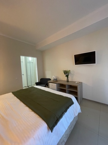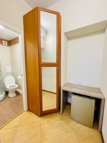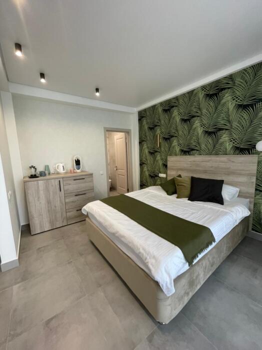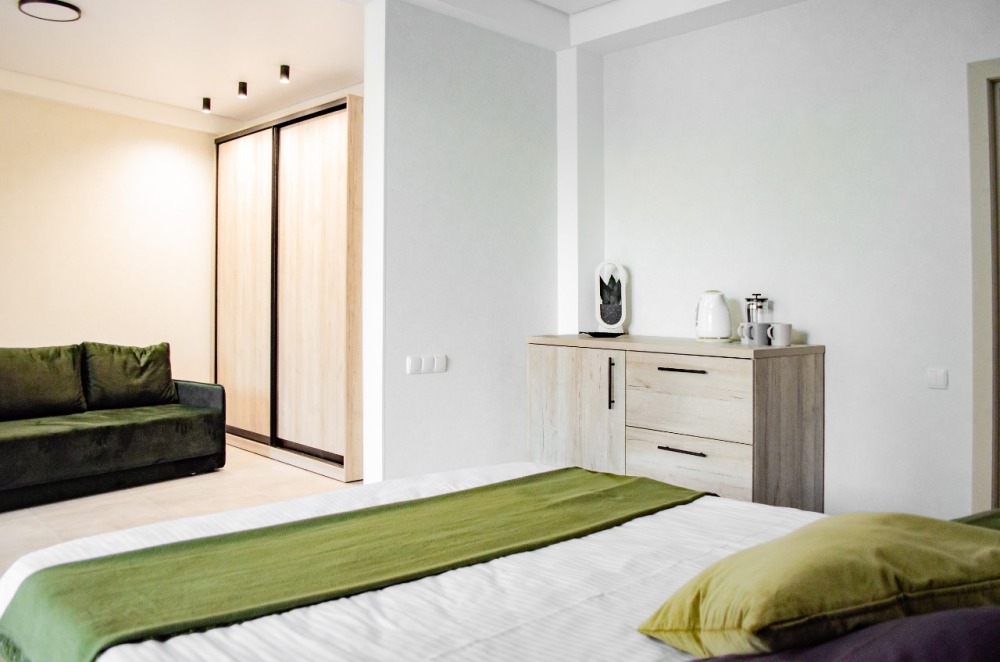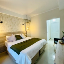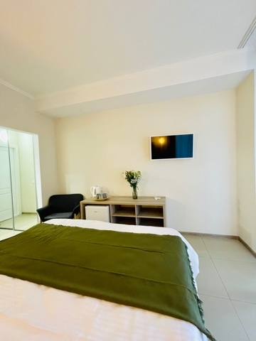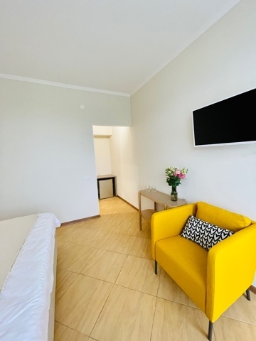 Номер с одной большой кроватью, возможно одно дополнительное спальное место. Детям до 4-х лет - кроватка бесплатно. Просторная комната с удобным креслом, журнальным столиком и телевизором. Также в номере есть холодильник для хранения еды и стандартный набор посуды, электрочайник.