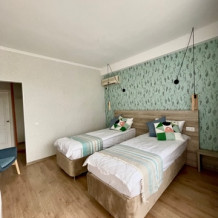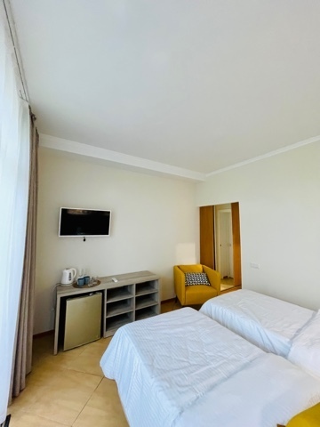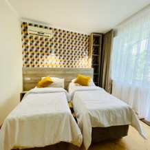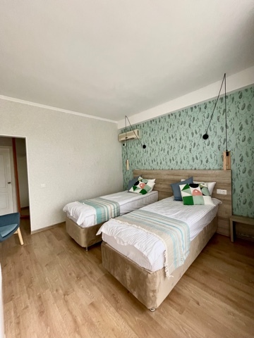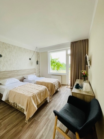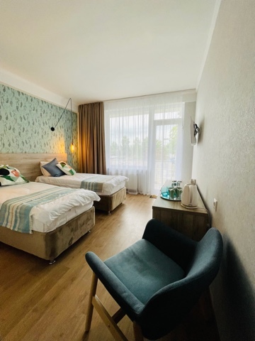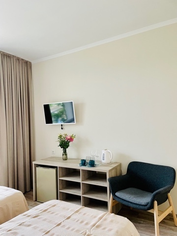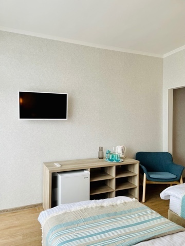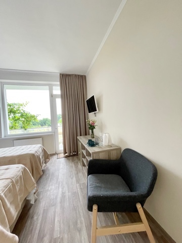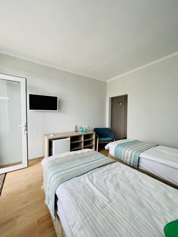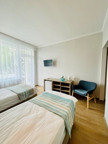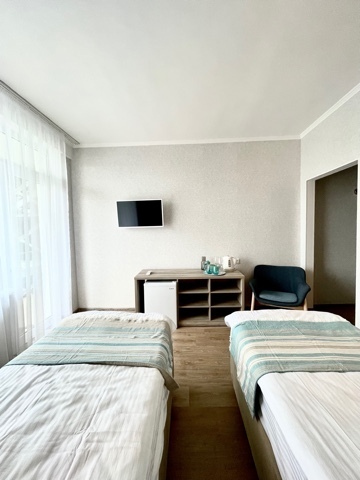 Номер с двумя кроватями, возможно одно дополнительное спальное место. Детям до 4-х лет - кроватка бесплатно. Просторная комната с удобным креслом, журнальным столиком и телевизором. Также в номере есть холодильник для хранения еды и стандартный набор посуды, электрочайник.