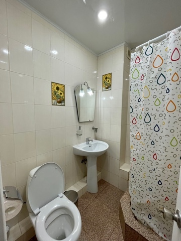 Удобная ванная комната со всеми необходимыми косметическими принадлежностями.
