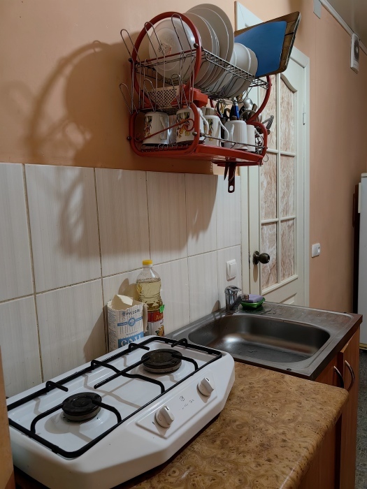 На общей кухне имеется: микроволновка, электрический чайник, посуда, кухонный гарнитур, газовая плита.