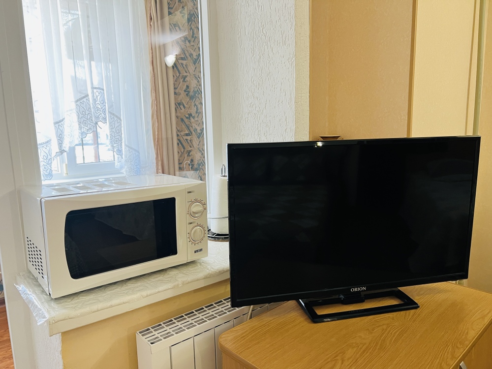 В номере микроволновая печь, есть посуда.