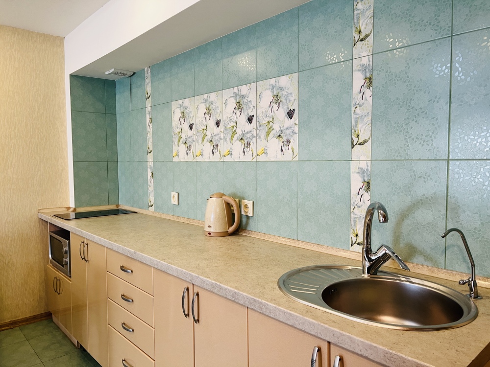 В номере смежные комнаты, есть посуда, микроволновая печь, электрочайник, варочная поверхность, фильтр питьевой воды. Номер с ванной.