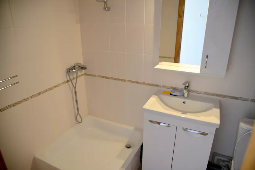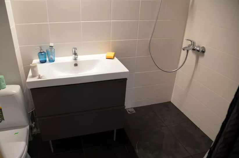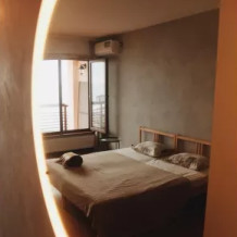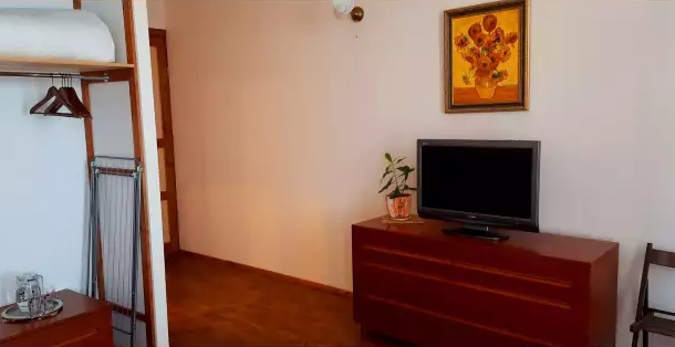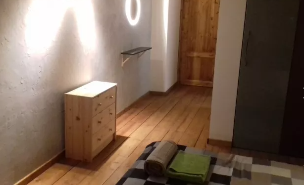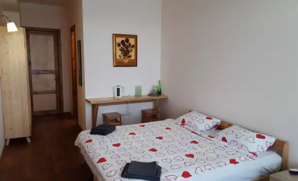 В номере двухспальная кровать и детская кровать. Холодильник на этаже.