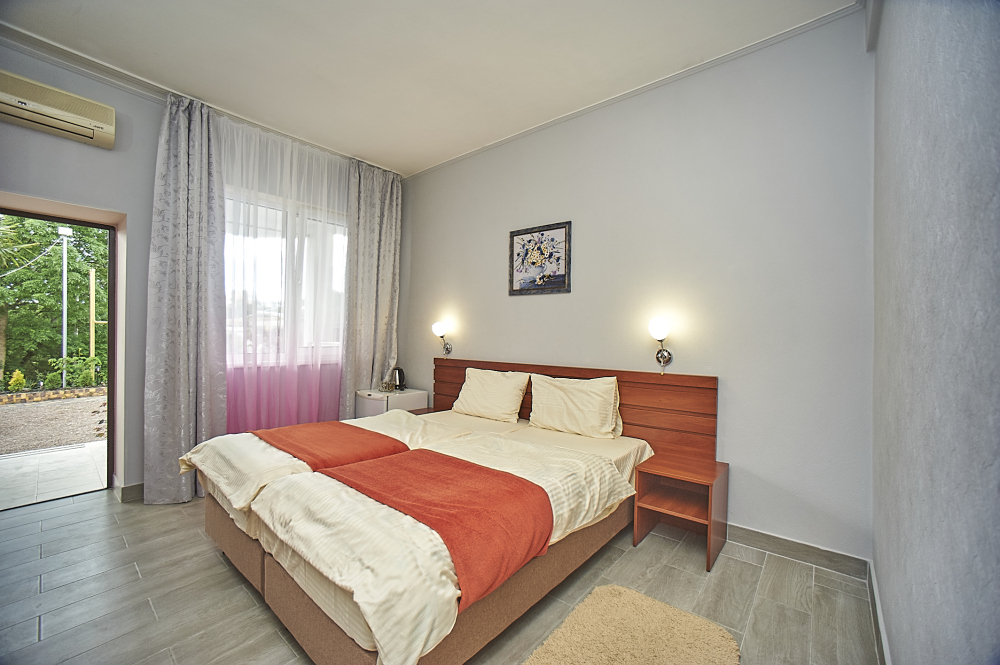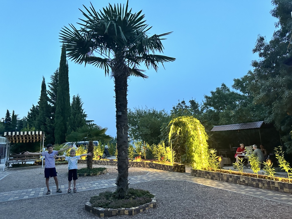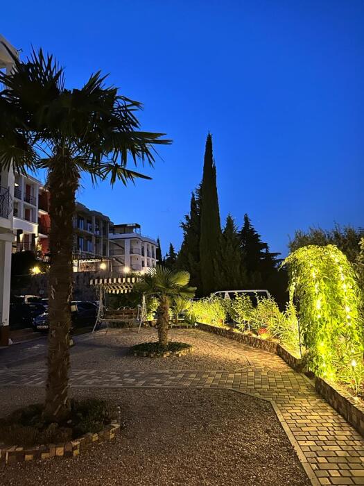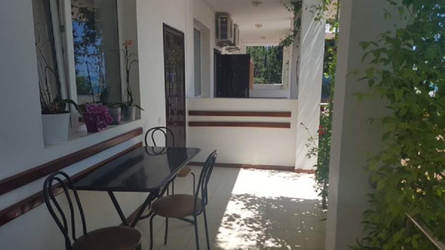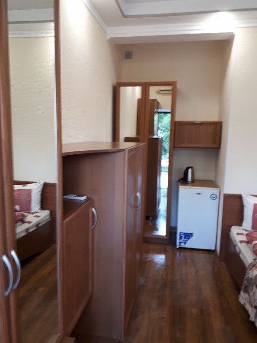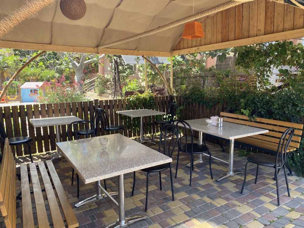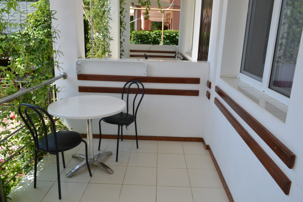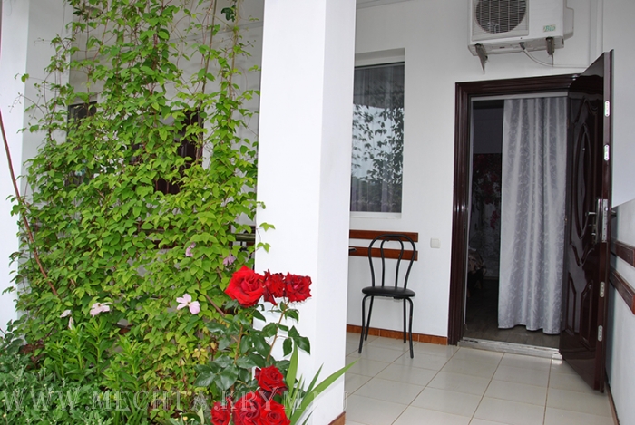 С каждого номера выход в общий уютный зеленый дворик. На балкончиках стоят столики со стульями для отдыха.