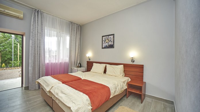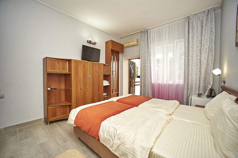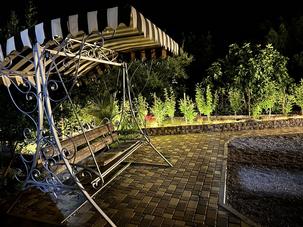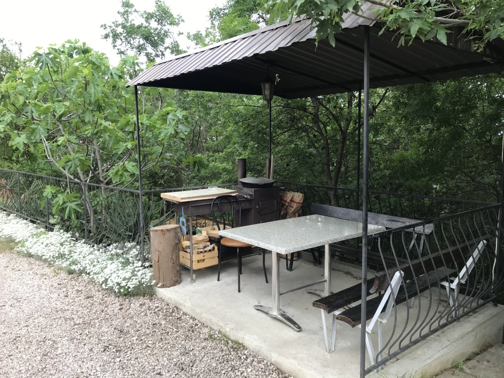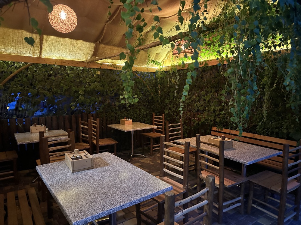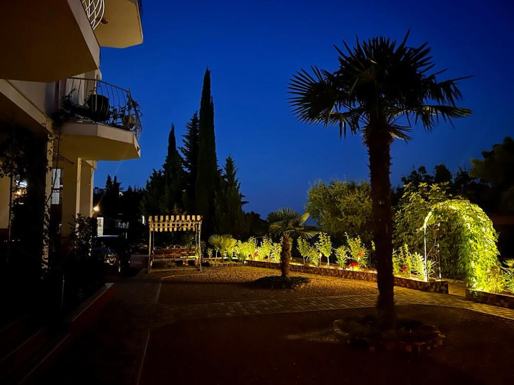 С каждого номера выход в общий уютный зеленый дворик. На балкончиках стоят столики со стульями для отдыха.