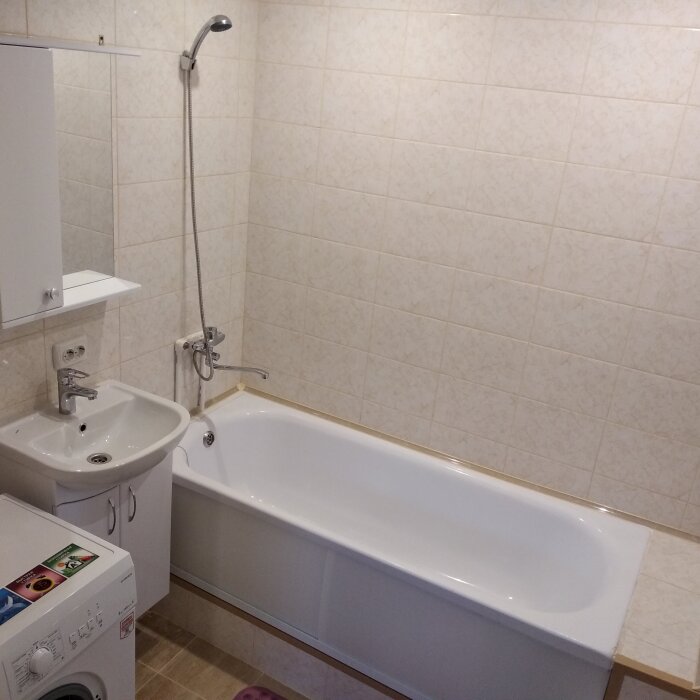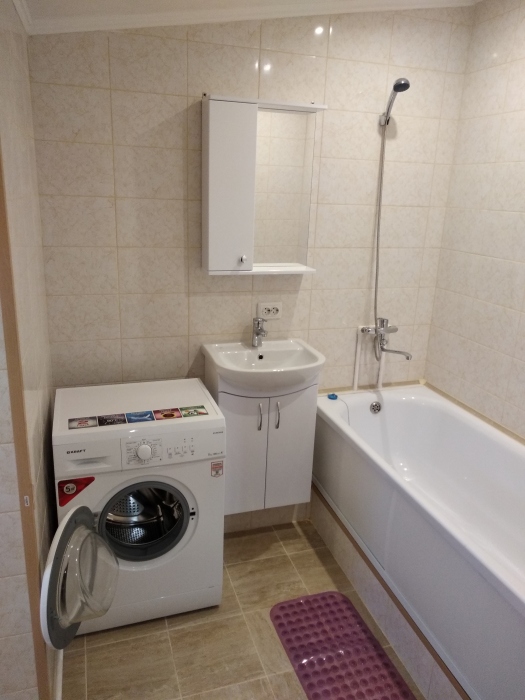 Смена белья один раз в 5-7 дней. В ванной комнате - ванна, унитаз, стиральная машинка, умывальник, навесной шкафчик с зеркалом, фен, утюг, гладильная доска, сушилка для белья.