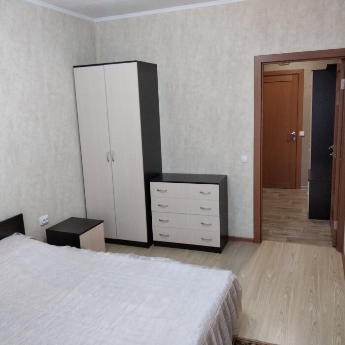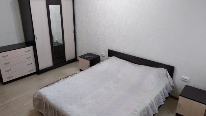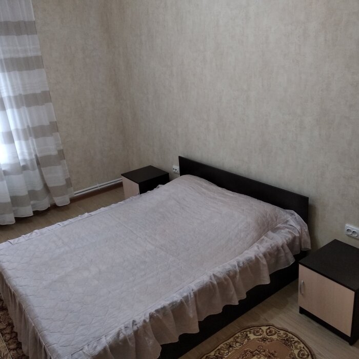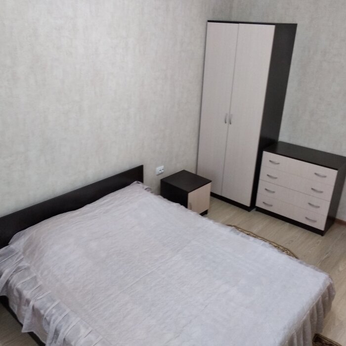 В спальне № 1 находится кровать 1600х2000, две прикроватные тумбочки, шкаф, комод, телевизор, кондиционер, коврики.