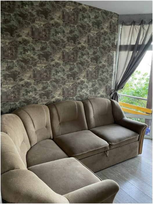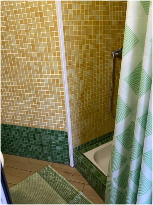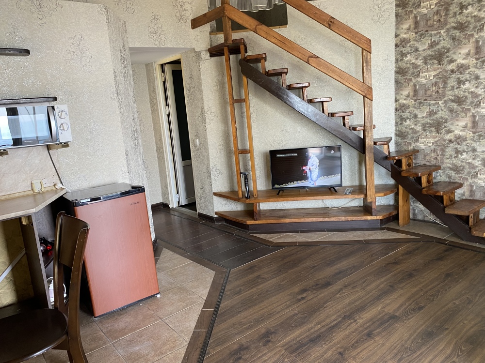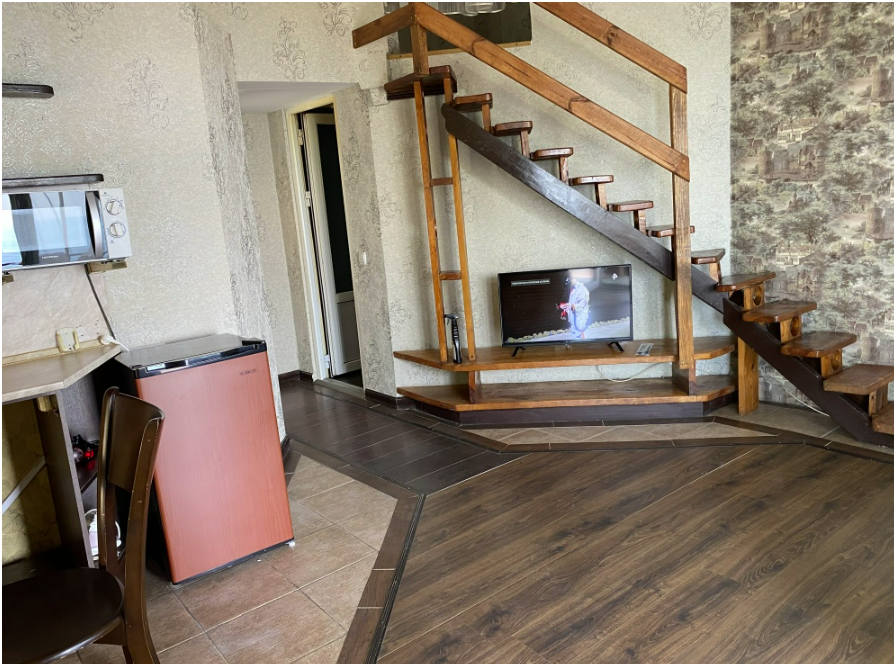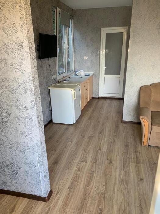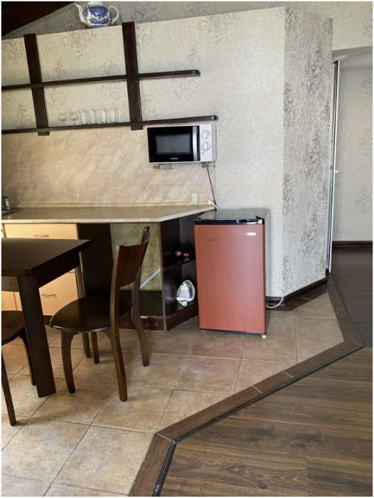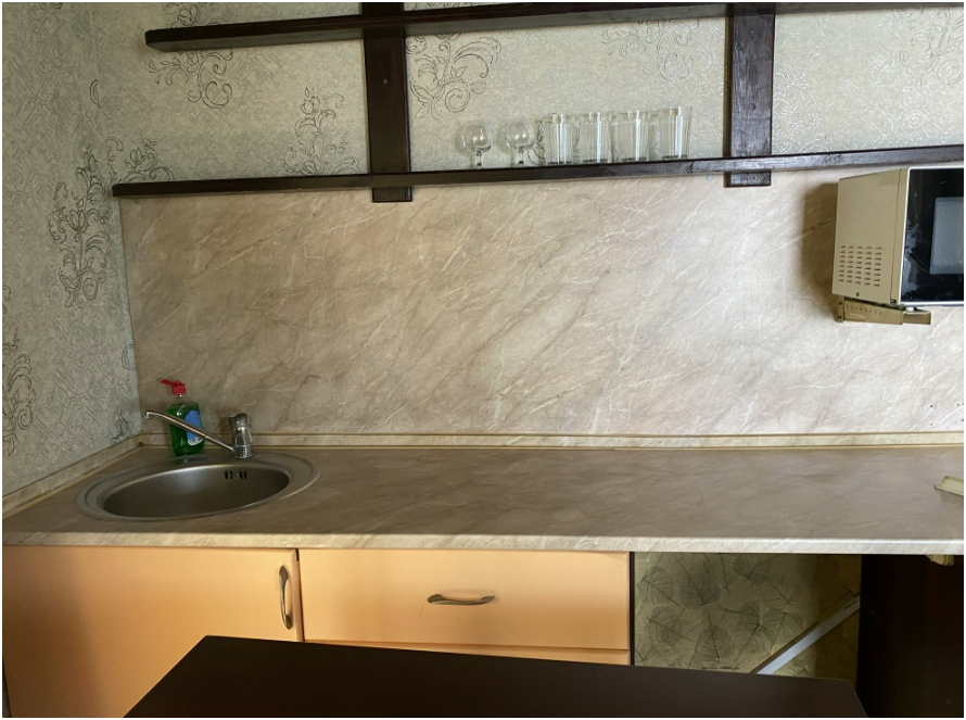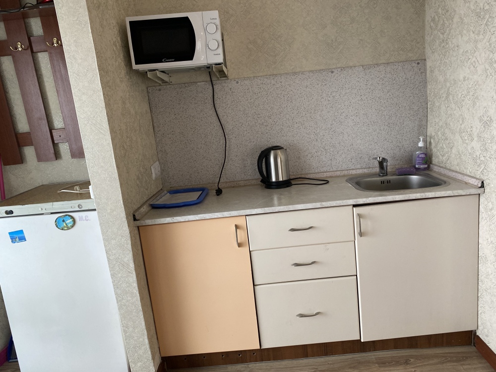 Есть мини-кухня: раковина, электрочайник, СВЧ-печь, набор посуды.