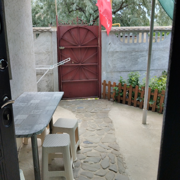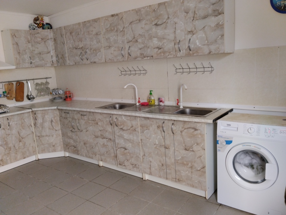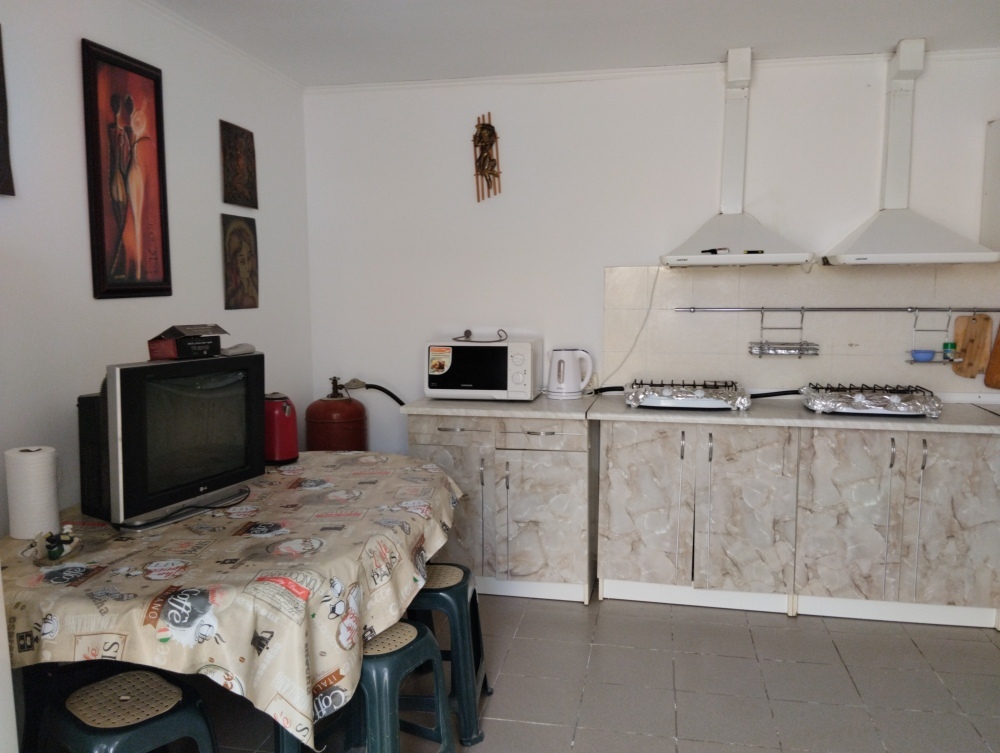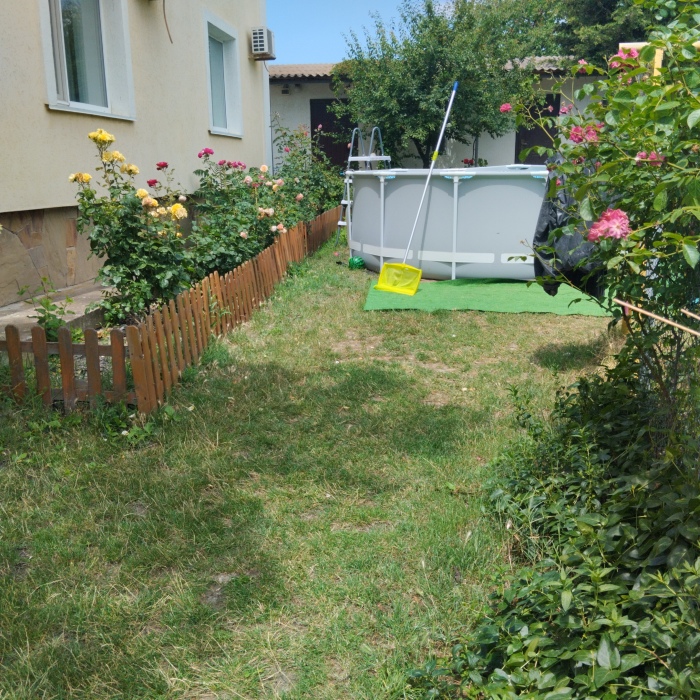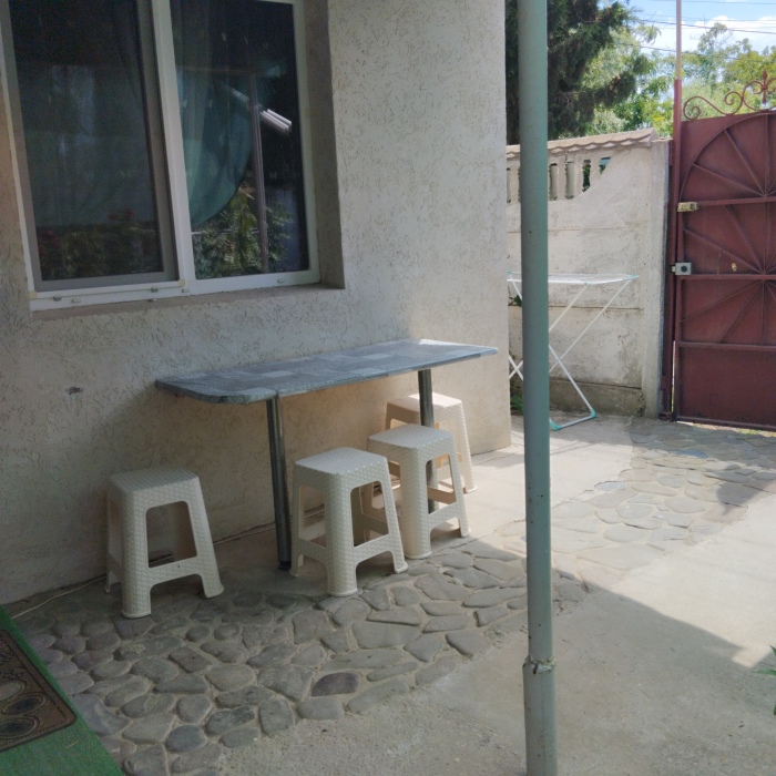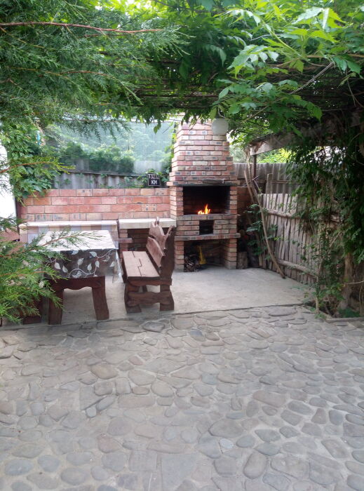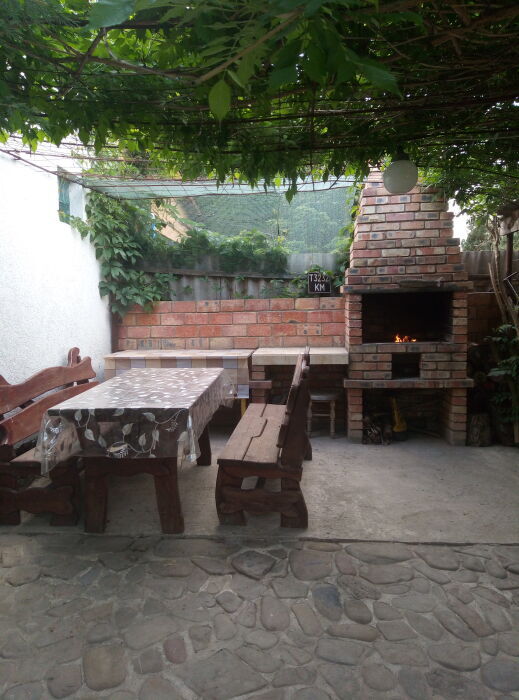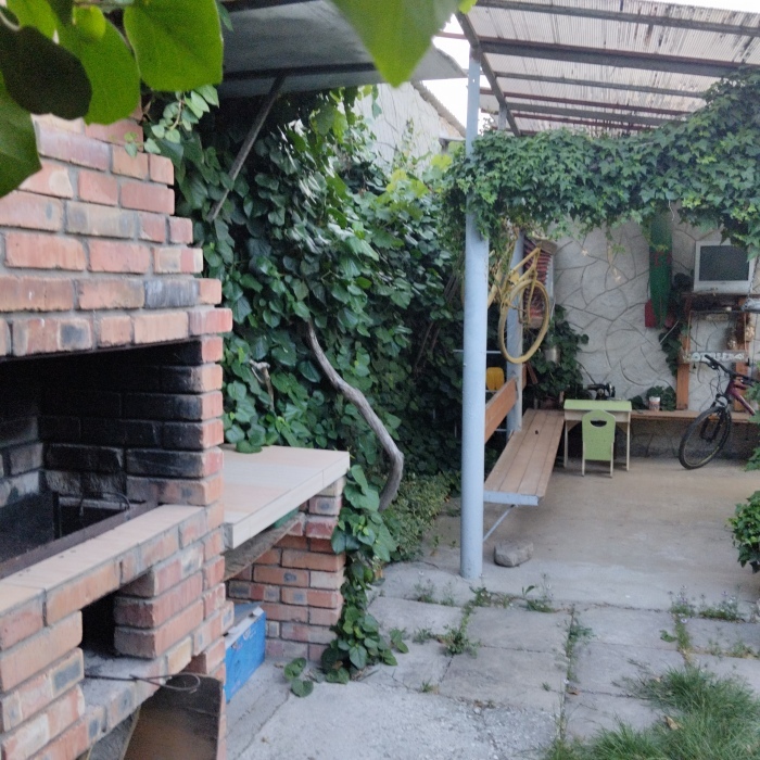 Во дворе зелено, растут цветы и плодовые деревья, имеется мангальная зона и беседка с телевизором. К услугам гостей оборудованная общая кухня с обеденной зоной. Для детей есть детская площадка.