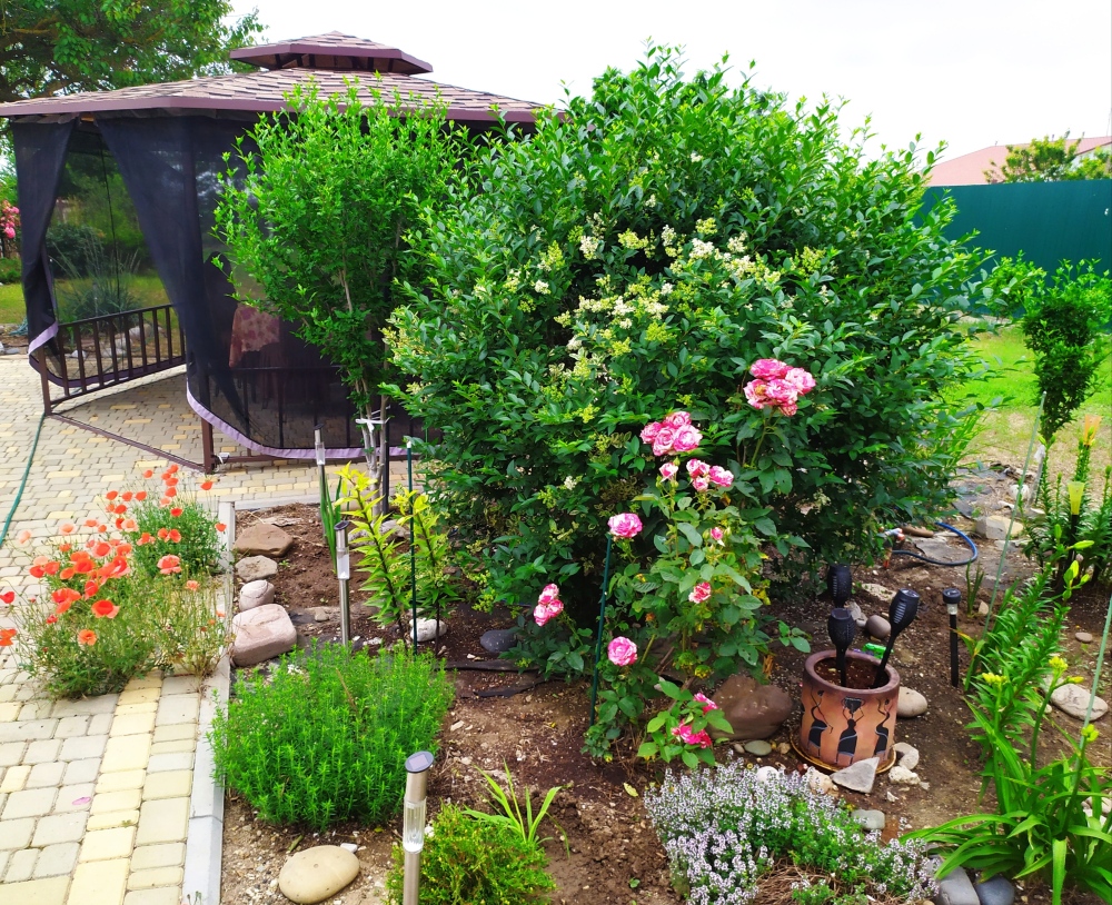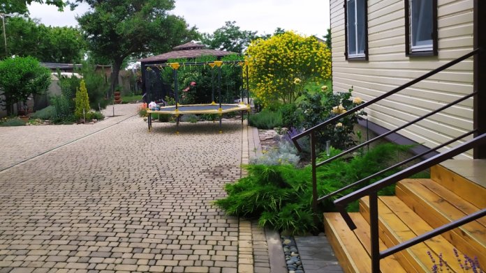 На большой, закрытой от постороннего взгляда территории разместились домики для наших гостей, лаунж и мангальная зоны, цветники, батут для детей, парковка.