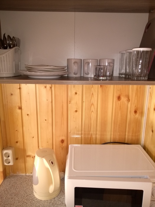 - мини-кухня (холодильник, электрочайник, микроволновая печь, посуда).