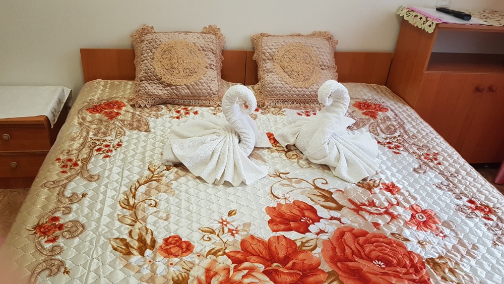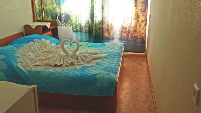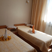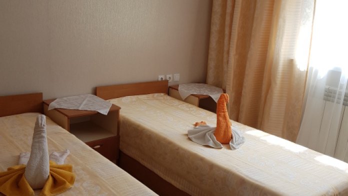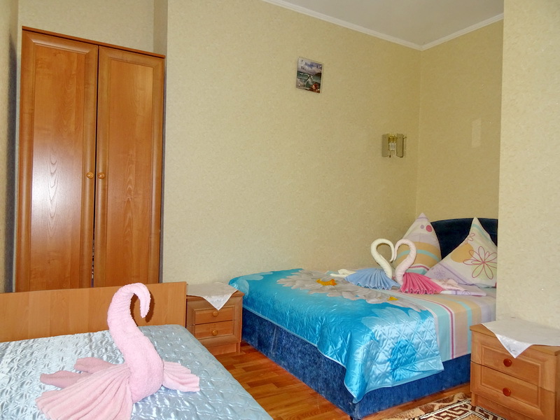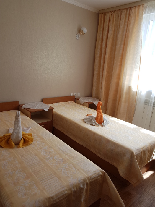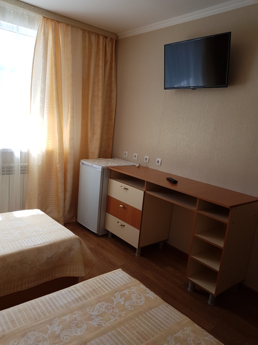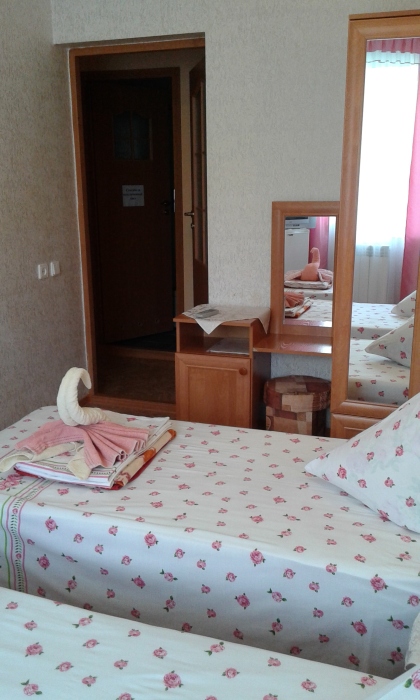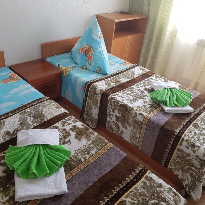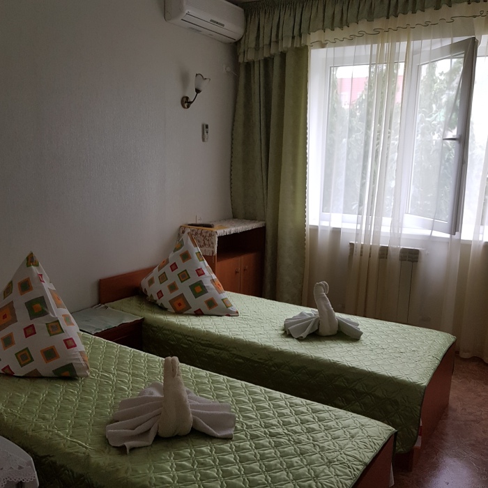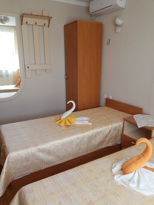 Номер на 2 этаже с отдельно стоящими кроватями, шириной 80 см, или семейная кровать 160 см шириной. Кондиционер, холодильник, кабельное т/в, интернет, постельное бельё, комплект полотенец. Туалетная и душевая кабина одна на три номера (туалетные принадлежности личной гигиены), дезинфекция проводится 3-4 раза в день. Гарантируется надёжность и охрана номера.