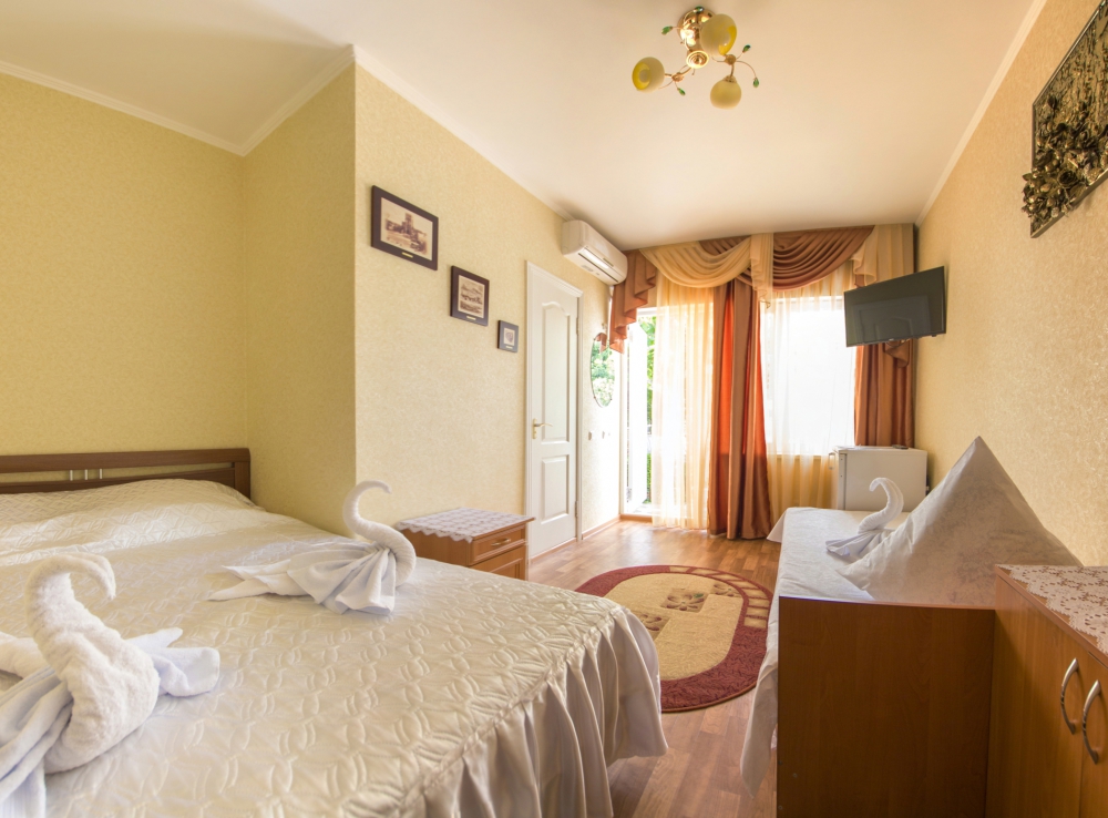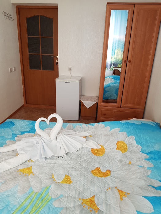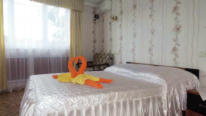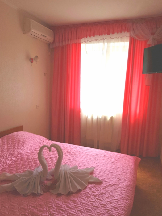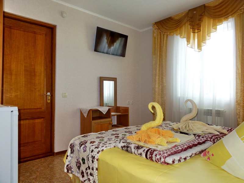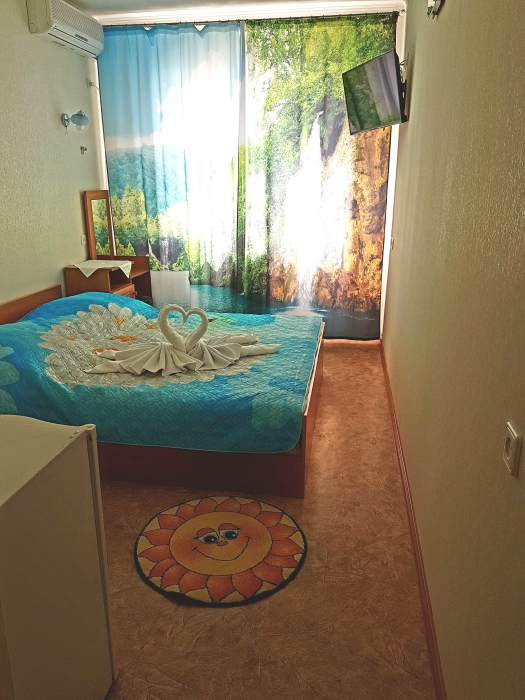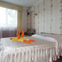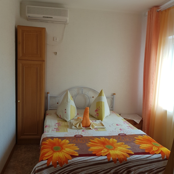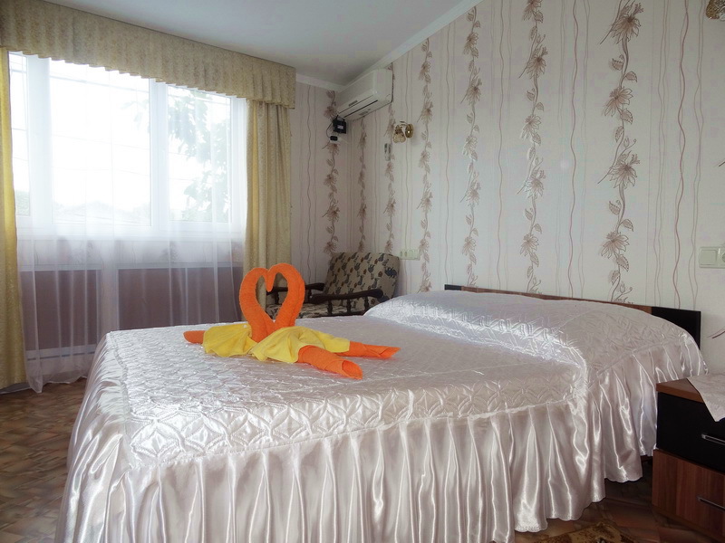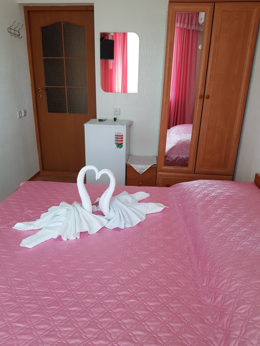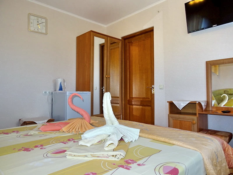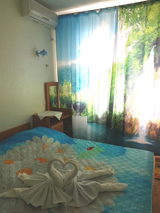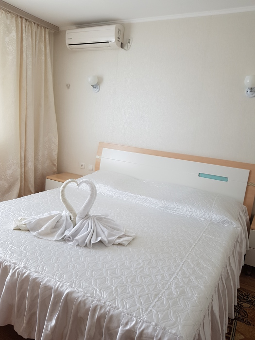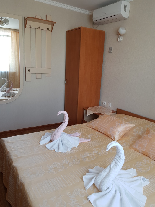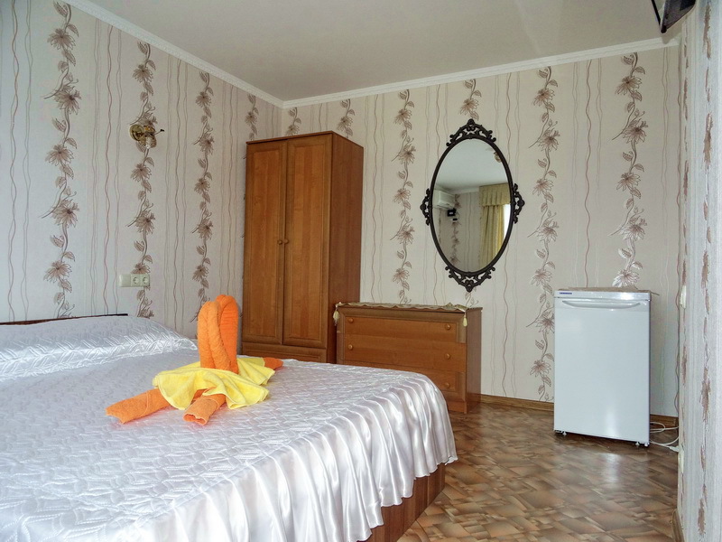 Номер 2-местный, балкон, столик, стулья, сушилка для белья. Номер оснащён: кровать семейная 160 см шириной, плательный шкаф, трельяж, зеркало прикроватные тумбочки, кондиционер, холодильник, кабельное т\в, интернет, пастельное бельё, комплект полотенец, фен. Горячая и холодная вода постоянно. Выдаются пляжные принадлежности (коврик, полотенце), гарантируется надёжность и охрана номера.
