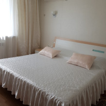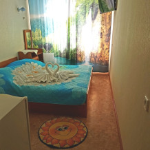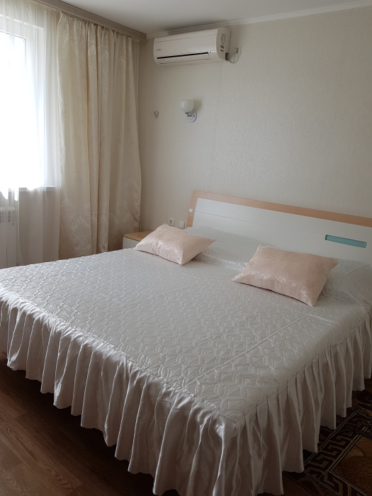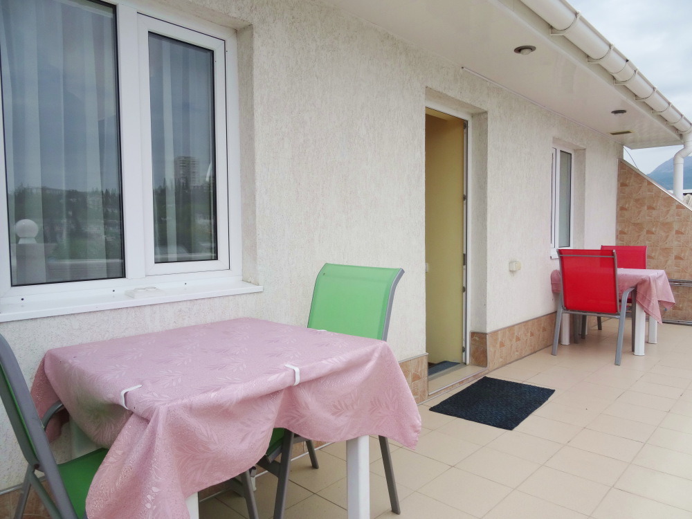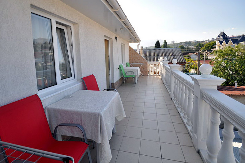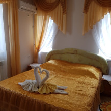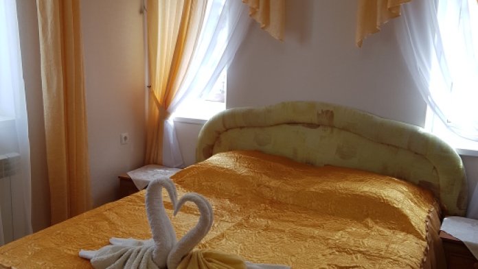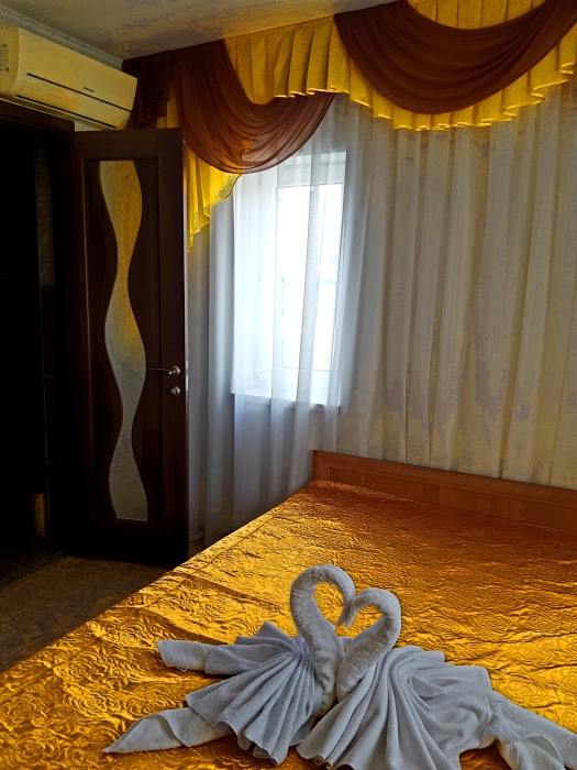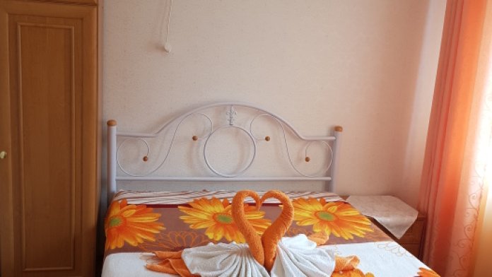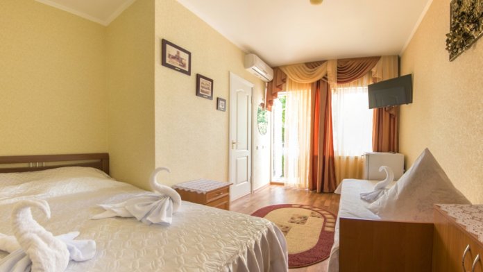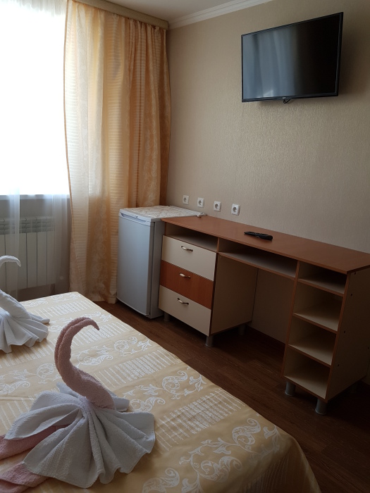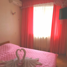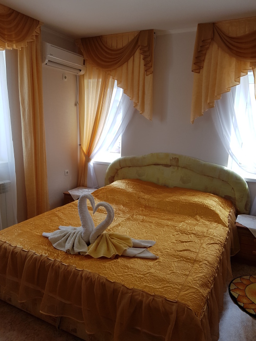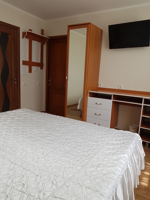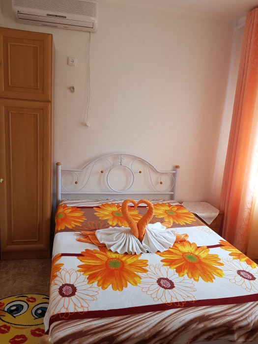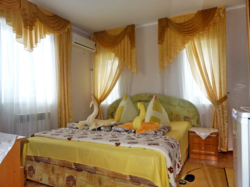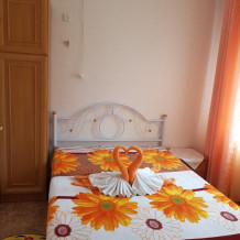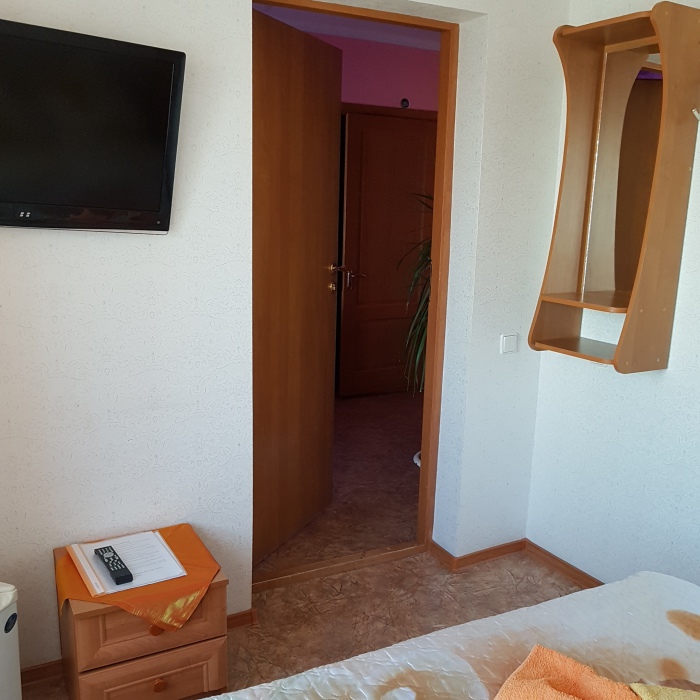 Номер 2-местный, балкон, столик, стулья, сушилка для белья. Номер оснащён: кровать семейная 160 см шириной, плательный шкаф, трельяж, зеркало прикроватные тумбочки, кондиционер, холодильник, кабельное т\в, интернет, пастельное бельё, комплект полотенец, фен. Горячая и холодная вода постоянно. Выдаются пляжные принадлежности (коврик, полотенце), гарантируется надёжность и охрана номера.