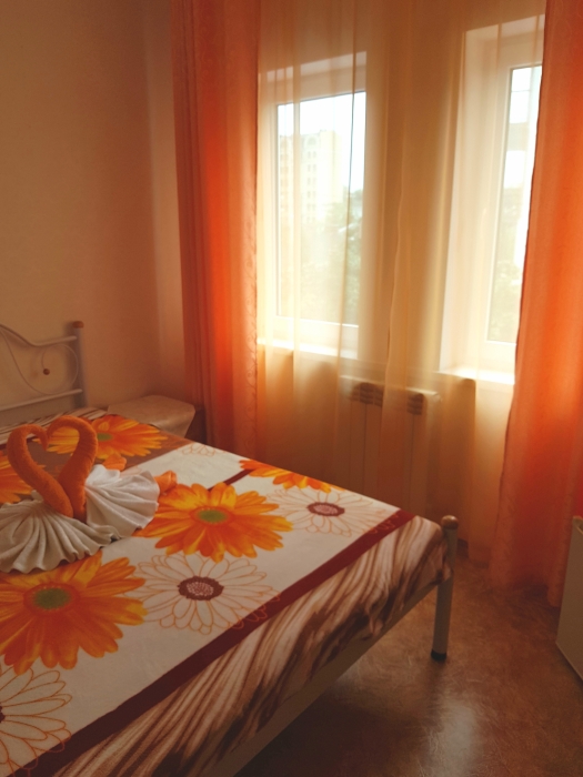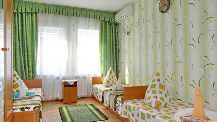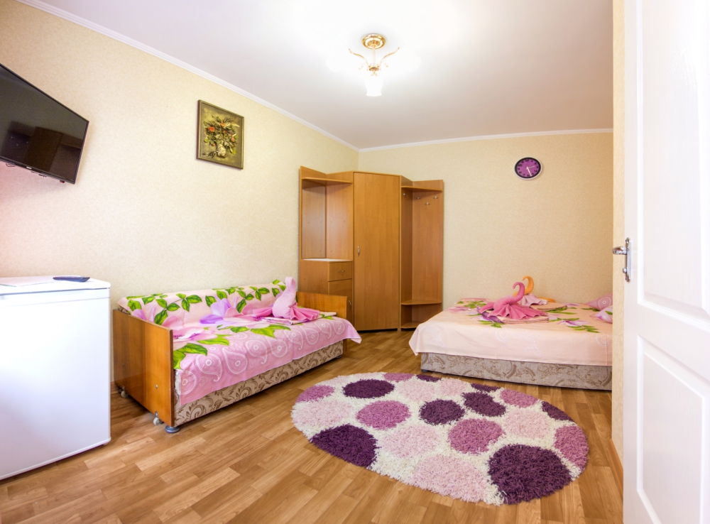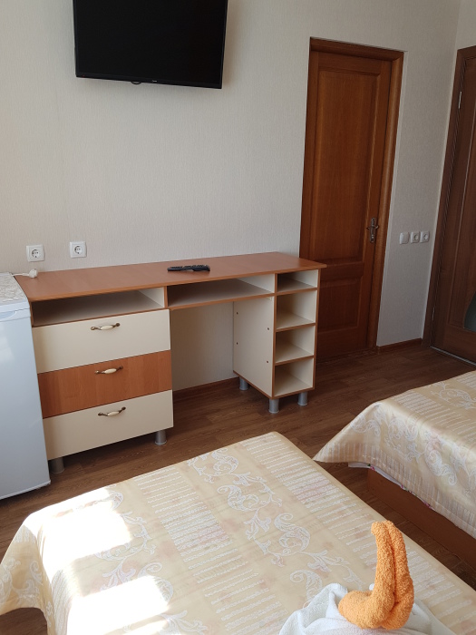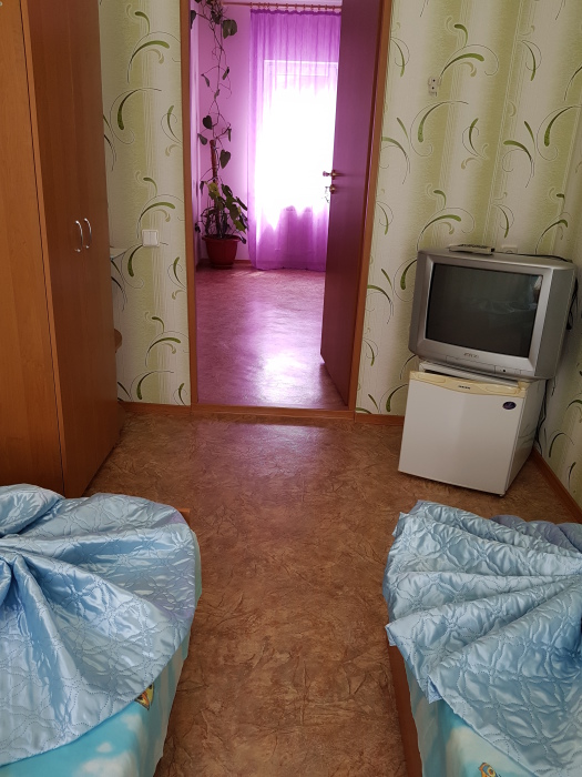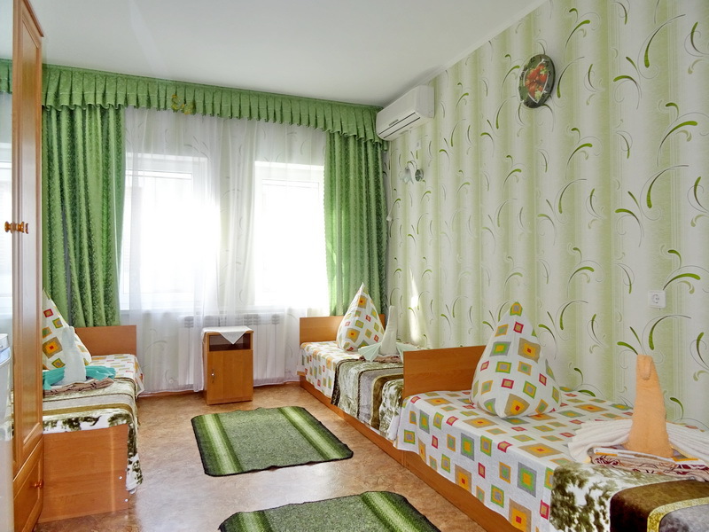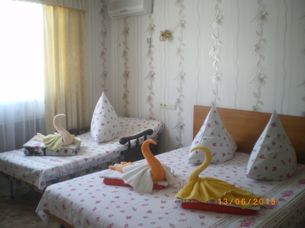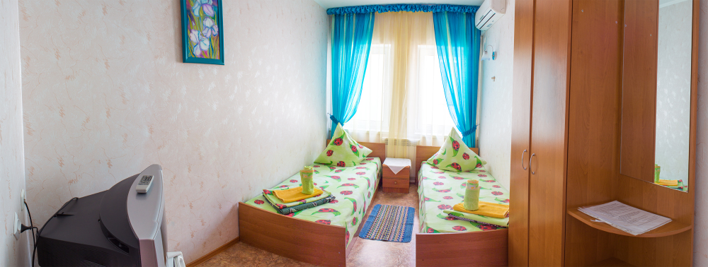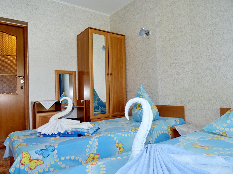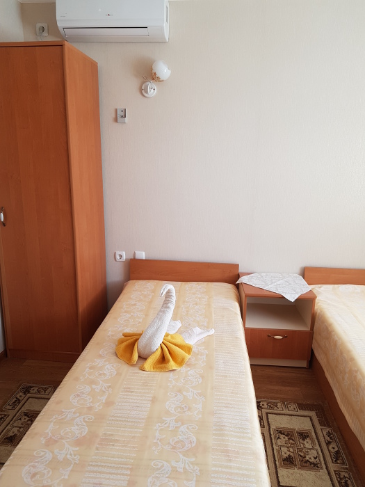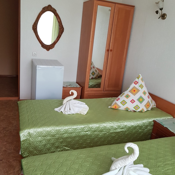 Номер оснащён: кровати раздельные, одноместные 80 см шириной, по желанию выставляем кровати (семейная и одноместная), плательный шкаф, прикроватные тумбочки, зеркало, кондиционер, холодильник, кабельное т\в, плазма, интернет, постельное бельё, комплект полотенец, фен. Туалетная и душевая кабина одна на три номера (туалетные принадлежности личной гигиены прилагаются), дезинфекция проводится 3-4 раза в день. Гарантируется надёжность и охрана номера. Выдаются пляжные принадлежности.